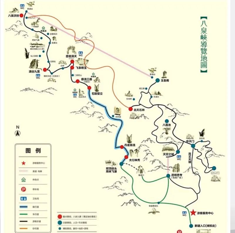 - 下午:乘坐缆车或徒步登山,沿着山顶步道欣赏八泉峡的全景,从高处俯瞰连绵的山脉和碧绿的湖水,最后乘坐高空电梯下山。游览结束后,前往预订酒店办理入住并稍作休息。