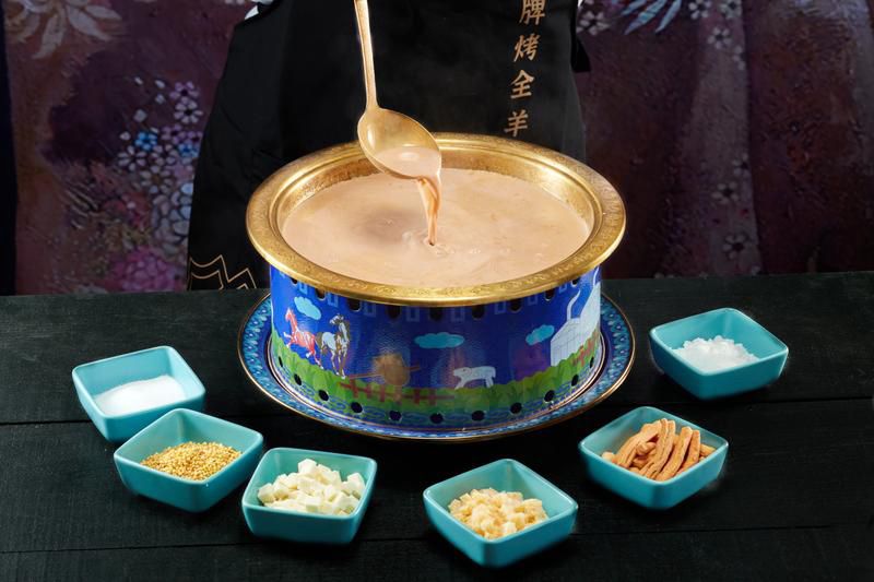 烤全羊:这是草原盛宴的招牌,整只羊架在#呼和浩特市旅游# :用青砖茶、鲜奶和盐熬制而成,味道浓郁,可以搭配炒米、奶皮子、黄油,再泡上羊肉干或果条。