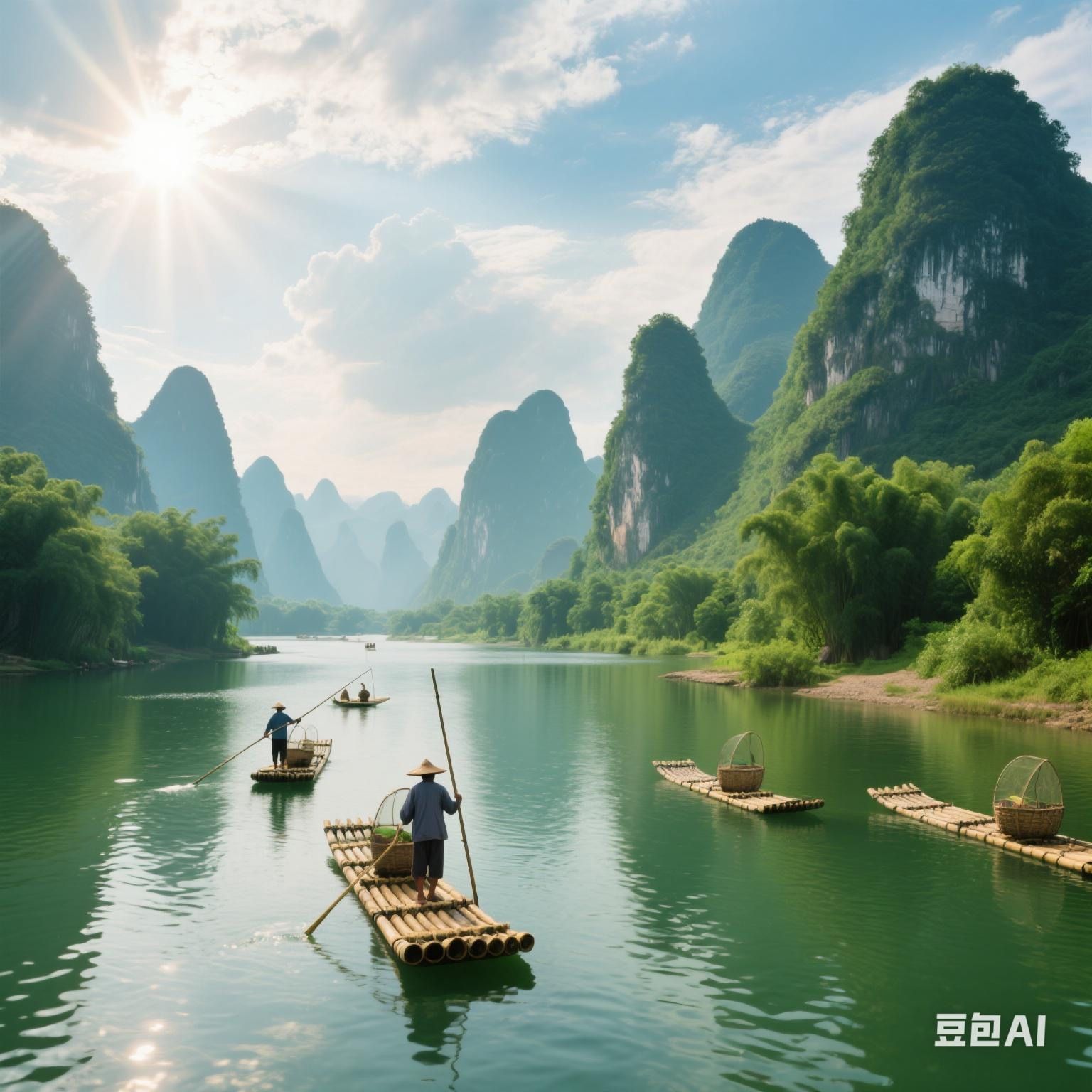 上午:乘坐漓江竹筏(杨堤-兴坪段),欣赏漓江两岸如画的山水风光,途中可以看到九马画山、20元人民币背景打卡点等著名景点。