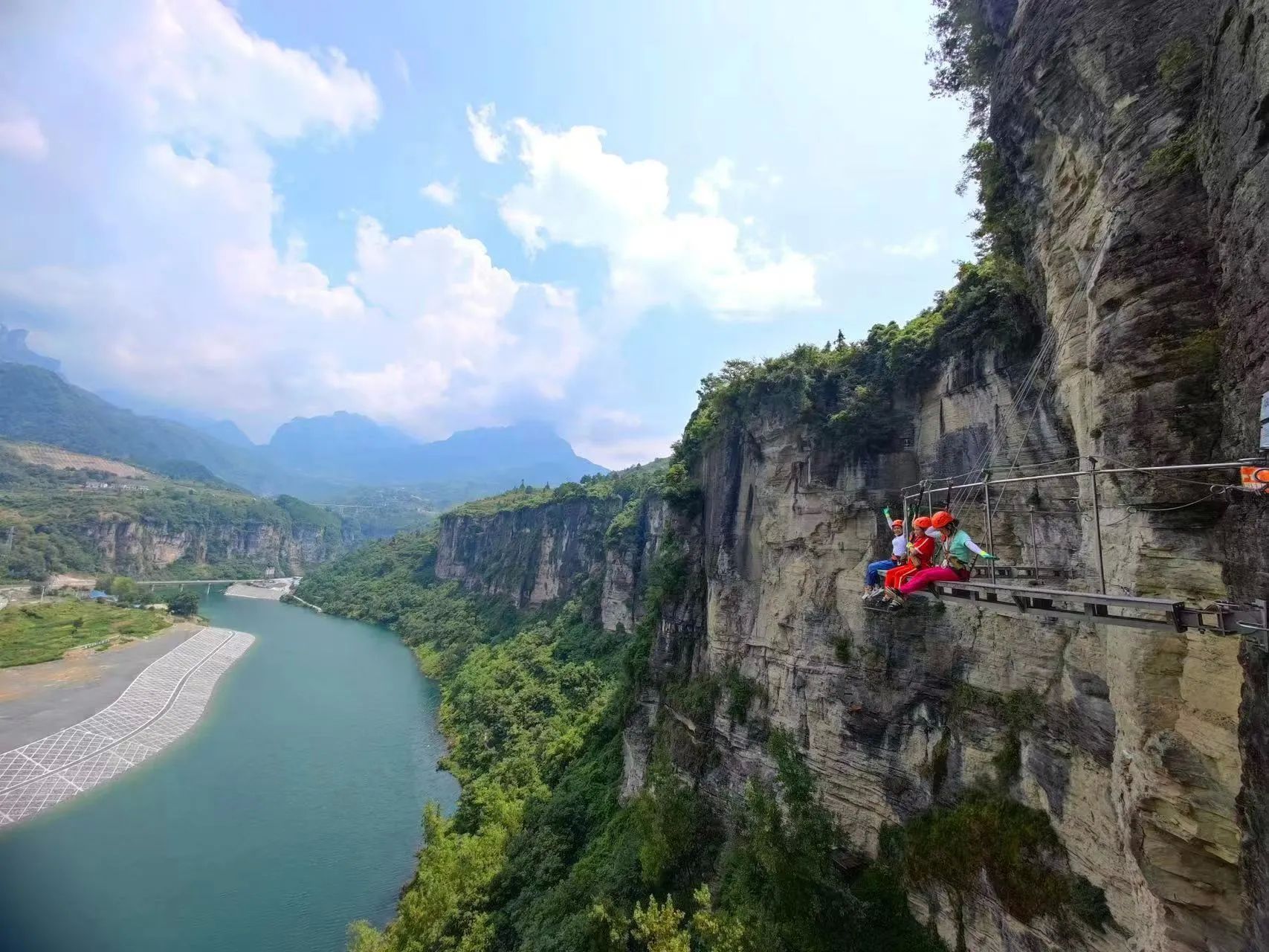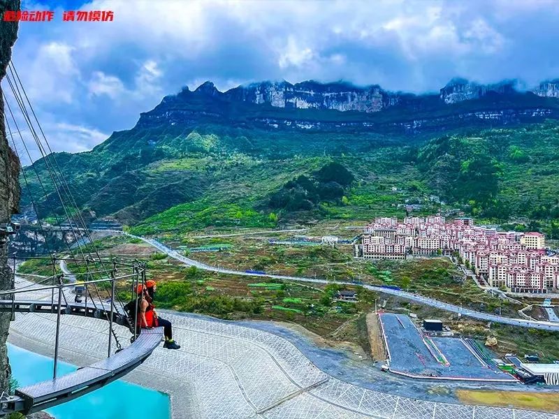 天梯⻜侠线为高级道,全⻓ 350 ⽶,距湖⾯⾼ 200⽶,特⾊包含 80 ⽶的⽹红天梯(219 级台阶)、40 ⽶⾼空⽹桥、悬崖咖啡、溜⻜机以及垂直速降等刺激项⽬。更有中级道及初级道(亲子初级体验道)。攀爬过程中,对面是错落有致的头渡集镇,脚下是悬崖峭壁,劲风时时擦身而过,那种惊险刺激,绝对让你心跳飙升!