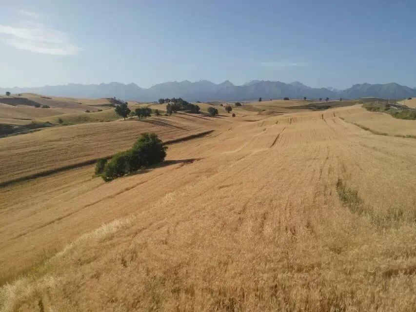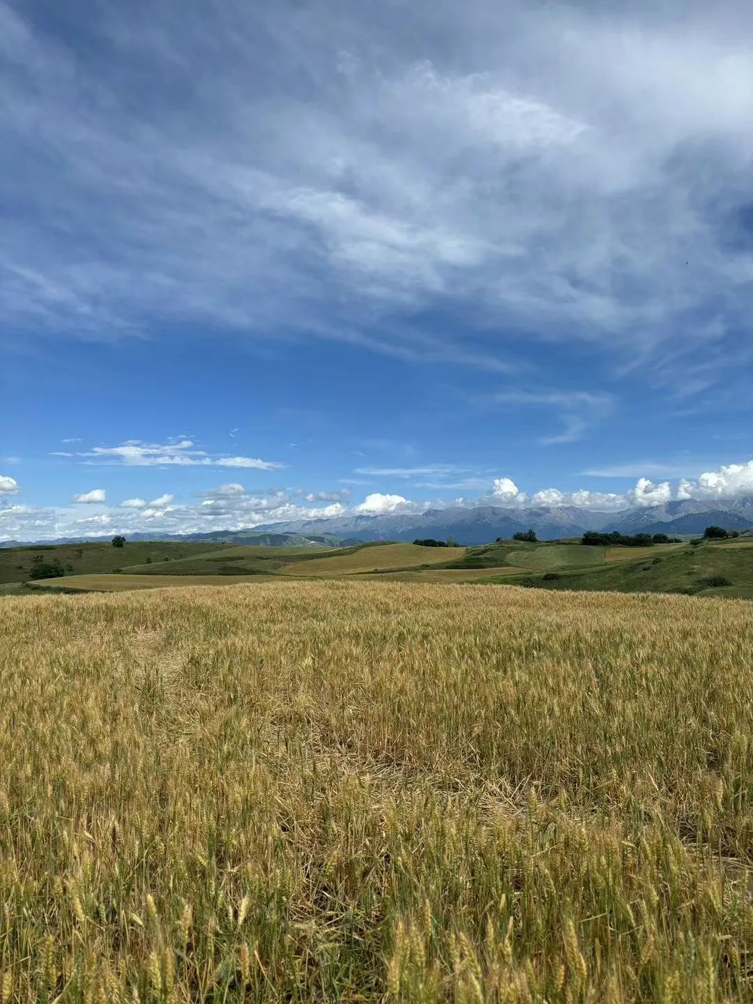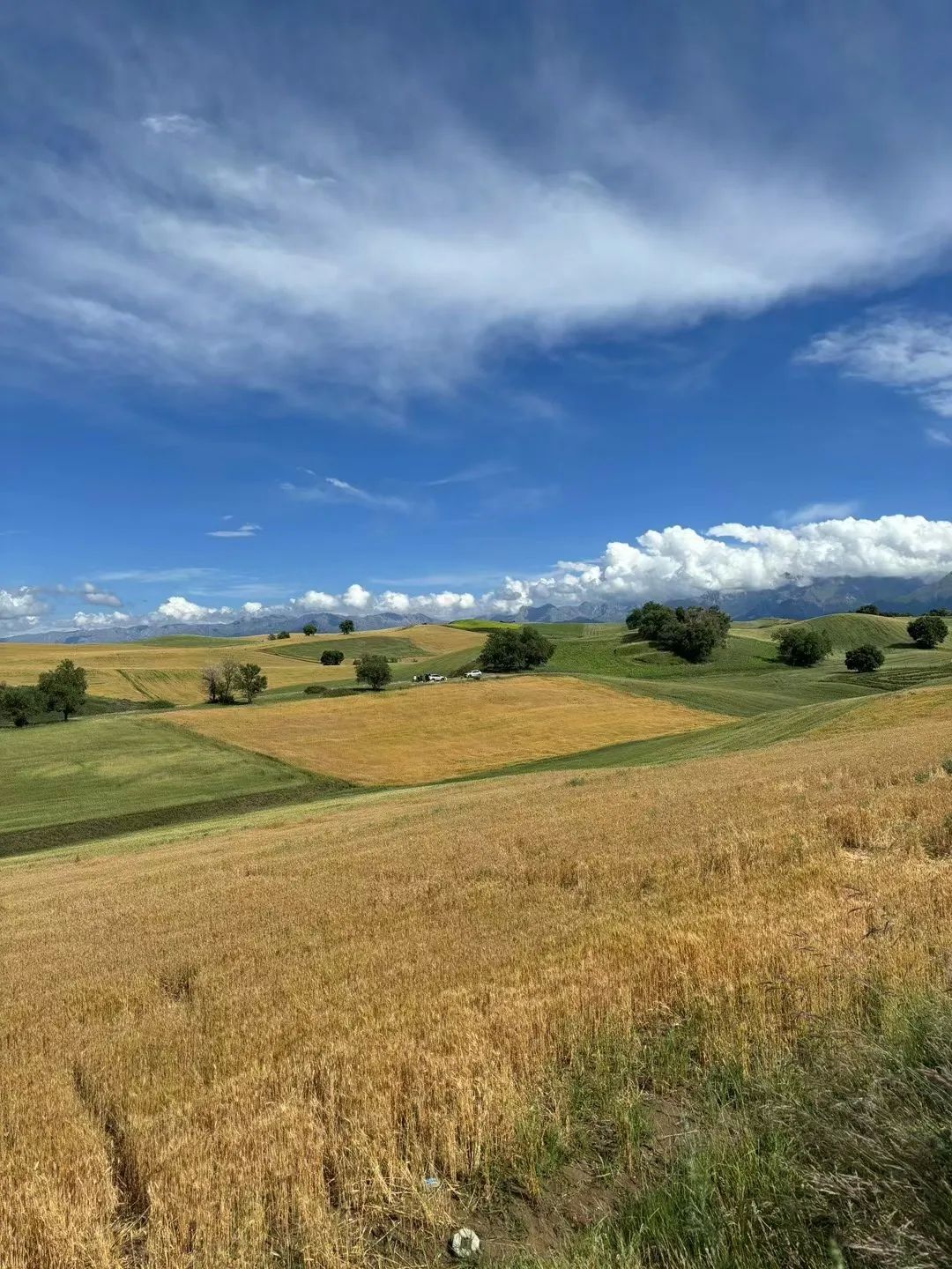 江布拉克拥有世界罕见的"高山旱作麦田",夏季万亩麦田随山势起伏,宛如金色波浪,与雪山、森林相映成趣,形成独特的农业景观。秋季麦收后,麦茬形成的几何线条更是摄影爱好者的天堂。