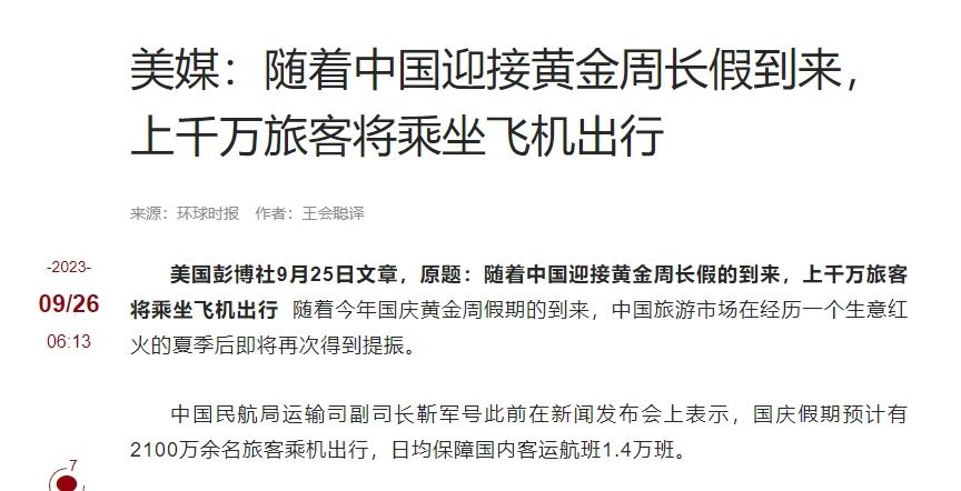 即将到来的双节假期,不仅备受国内关注,连外媒也注意到了这一现象。美国彭博社就率先酸了,表示中国黄金周将有2100万人乘坐飞机出行,相当于澳大利亚所有人口都坐了一回飞机,但这消费者更喜欢前往偏远的中国目的地。在它看来,这正是中国消费复苏的真实写照,意味着中国旅游市场将再次得到提振。