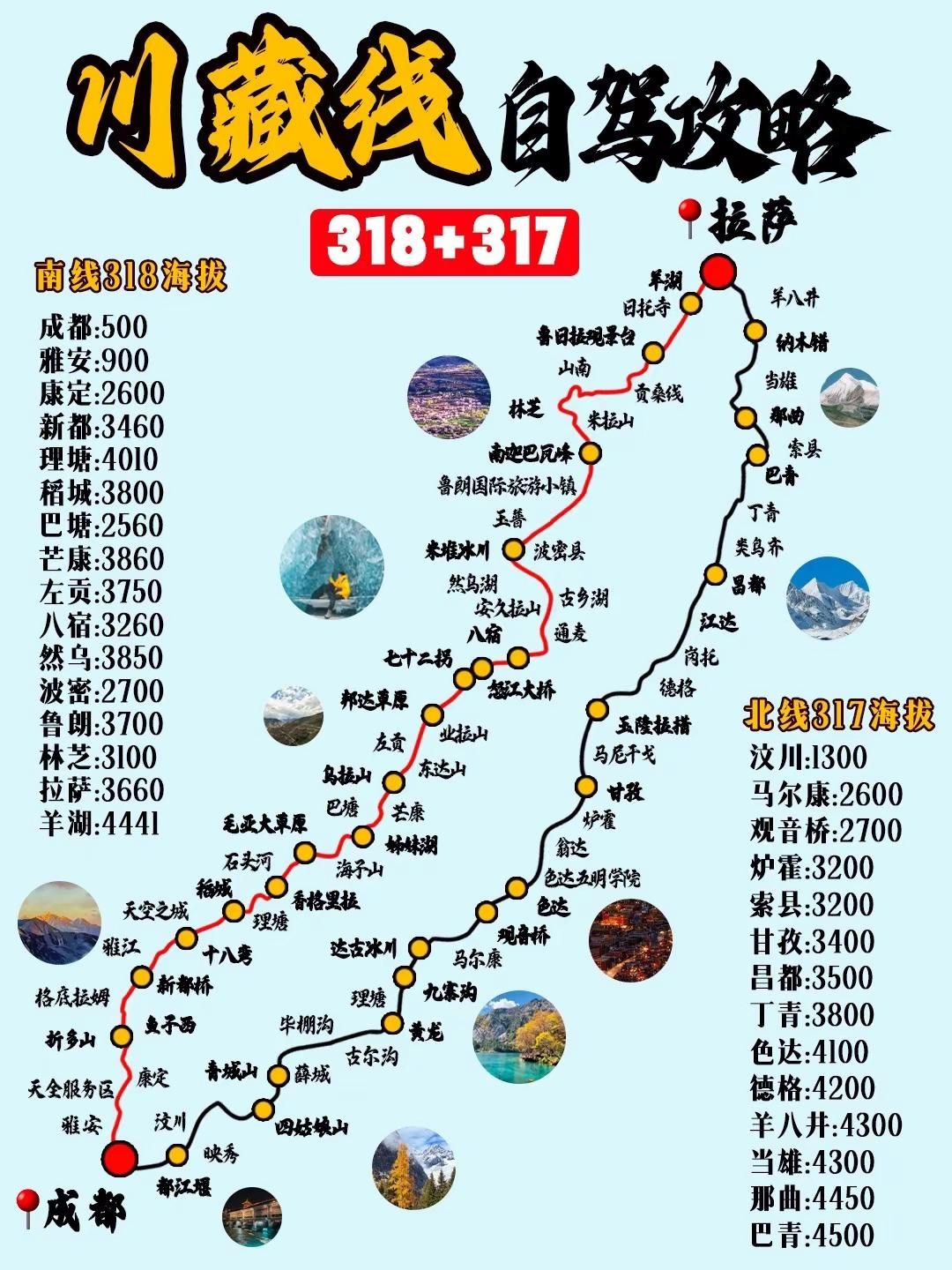 川藏线318+317自驾攻略组队中此生必驾318!人生是旷野,路在脚下,川藏线318+317自驾攻略,要去的姐妹码住啦~---出行方式拼车跟团用旅行社的车开自己的车跟团私人定制----318川藏线自驾游行程安排:Day1: 成都>天全服务区>康定>折多山>鱼子西/格底拉姆>新都桥镇Day2: 新都桥镇>雅江>十八弯>天空之城>理塘>稻城>香格里拉镇Day3: 亚丁一日游&自y行Day4: 香格里拉镇>石头河>海子山>毛亚大草原>姊妹湖>巴塘>芒康Day5: 芒康>乌拉山>东达山>左贡>邦达草原>业拉山>七十二拐>怒江大桥>八宿Day6: 八宿>安久拉山>然乌湖>米堆冰川或朗秋冰川>玉普>波密县Day7: 波密县>古乡湖>通麦>鲁朗国际旅游小镇>色季拉山/南迦巴瓦峰>林芝Day8: 林芝>林拉高速>(巴松措或思金拉措)>米拉山>贡桑线>山南(或直达拉萨)Day9: 山南>(S202)>张达乡>鲁日拉观景台>日托寺>羊湖>拉萨Day10: 拉萨自y行[一日游],博物馆/布达拉宫---路线行程大曝光!从成都出发,雪山、峡谷美不胜收,步步如画!深入藏区,体验藏族文化,品尝藏式美食,感受民俗风情!自驾随心,想停就停,美景全收!---跟团出行超棒!同龄人组队,结识各地朋友,旅行超有意义!住宿安排好,告别攻略烦恼!专业领队带路,吃喝玩乐嗨不停!随停随玩,不赶路,用心感受!---想了解 318 川藏线跟团详情与费用,点左下角 <立即咨询>,出发! #川藏318 #川藏线自驾游 #川藏线与川西线旅游包拼车自由行 #川藏线旅行