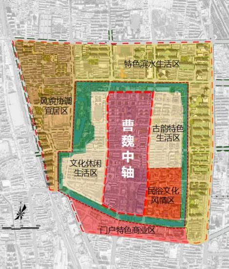 - 一轴:以春秋楼、曹丞相府等历史文化遗址为核心,形成贯穿南北1.3公里长的曹魏中轴,由南至北分为关圣春秋、文达天下、魏武英豪、铜雀花苑四大旅游文化板块,规划设计了忠义广场等18个景观节点。