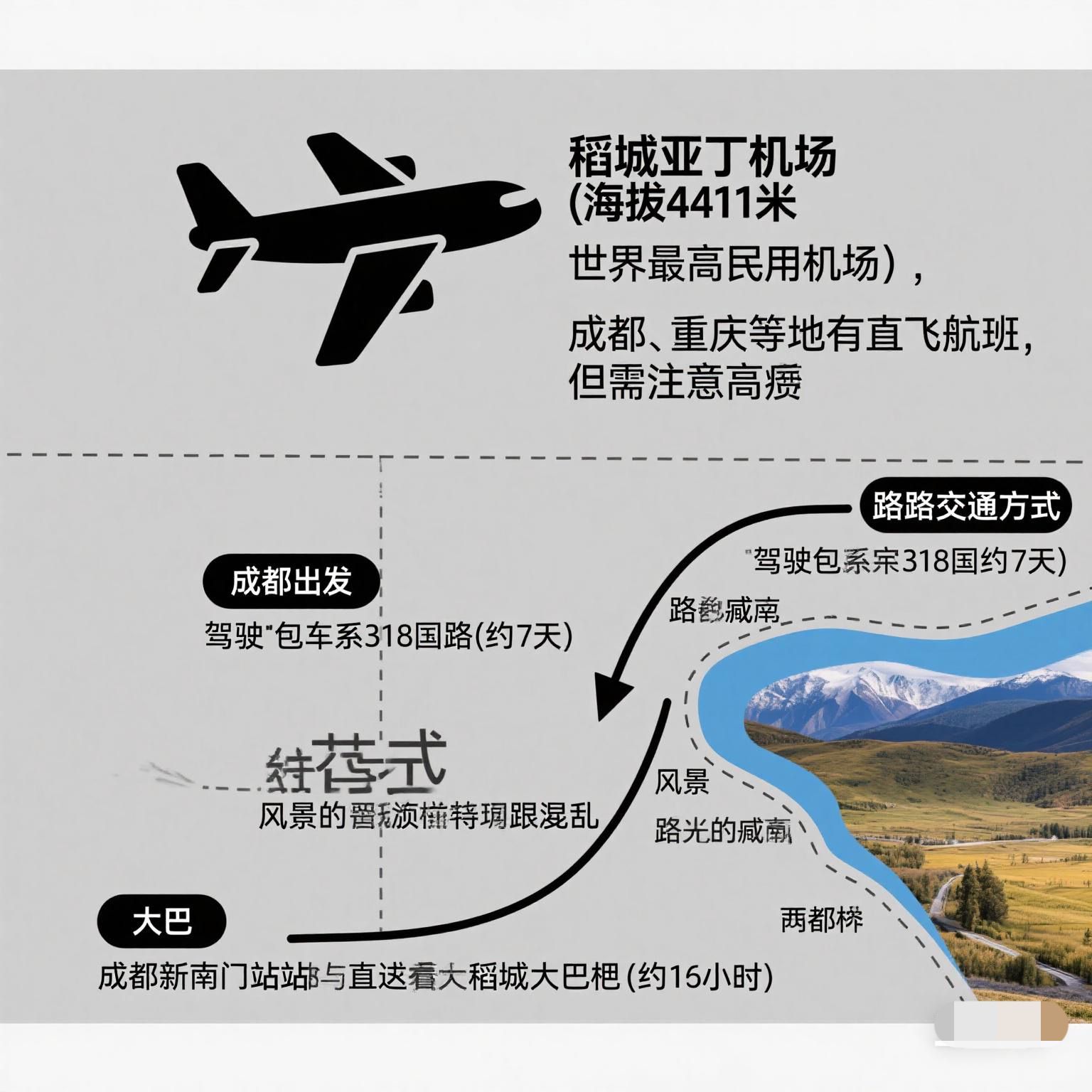 - 飞机:稻城亚丁机场(海拔4411米,世界最高民用机场),成都、重庆等地有直飞航班,但需注意高反。