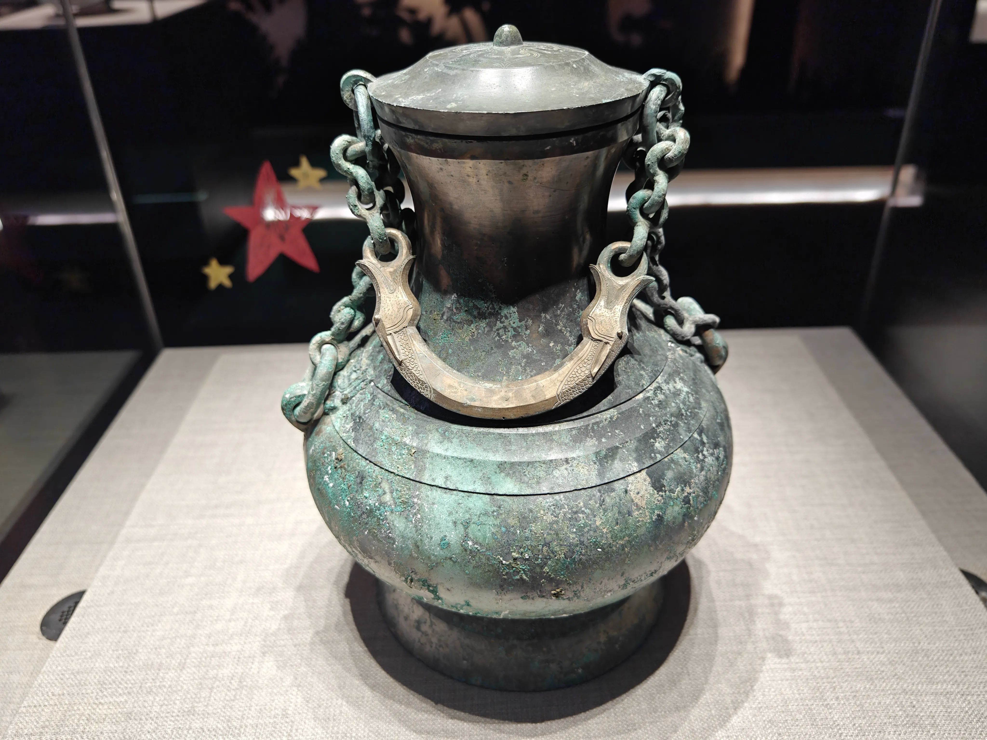 个旧市博物馆就在金湖附近,博物馆不大,可以轻松地了解博物馆的藏品:来自汉代的几件青铜镇馆之宝:孔雀灯、三枝俑灯、提梁壶、承璇。如果它们收藏在中国国家博物馆里,也许就湮没在众多国宝珍品里,难以让我注意到,更不要说细细打量、慢慢欣赏了。当然,个旧博物馆也做得很好,在玻璃展示橱窗上部,用视频再加以详细的介绍,使“死”的文物鲜活了起来,完全没有参观大博物馆时常常会有的疲惫不堪、应接不暇之感。