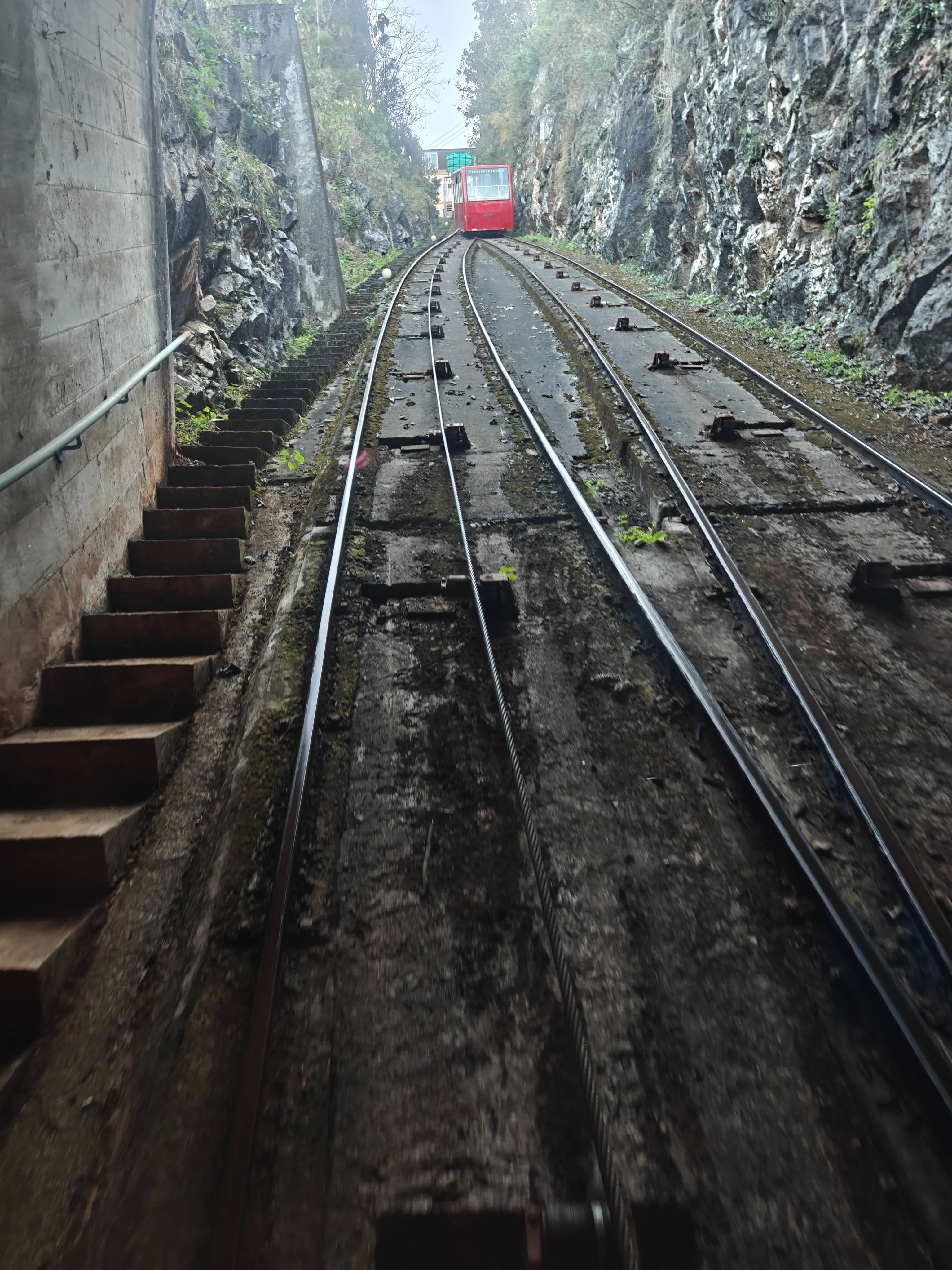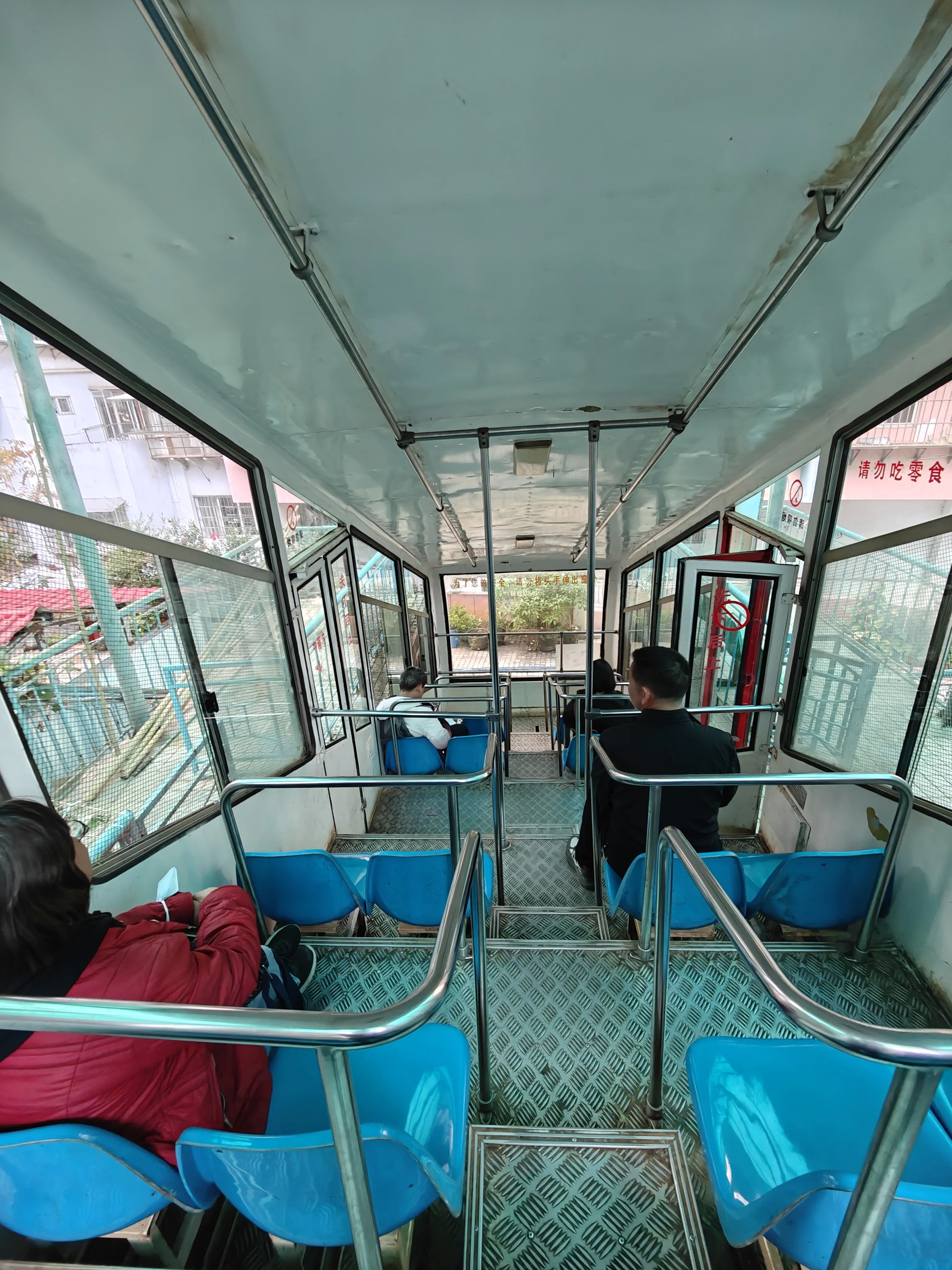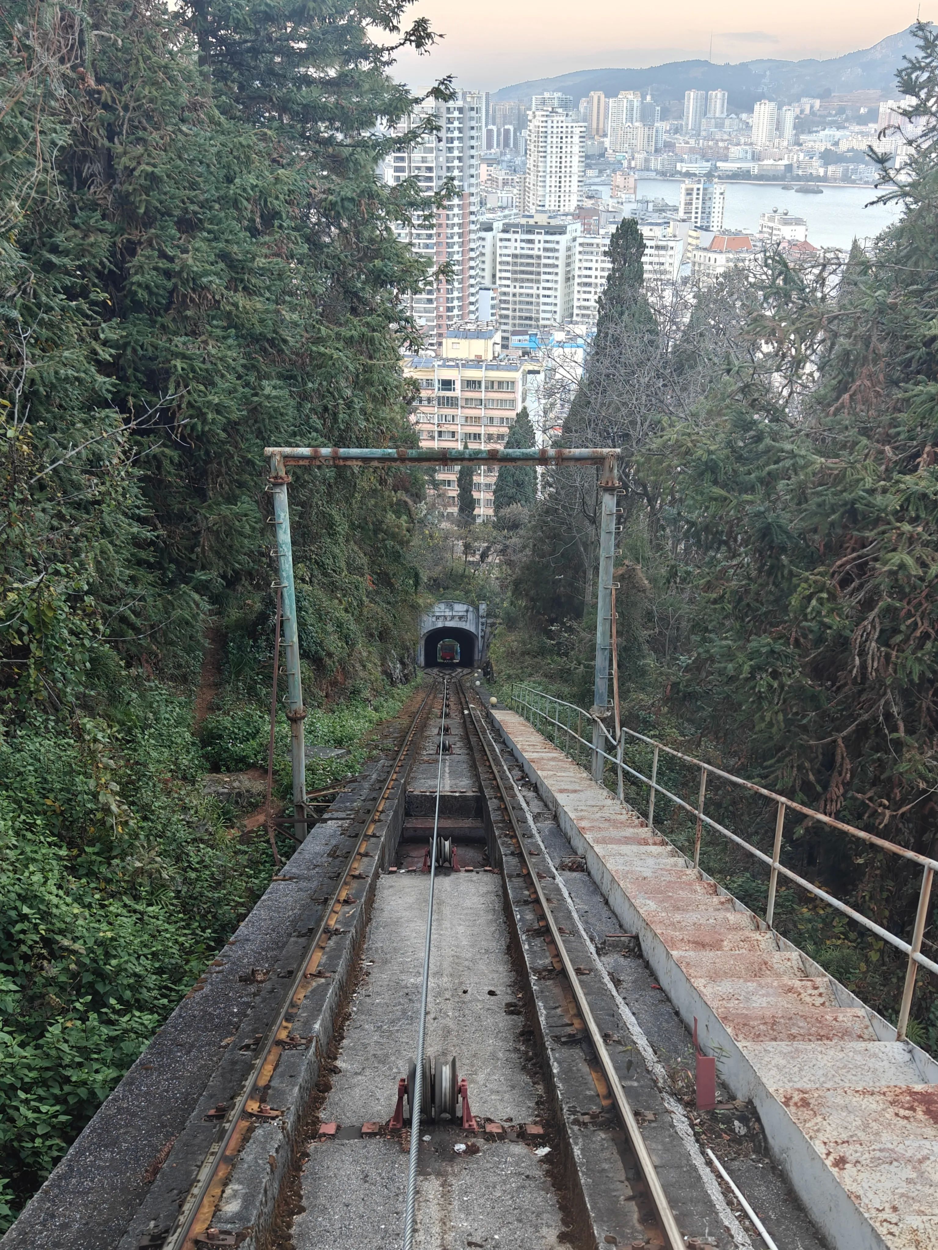 金湖一带地势平坦,不过老阴山脚下却有点山城的味道,新视野售楼中心旁边还设有一元一次的地轨缆车。缆车空间不小,大概有20个座位,每10分钟发一班,坐缆车的大都是居住在半山“新视野”高楼小区里的人。有趣的是,上下行的缆车要同时发车,在中段有段环形的轨道错车。我觉得坐下行缆车时更有意思一点,可以更好地俯瞰个旧城区的景色。