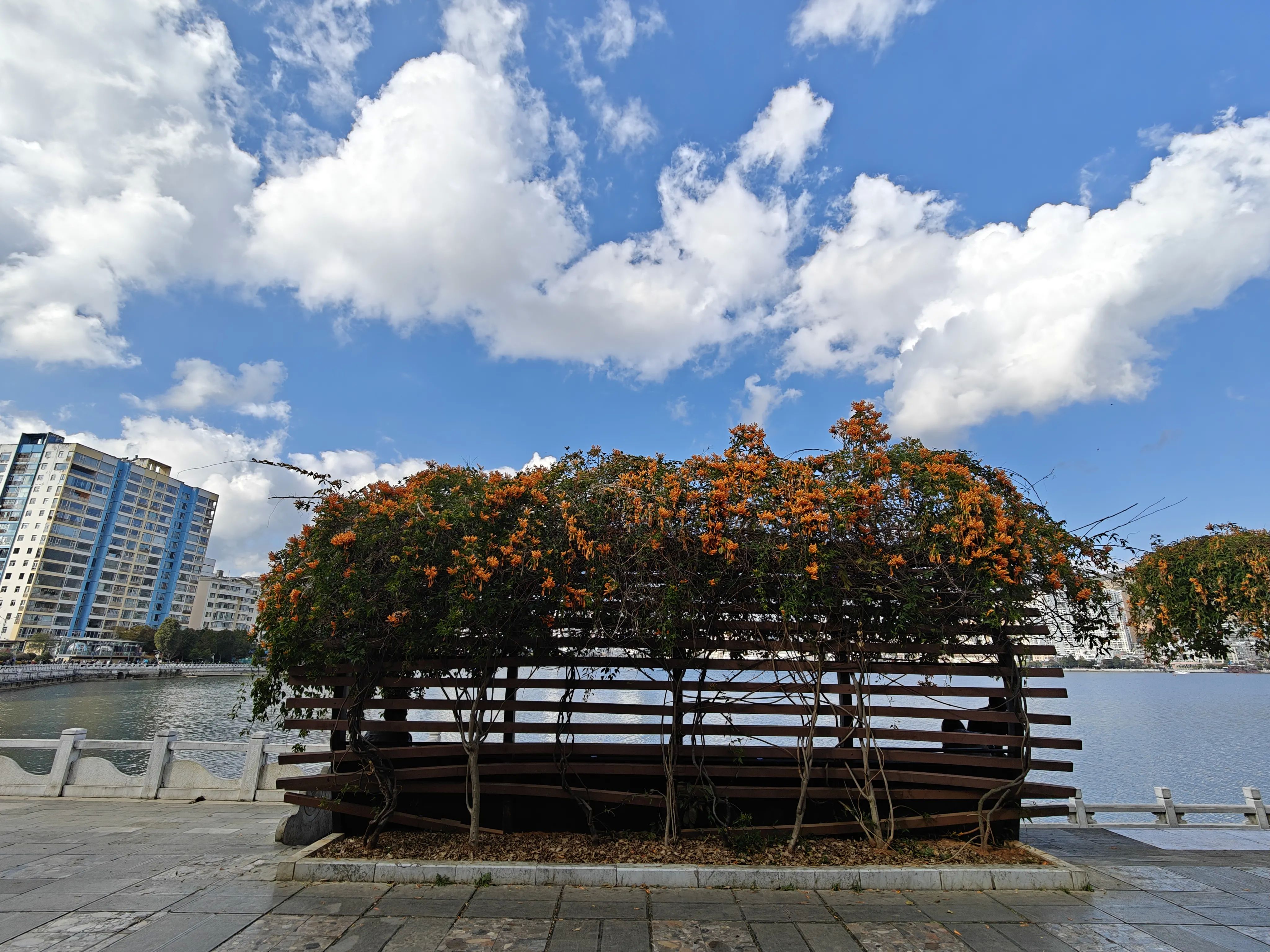 图4、6. 金湖的蓝天白云,还有湖边的炮仗花。