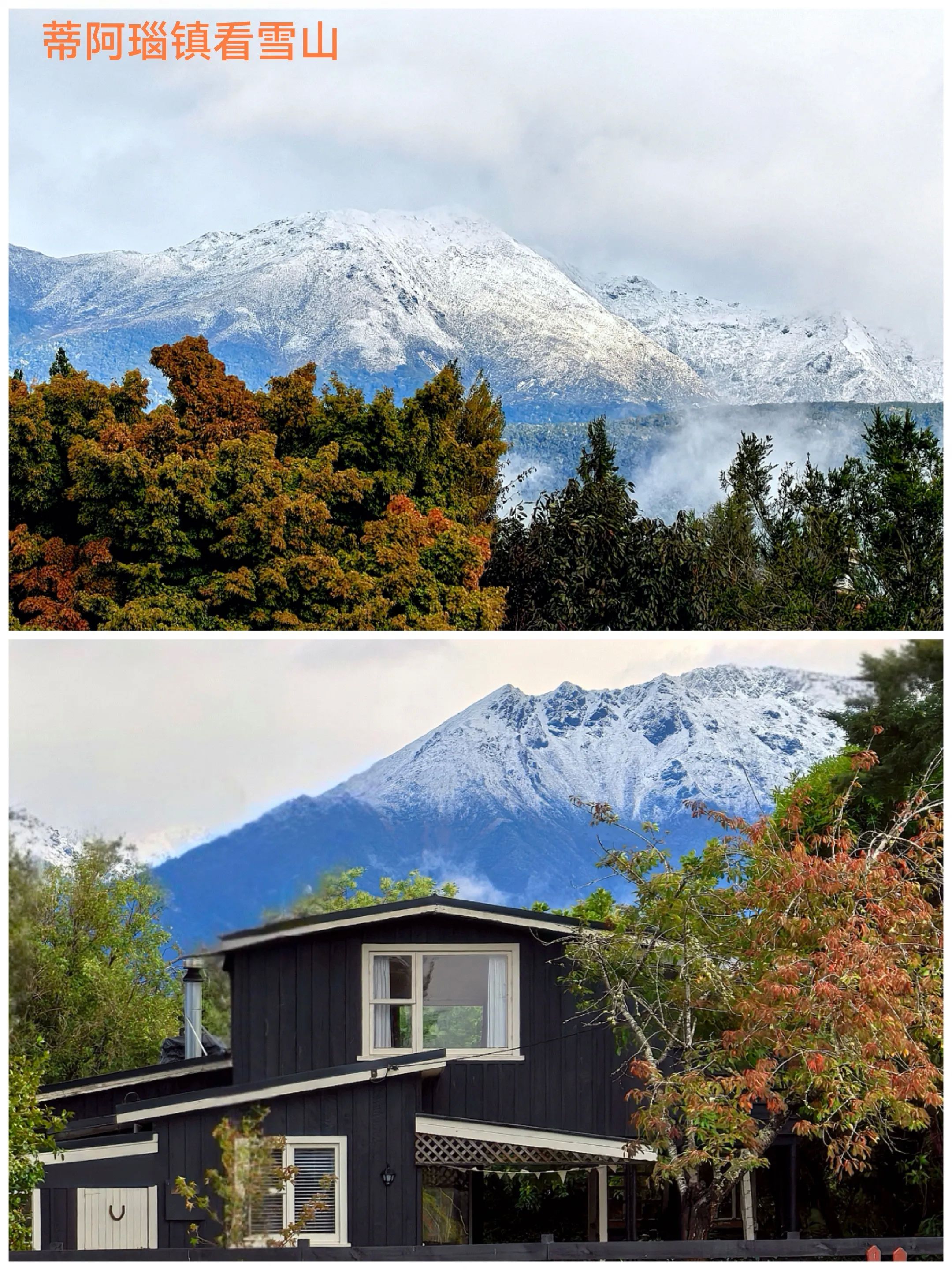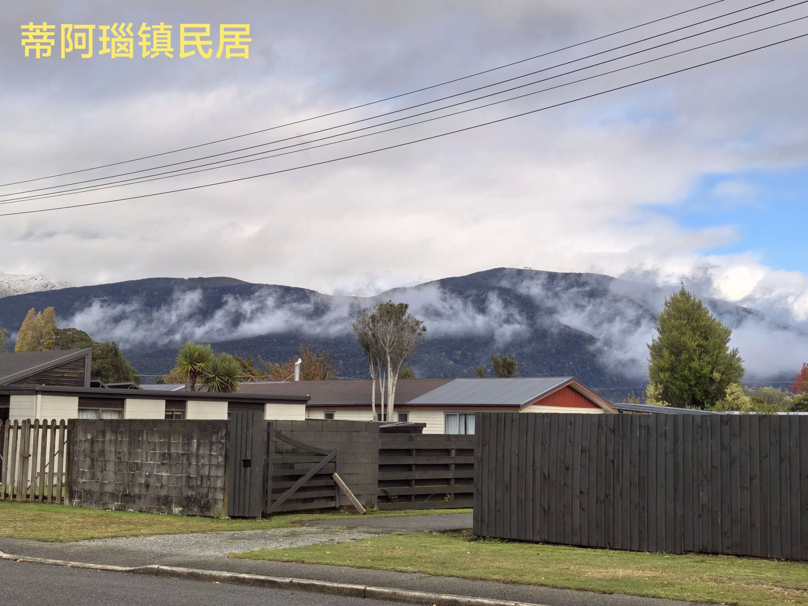 中途停车休息了三次。其中在蒂阿瑙小镇停留了半个小时,能喝点咖啡、买点旅游纪念品。我没去逛商店,就在街上溜达了一圈。这个小镇的风景真美,民居后的雪山云雾缭绕,就像仙境一般。