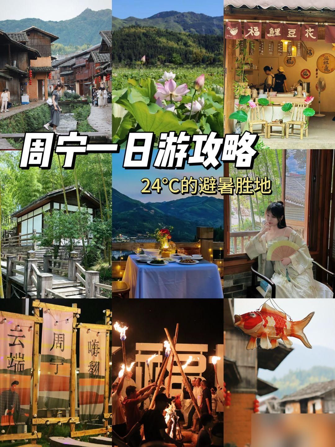 早上出发周宁鲤鱼溪公园,入园后先去了荷花池欣赏荷花,鲤鱼溪的荷花很出名,太出片了,好漂亮呀(拍荷花一定要早上哦~)——中午吃了当地的特色小吃(推荐炒乌蛋粿,就是土豆,周宁土豆特别好吃)——看当地的民俗鲤鱼祭(每周六下午),鲤鱼是当地的神明,给逝去的鲤鱼办葬礼!——之后去了福鲤豆花,一家温馨的小店,豆花很好吃,店铺门口也很好拍,好出片呢!——文创园,里面有很多活动,我选择做了非遗的漆扇制作体验,非常有意思~文创园里的周宁文化周边都好可爱,买了好多冰箱贴回去送朋友——晚上去营地玩,和朋友一起吃了烤肉,一起跳篝火晚会——最后美美的喷泉灯光秀!