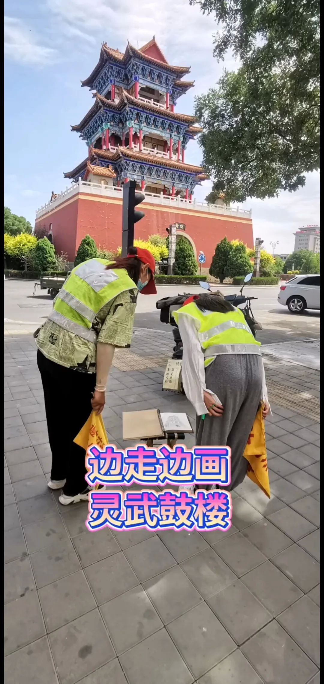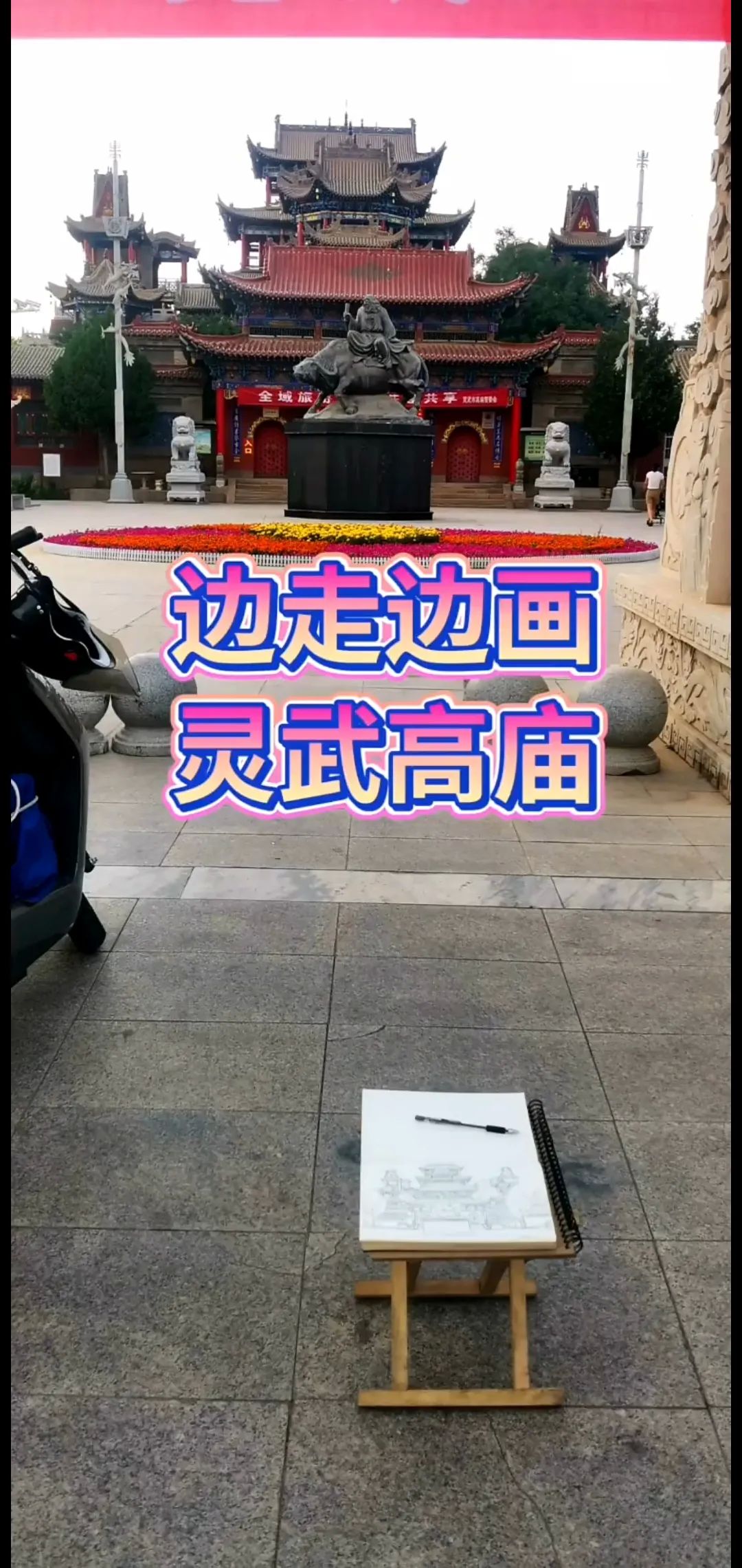 继续前行,我又看到了高庙。这座高庙非常大,而且非常漂亮,让我兴奋不已。我停下电瓶车,用画笔记录下了这座美丽的建筑。在我画画的时候,当地的人过来观看,他们不断夸赞我画得好,并给我讲述了许多灵武市的人文风情和历史文化。原来,这里有很多古建筑,除了高庙、鼓楼和城楼,还有东塔。