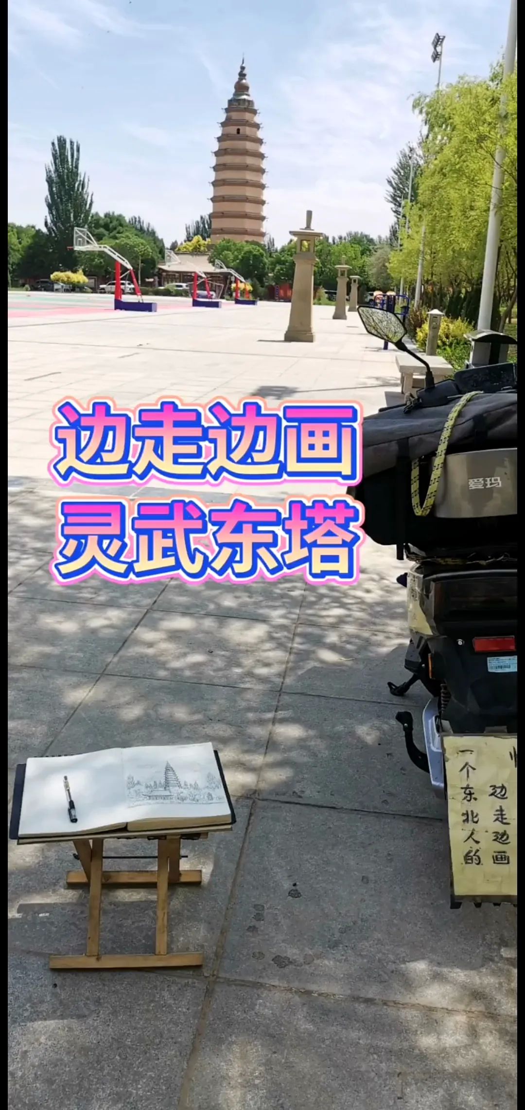 东塔距离这里有将近两公里,但我有电瓶车,所以很快就骑到了。东塔也是一座非常漂亮的塔,我当然不能错过,于是又停下来用画笔记录下了它的美丽。记录完东塔后,我继续在灵武市转了转。当地人告诉我,西湖公园也很漂亮,于是我又骑着电瓶车去了那里。果然,西湖公园风景如画,周围都是古建筑,让我仿佛置身于古代的园林之中。我在这里拍照留念,留下了美好的回忆。
