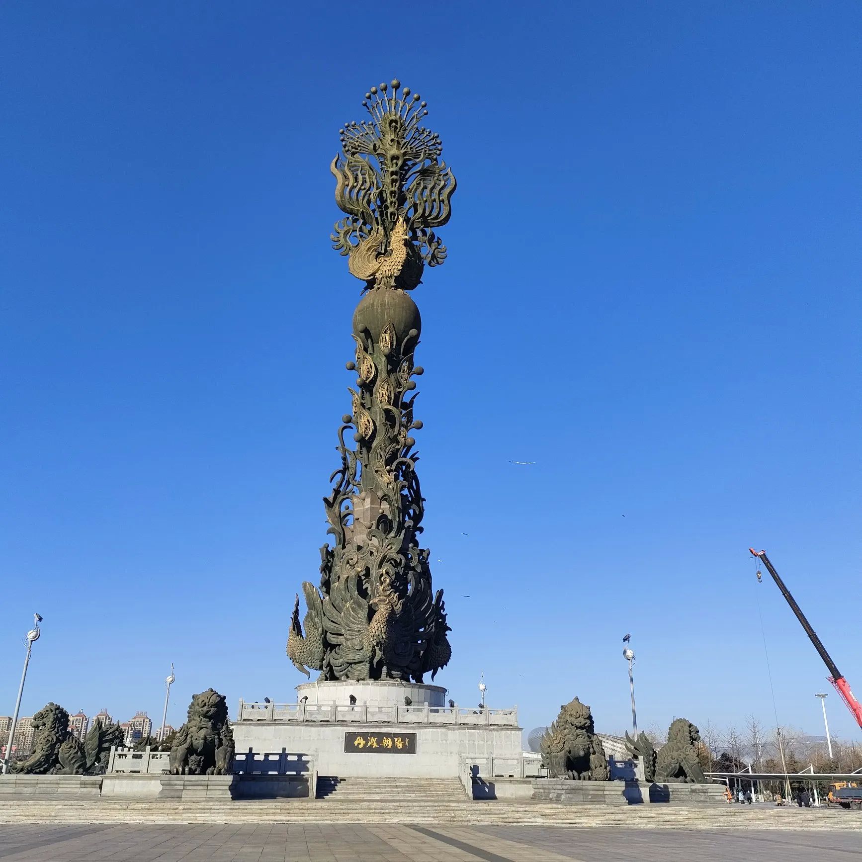 按照游览顺序,先观赏了丹凤朝阳景观。丹凤朝阳雕塑高68米,总重447吨,是由工艺美术大师韩美林先生设计,名称取自《诗经﹒大雅﹒卷阿》中的“凤凰鸣矣,于彼高岗。梧桐生矣,于彼朝阳。”凤凰既是唐山这座浴火重生的英雄城市的象征,又蕴含着幸福、前途光明的吉祥寓意。这组雕塑群中,最上方一只金色的凤凰昂首向天,下方一组凤凰紧密靠在一起,目视四方,中间球体代表“太阳”,底座矗立的八只铜狮,象征威震四方,瑞福祥辏,成为南湖景区湖光山影之间最重要的点睛之笔。