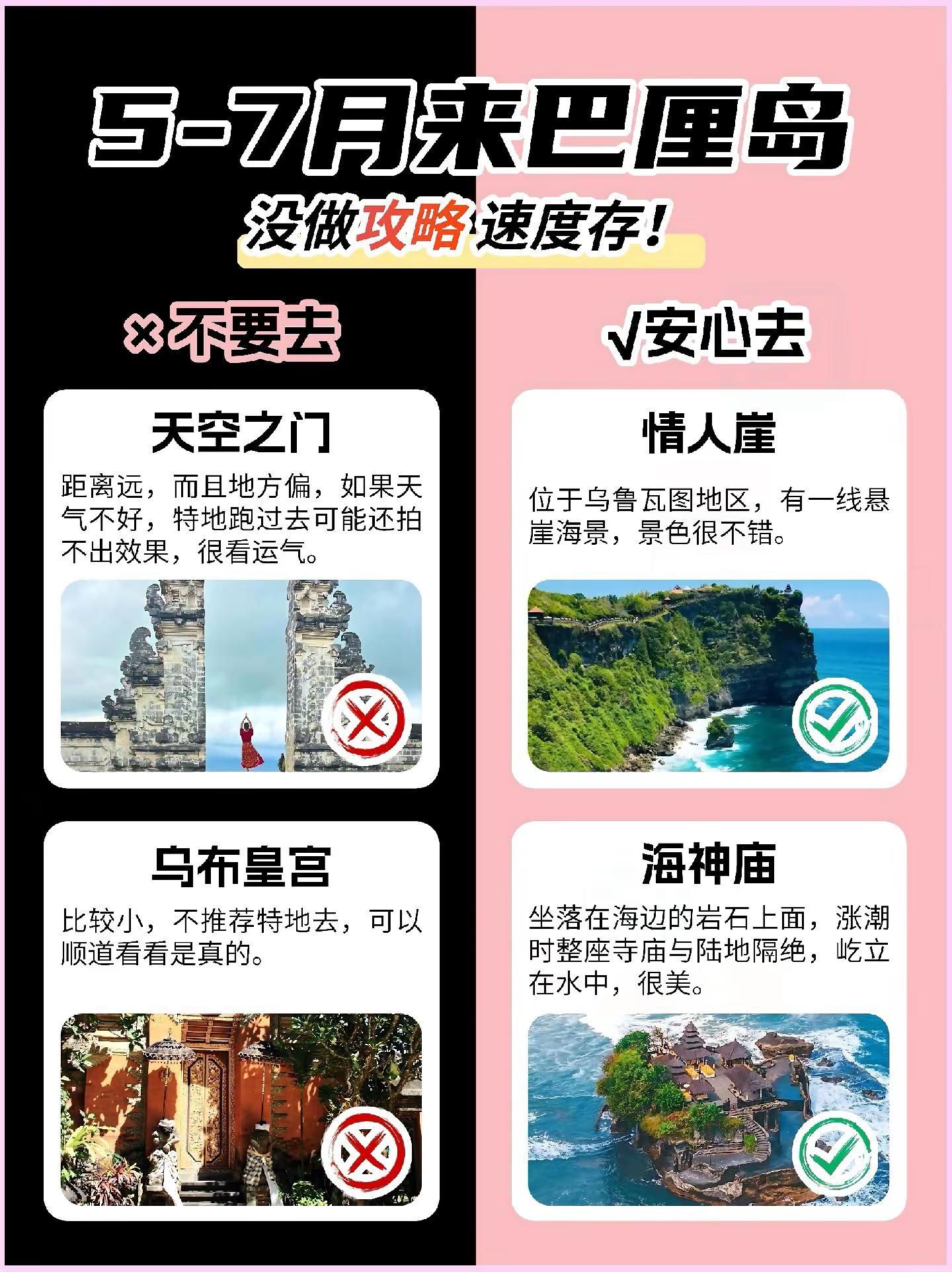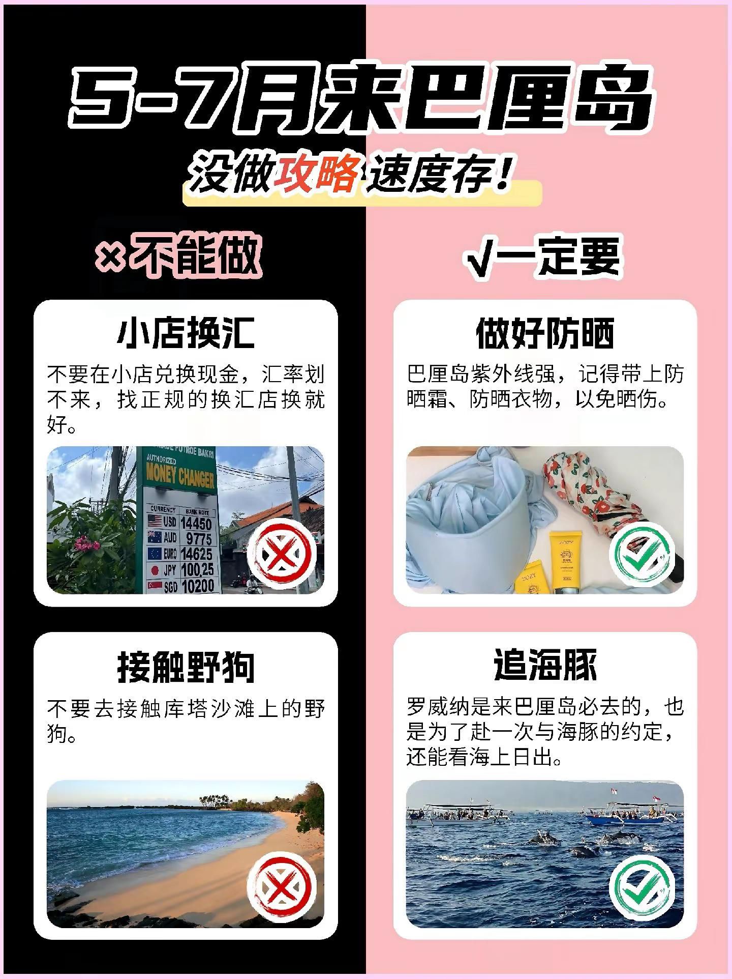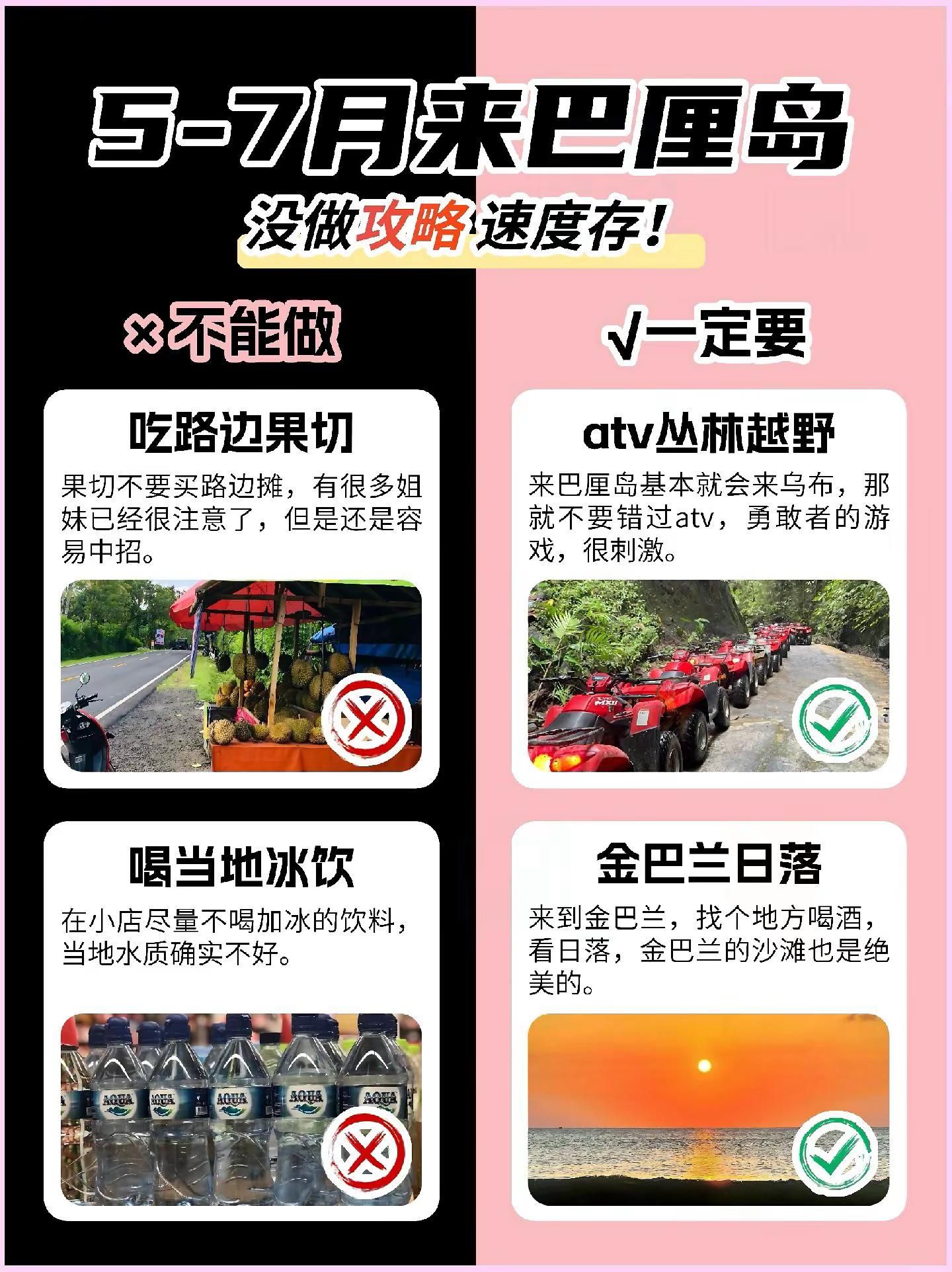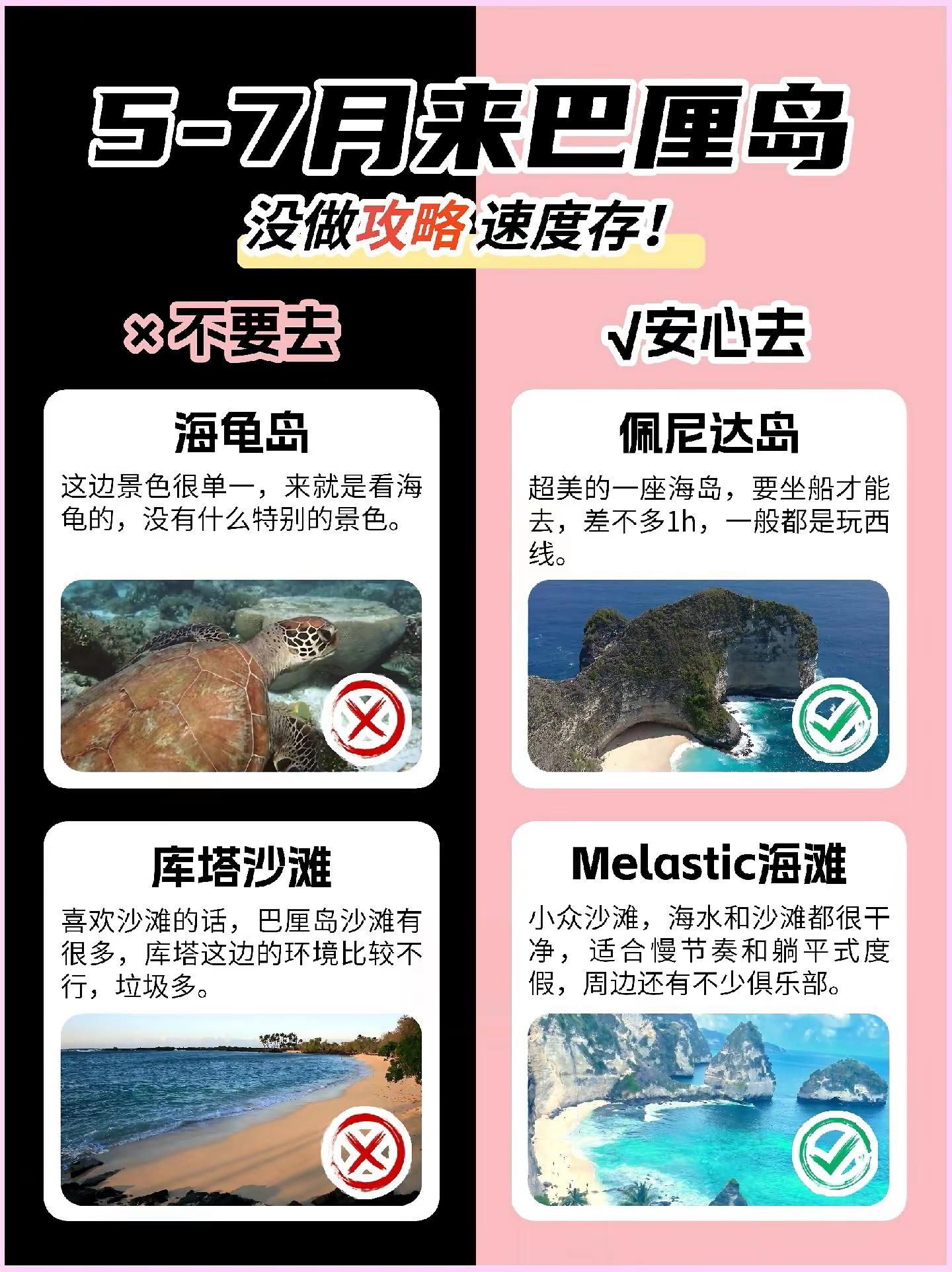 马上去巴厘岛了还没做攻略速存。一、行前准备1. 签证与证件 - 落地签:35美金/人,需提前在线申请电子签 - 打印材料:机票行程单、酒店预订单(落地签必备) - 护照有效期需6个月以上,建议随身携带复印件。2. 必备物品清单 - 证件类:护照、签证、现金(印尼盾为主,建议兑换2000Rp面额)、信用卡。 - 药品类:防蚊喷雾、晕船药(出海必备)、防晒霜(SPF50+)、创可贴。 - 电子类:转换插头(印尼用两脚扁插头)、充电宝、防水手机袋。 - 衣物类:防晒衣、泳衣、沙滩鞋、速干毛巾。3. 货币与支付 - 换汇:机场汇率较差,建议在市区有China Union标志的ATM机取现 - 小费:部分餐厅需给1-2美金小费,但非强制。--- 二、交通指南1. 市内出行 - 包车:最省心选择,中文司导约500-800元/天,适合多人分摊 - Grab/Gojek:打车软件覆盖南部区域,摩托车出行需注意安全 - 租摩托车:70-80KRp/天(约30-40元),适合预算有限的游客2. 跨岛交通- 蓝梦岛/佩尼达岛从库塔码头乘快艇(15-20分钟),佩尼达岛需从蓝梦岛转船#印尼 #巴厘岛攻略 #布罗莫火山 #佩尼达岛 #bromo火山
