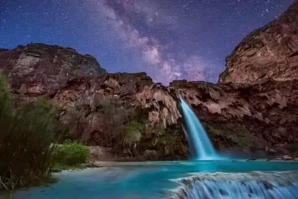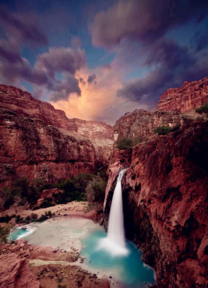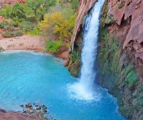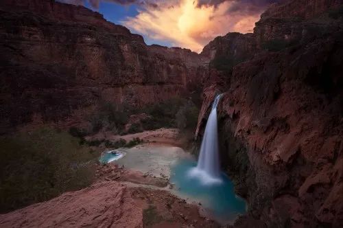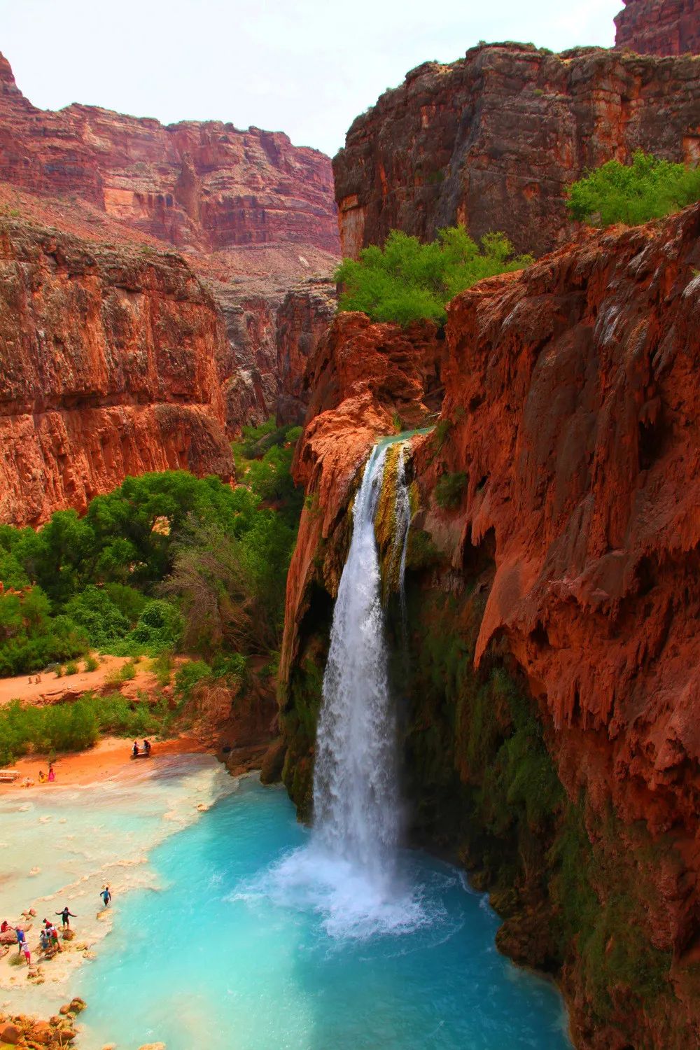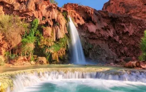 深入科罗拉多大峡谷西边腹地数十公里之处,有一条极为壮观的哈瓦苏瀑布。瀑布顺着红色石岩飞泻而下,聚成一座蓝绿色的天然水池,于一望无际的红色峡谷里,显得诡异又艳丽。这美丽的景色让沙漠绿洲——哈瓦苏瀑布,成为摄影师的心头好。它还被评为美国最上镜的自然景观之一。大自然的鬼斧神工造就了位于美国亚利桑那州(北美第一大瀑布)的哈瓦苏瀑布,它处在著名的科罗拉多大峡谷之中、大峡谷国家公园内的哈瓦苏印第安保留区。这里保存着相当丰富的天然资源,保护区内有四大壮观的瀑布,其中哈瓦苏瀑布的美景最是令人惊叹。其高度超37公尺,水流从红色峭壁上倾泻而下,注入如宝石般闪耀的湛蓝色水池中,令许多游客觉得不虚此行。