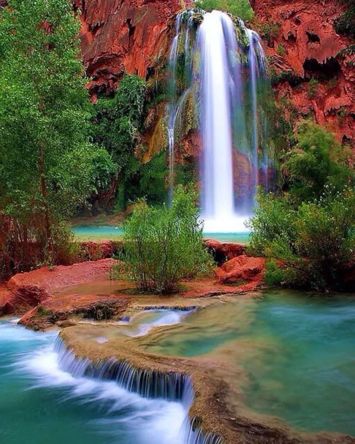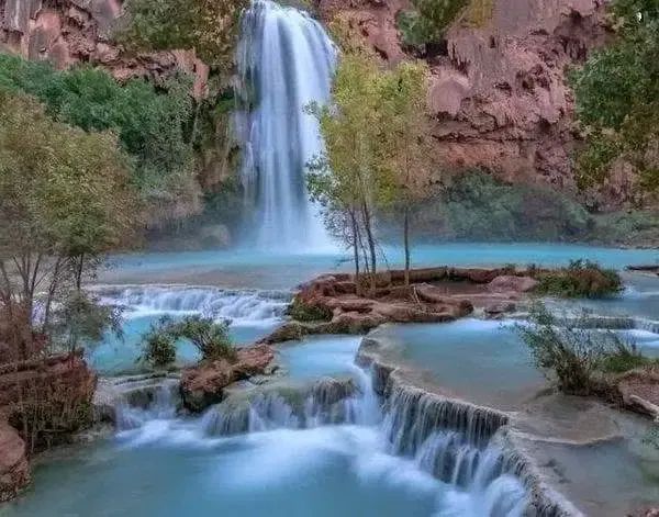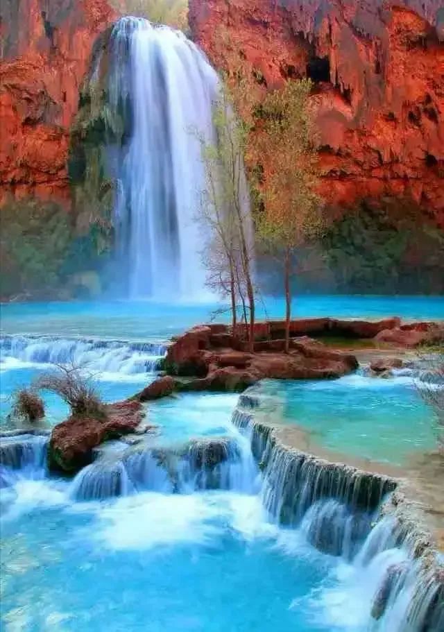 瀑布沿着红色石岩倾泻而下,直落像绿宝石般的湖中,蓝绿色的天然水池沉淀成阶梯式的石灰层,这里漂亮又壮观,是摄影的绝佳之地。凉爽、清澈的水沿着红色的峡谷岩石倾泻而下,形成一个美丽的水池。哈瓦苏人将其视为一条神圣的瀑布。哈瓦苏溪的水源自温泉,哈瓦苏瀑布的水温始终恒定在20摄氏度左右,瀑布底下的水池是极好的游泳场所。一头扎进蓝绿色的水域,在瀑布的轰鸣声里,感受游泳的乐趣。不过因为哈瓦苏瀑布位于哈瓦苏派印第安保护区,为了维持这个世外桃源的原始之美,部落限制了游客数量。#神秘峡谷风光# #绚丽地貌# #美景峡谷# #世界遗产级风景# #自然景观壮美# #大峡谷瀑布风景#