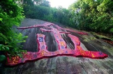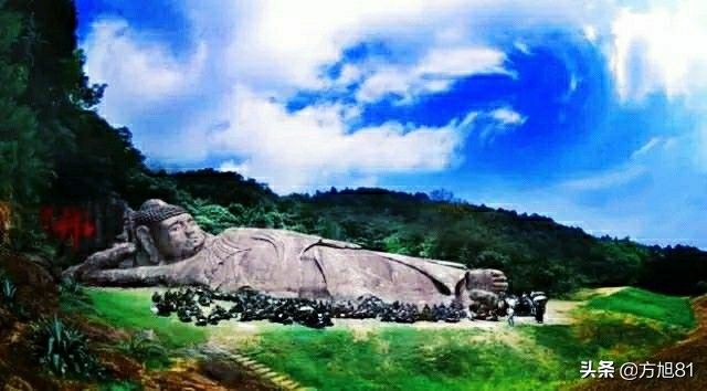 淘金山上览佛迹,穿过古道可见是后人把山中的这块突兀危崖的大石头雕成旷世稀有定光卧佛——华夏第一卧佛,长38米,宽10米,高11米,而后山还有一尊绿色山体大卧佛,约4公里长,山体与佛浑然一体,如“佛中佛,佛心佛”。