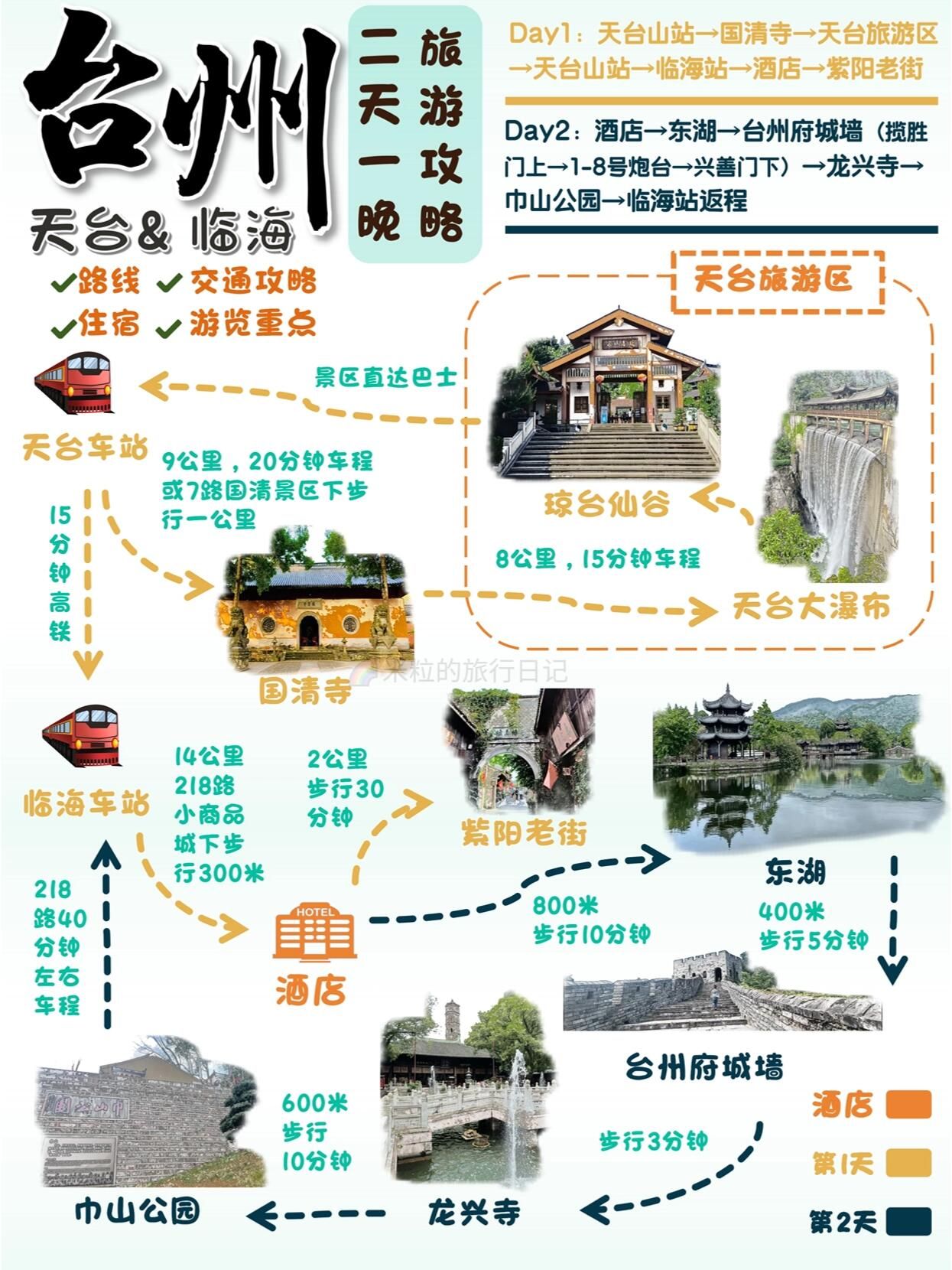 Day1:天台山站(9公里,7路国清景区下步行1公里)国清寺(8公里,15分钟车程)(天台大瀑布+琼台仙谷)(景区直达巴士)天台山站(15分钟高铁)临海站(14公里,218路小商品城下步行300米)酒店(2公里,步行30分钟)紫阳老街