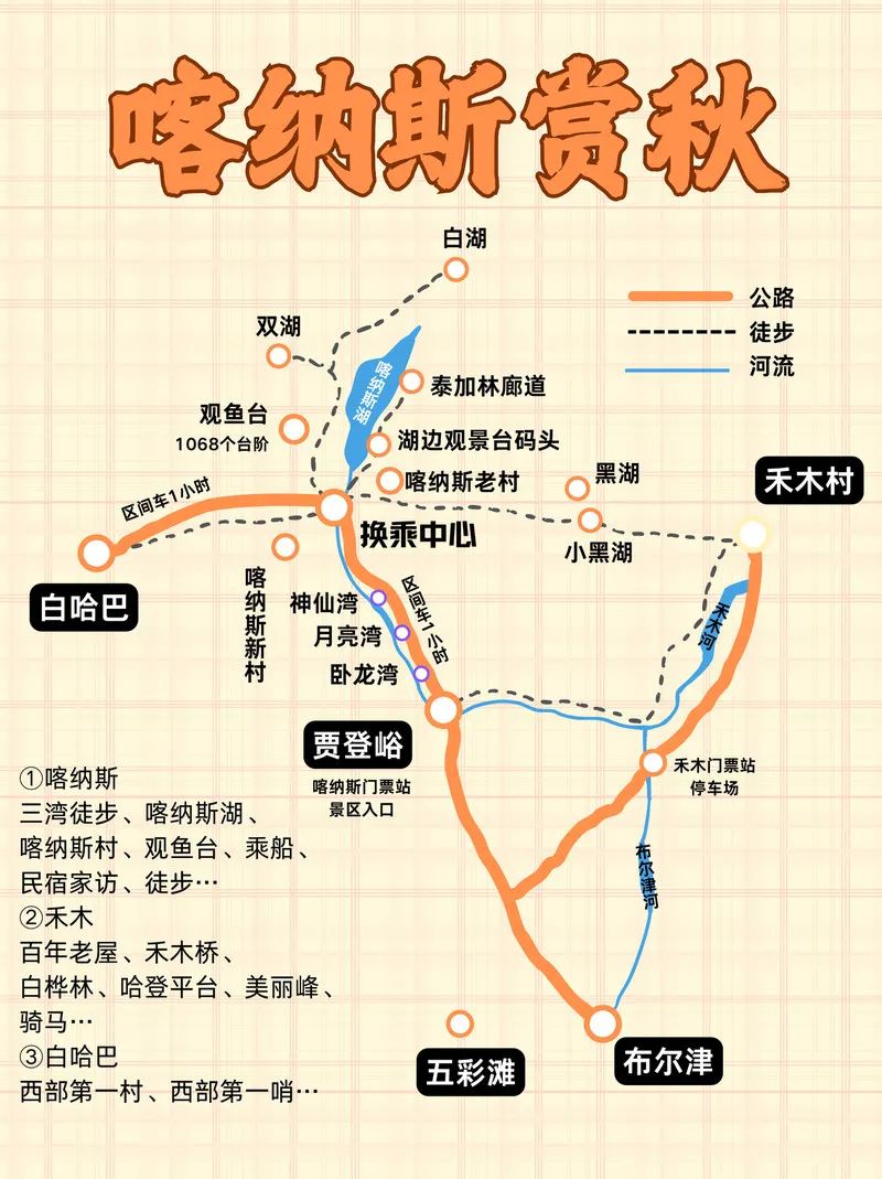 自驾:从乌鲁木齐出发,沿着S21一路向北,经布尔津县到达喀纳斯景区。但需注意,旺季时私家车不能进入景区,需乘坐区间车或景区VIP直通车。