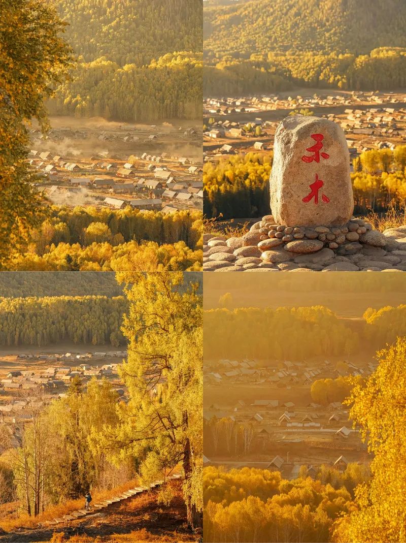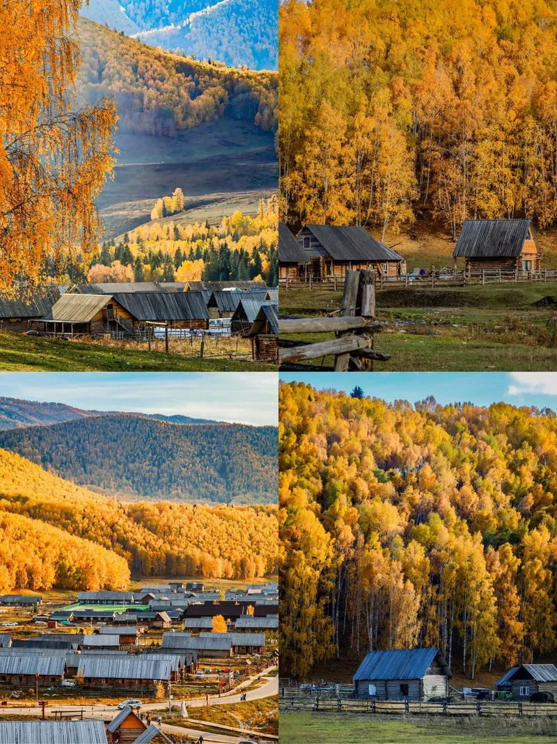禾木村:被称为“神的自留地”,是原始的图瓦人村落。秋季的禾木是摄影爱好者的天堂,炊烟在金色的村落中升起,与远处的雪山、森林构成绝美画面。