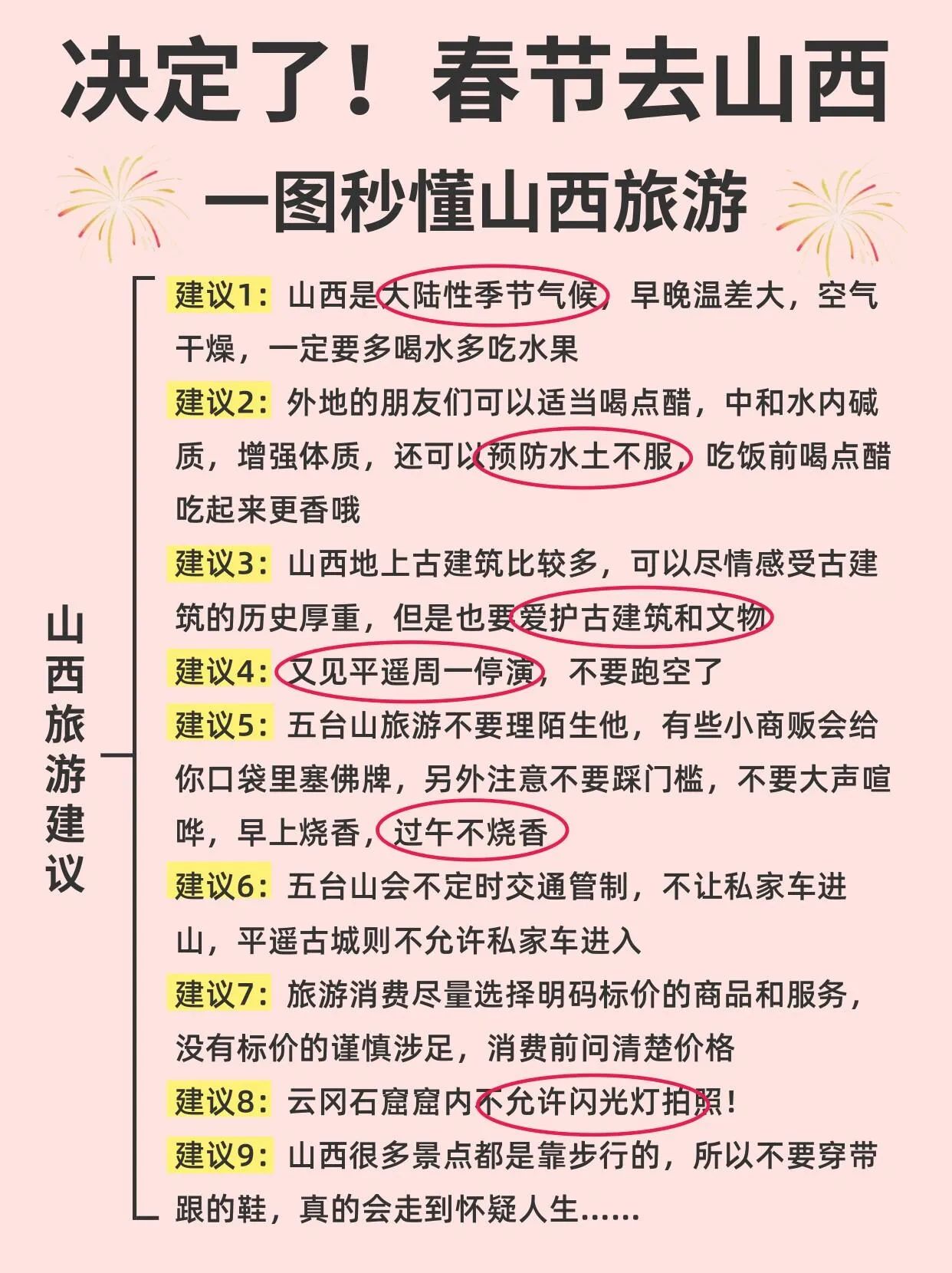 - 山西天气多变,早晚温差大,厚衣服一定要带足,别被冻到!