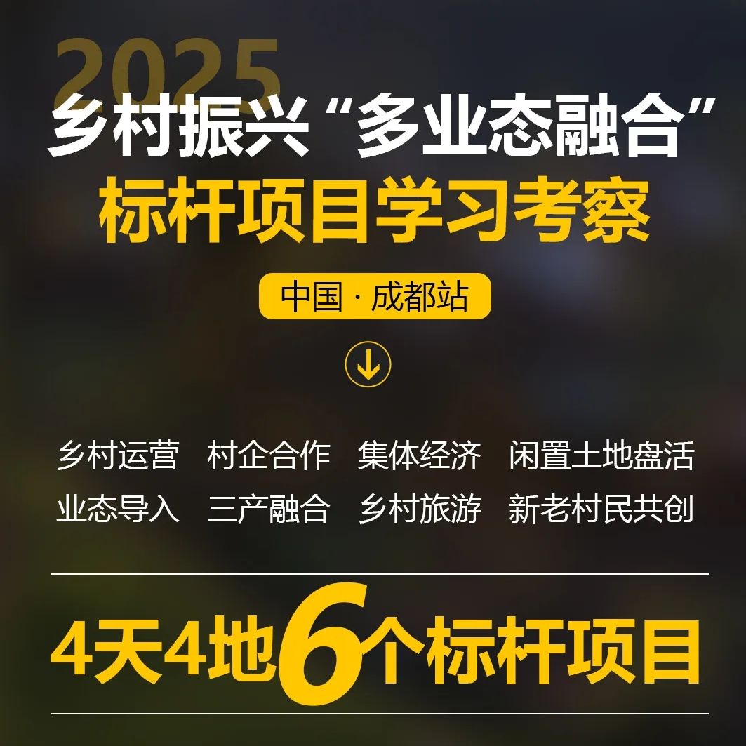 为此,5月20-23日,我们组织去成都周边深入学习四川在村企合作、集体经济发展、闲置土地盘活、业态导入、三产融合、返乡投资、新老村民共创等方面内容。采取理论授课、现场教学、交流研讨、实地考察/调研等多种教学方式,选取6个乡村振兴的标杆项目,村域业态丰富,涵盖乡村旅游、民宿、农家乐、文创、家庭农场、文创馆、研学旅行、网红小院等,期待业内感兴趣者参与。
