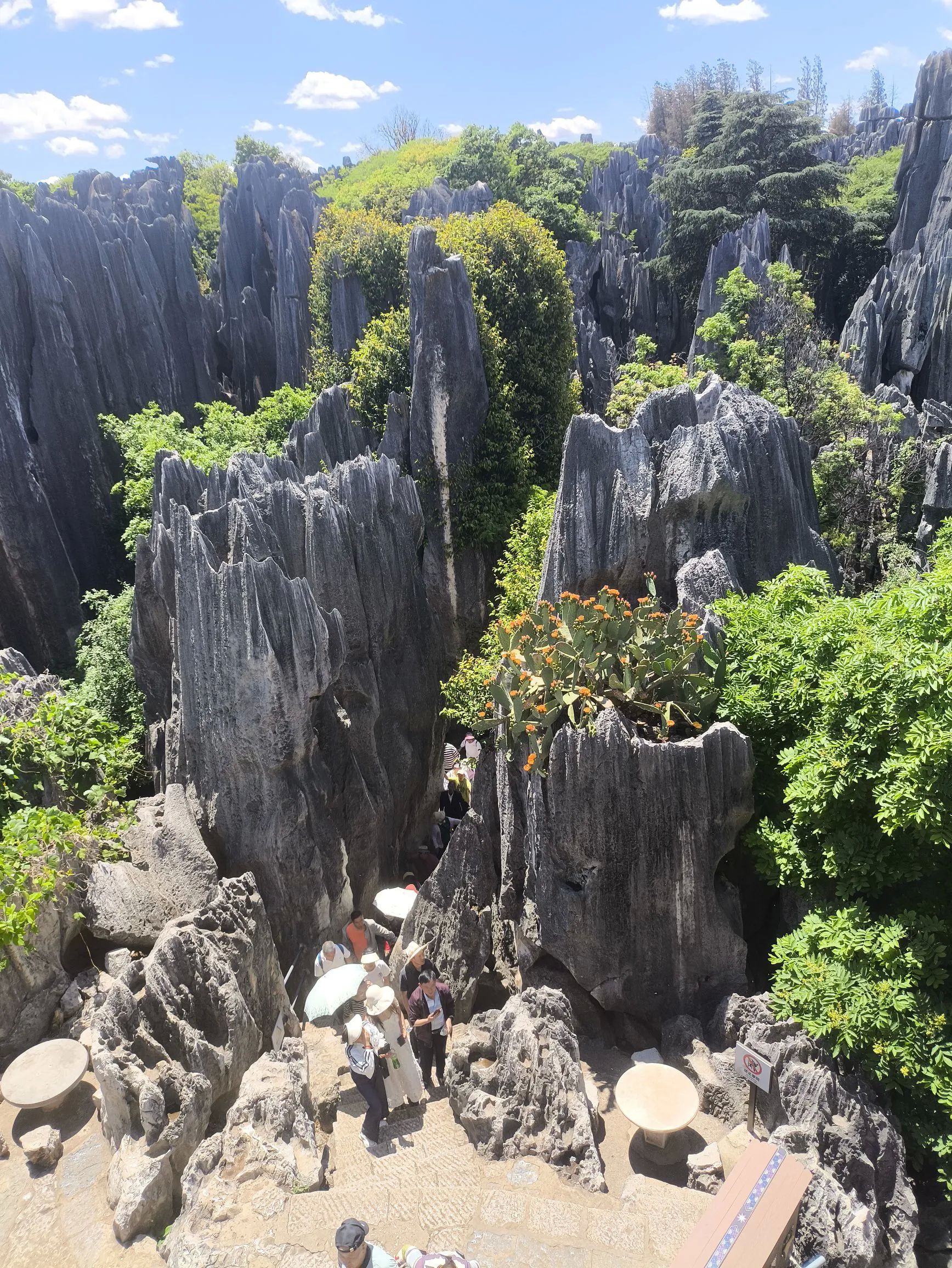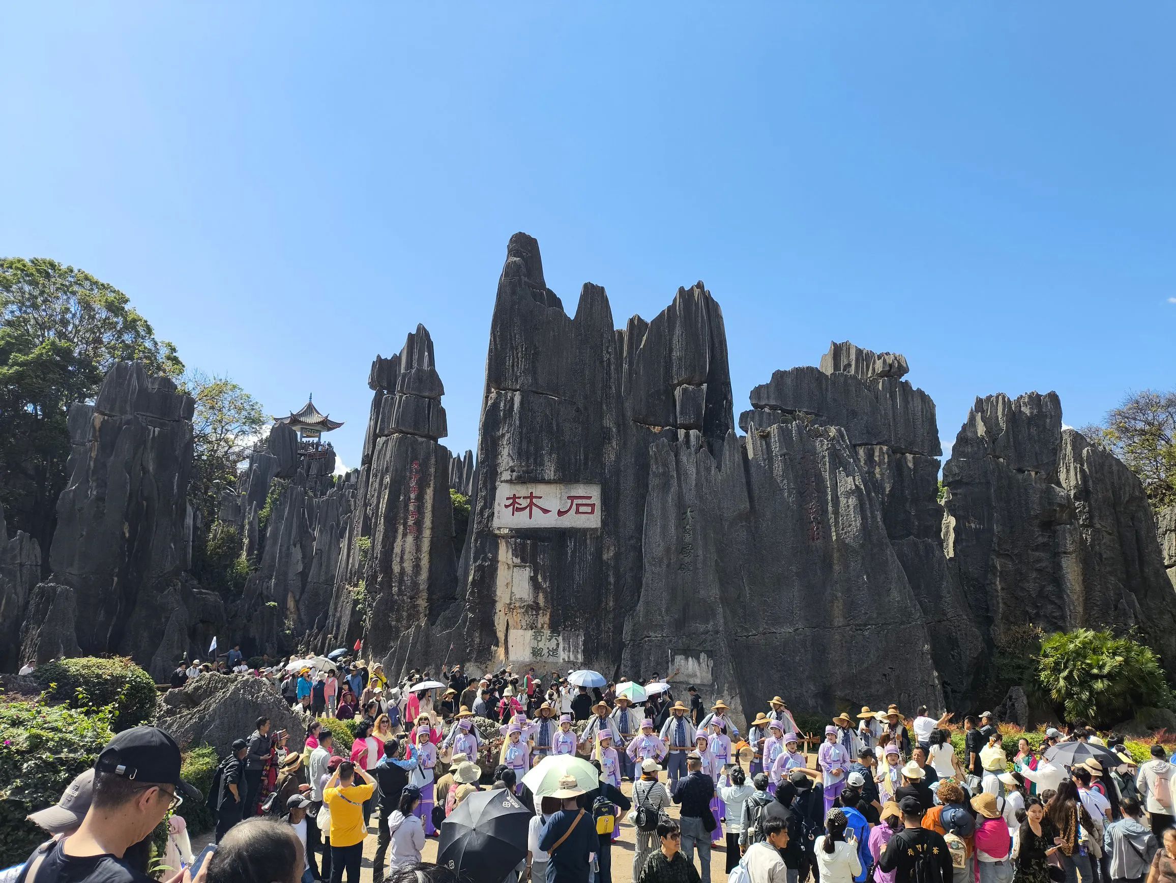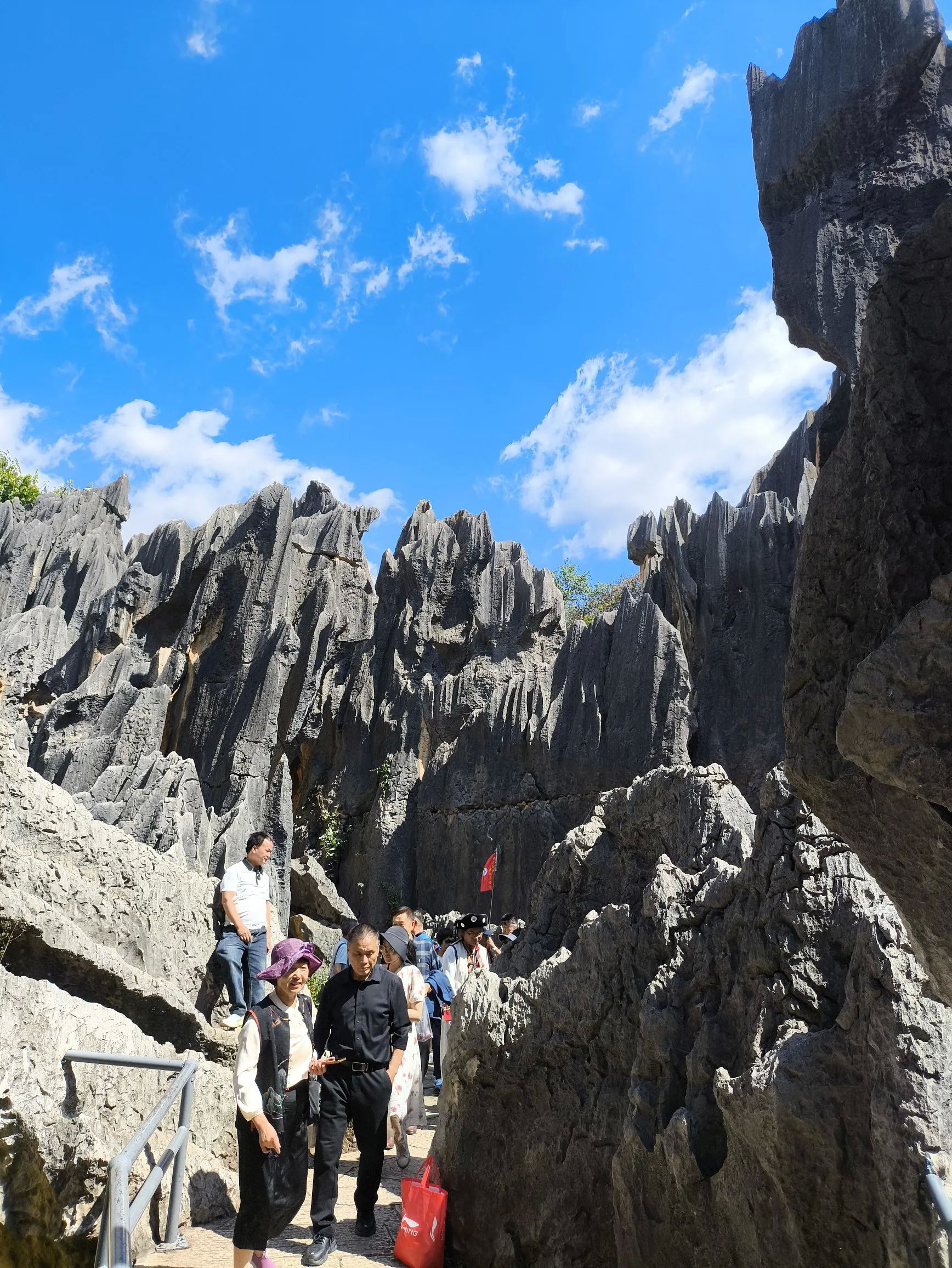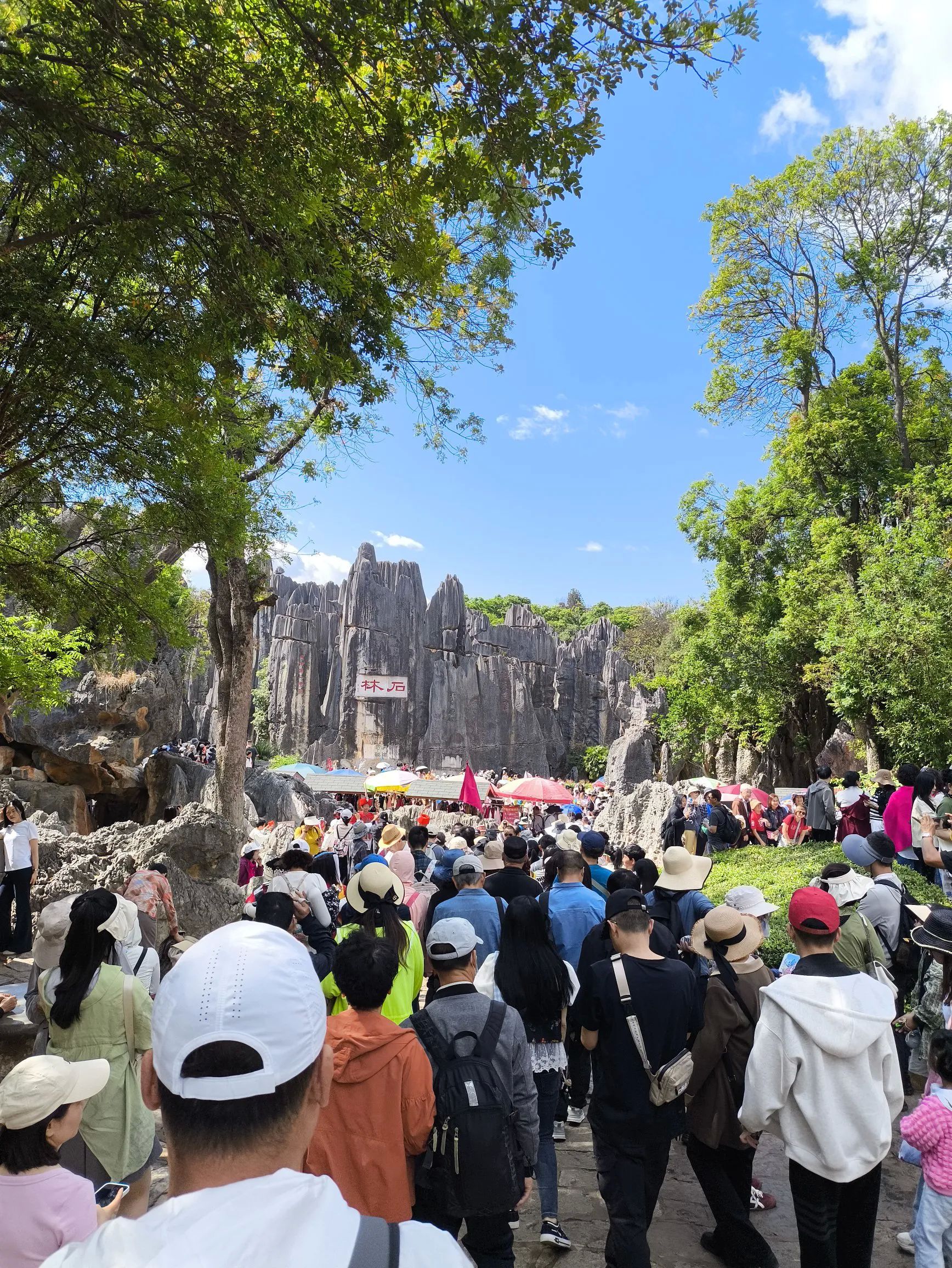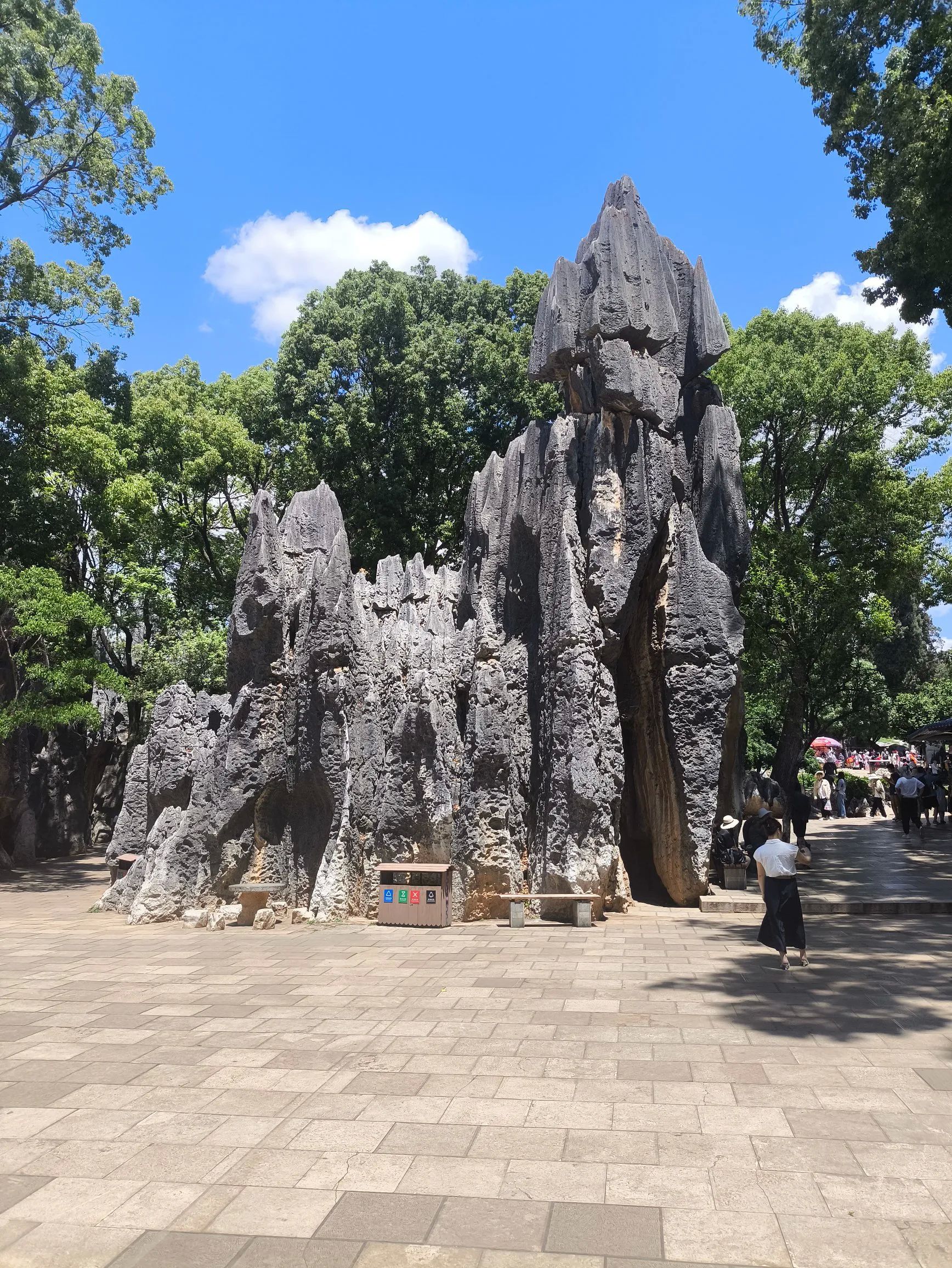 #头条创作嘉年华#戳这里,一起来集邮>5月4日游石林风景区。这是我们在云南的最后一站,完了就会贵阳。没来之前看网上很多博主说不值得,因为门票要130元,老年儿童半价65元,还要买观光车每人25元。不过本着来都来了,必须看看再走的原则,全家买票进园。这个观光车是必须买的,因为景区真的很大,主景区大石林在进口,小石林在出口,中间还有几个小景区,可以多次往返。我们觉得今天人很多,但听导游说有40多个团,连高峰期一半都不到。好多博主说玩石林必须报团,没有导游看不明白,只能是远看大石头近看石头大[呲牙]。确实有道理,不过这么多旅游团,在任何地方都能听到解说,不听都不行!在进大石林核心区之前有一个石屏风,就是很高很薄的巨石非常震撼。进去核心区,这里有很多摩崖石刻,除了龙云的都是小人物,在人文方面差了点。钻进石林就是一步一景,边走边拍非常出片,里面有休息的石桌石椅,跟着人流爬上观景亭,又跟着人流下来,不累很有趣。不过有点不太好的,景区内的饮料食欲是很贵的,一根考场10元,所以尽量自己带。还有就是滥竽充数的导游太多了,同一个景点解说都不一样,都不知道信哪个?转完大石林就乘车去小石林,中间的小景区没下车,因为都是些零碎的小石头,看过大石林就觉得这些索然无味。到小石林这里有湖,有阿诗玛(像美女的天然巨石)还有像猴子像大象的,这个导游会解说,自己也可以发挥想象力。游完小石林就出来坐电瓶车回到正门,走几百米就出景区了。总体上挺好玩的,也算对得起价格。很多人说这不就是喀斯特地貌,云贵川都能看到,不就是个大号的贵阳市喀斯特公园,那个公园还不要钱。不是的,规模不在一个层面,就像小河沟看过了长江黄河还是要看的!五一假期就这么结束了,昨晚我们住在石林旁边一个叫五棵树的一组村寨,村民是彝族撒尼人,很纯朴,我们还参加了他们的篝火晚会。住宿100,早餐8块一碗的粉,中餐一百来块钱一家子吃不完,消费是真的低。好多人怕去云南旅游,我们这一趟4天下来,没有被坑过,所以说尽量不要报团就自驾游,云南的本地人本地商户都是很淳朴的,不要妖魔化云南旅游!