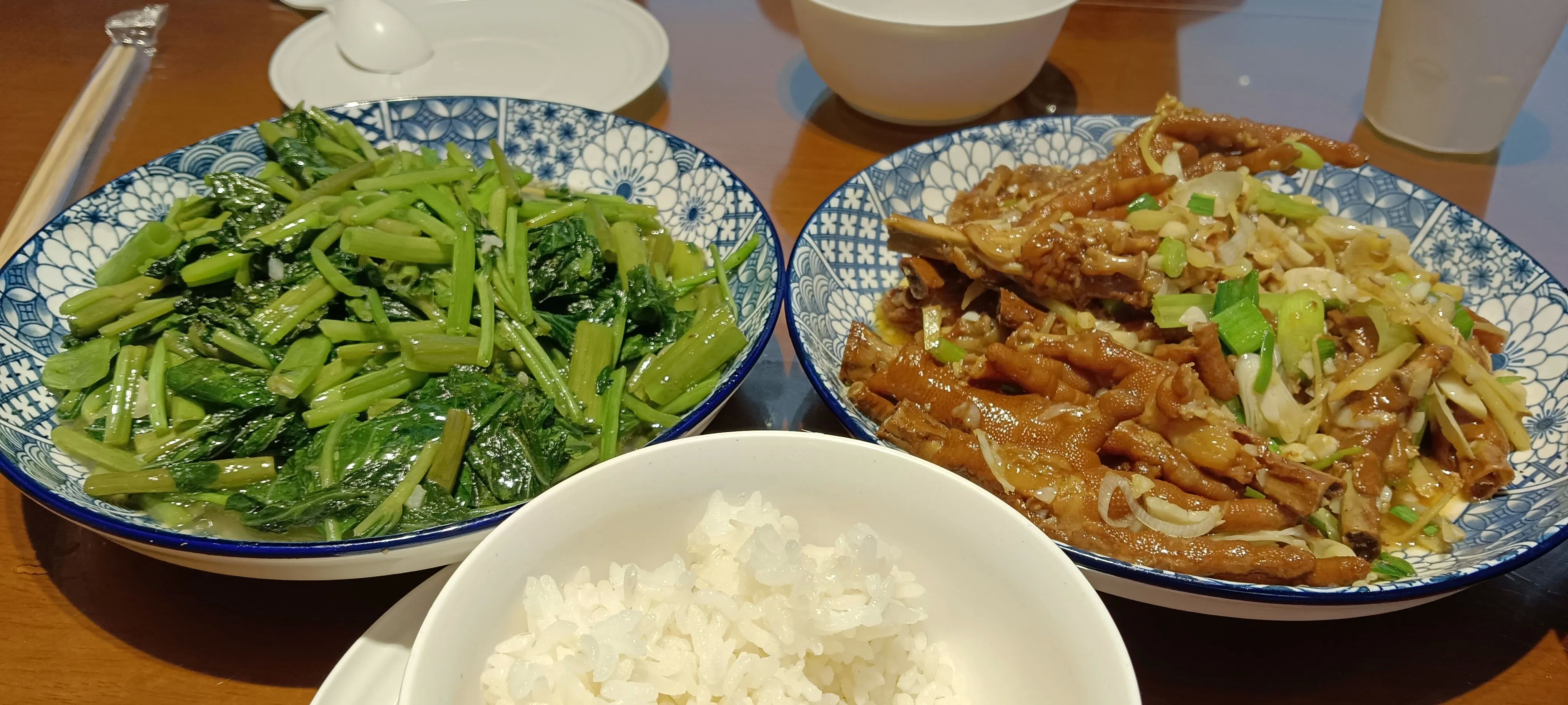 一个葱姜炒鸡爪,一个素炒空心菜,一盆米饭,一共花了98块钱。