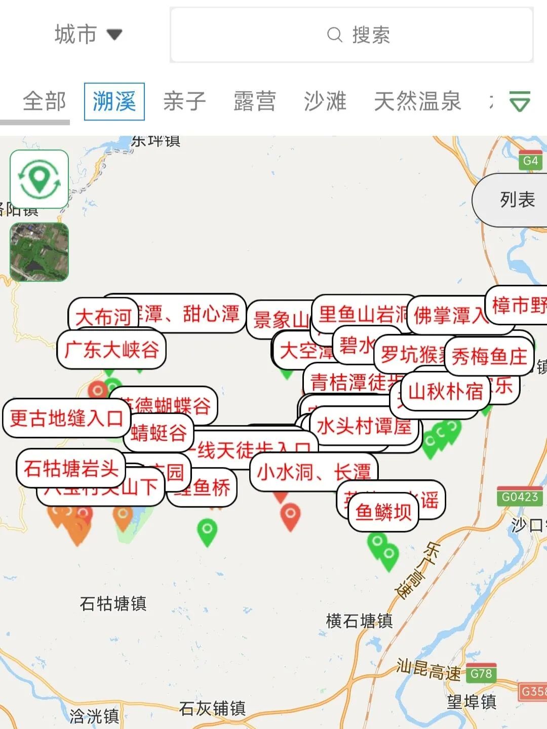 长 潭、翡翠潭、一 线 天、六连瀑+双龙 潭环线+、八宝村、大石 板、阳山秤架、婆坑村、石角沙滩、潭岭天湖周边、水 头村青柠潭、佛冈森波拉、水 森 林