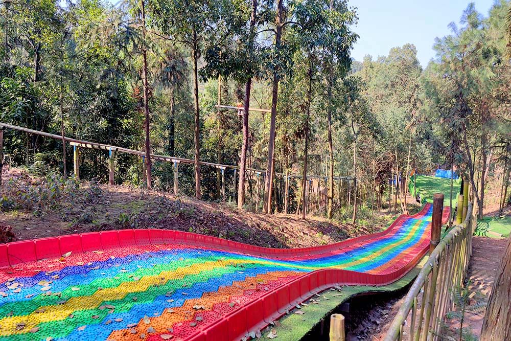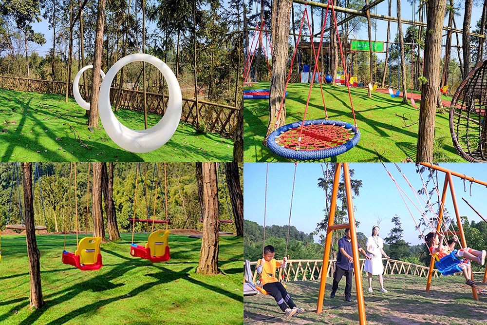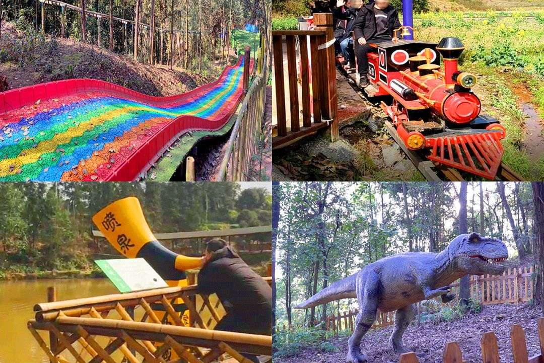除了小火车,乐园里还有恐龙园、七彩滑道、滑索、油桶拖拉机、秋千、蹦床等等,从滑道上“唰”一下滑下去,让风从耳畔呼啸而过,将烦恼吹到脑后,再也追不上我们。