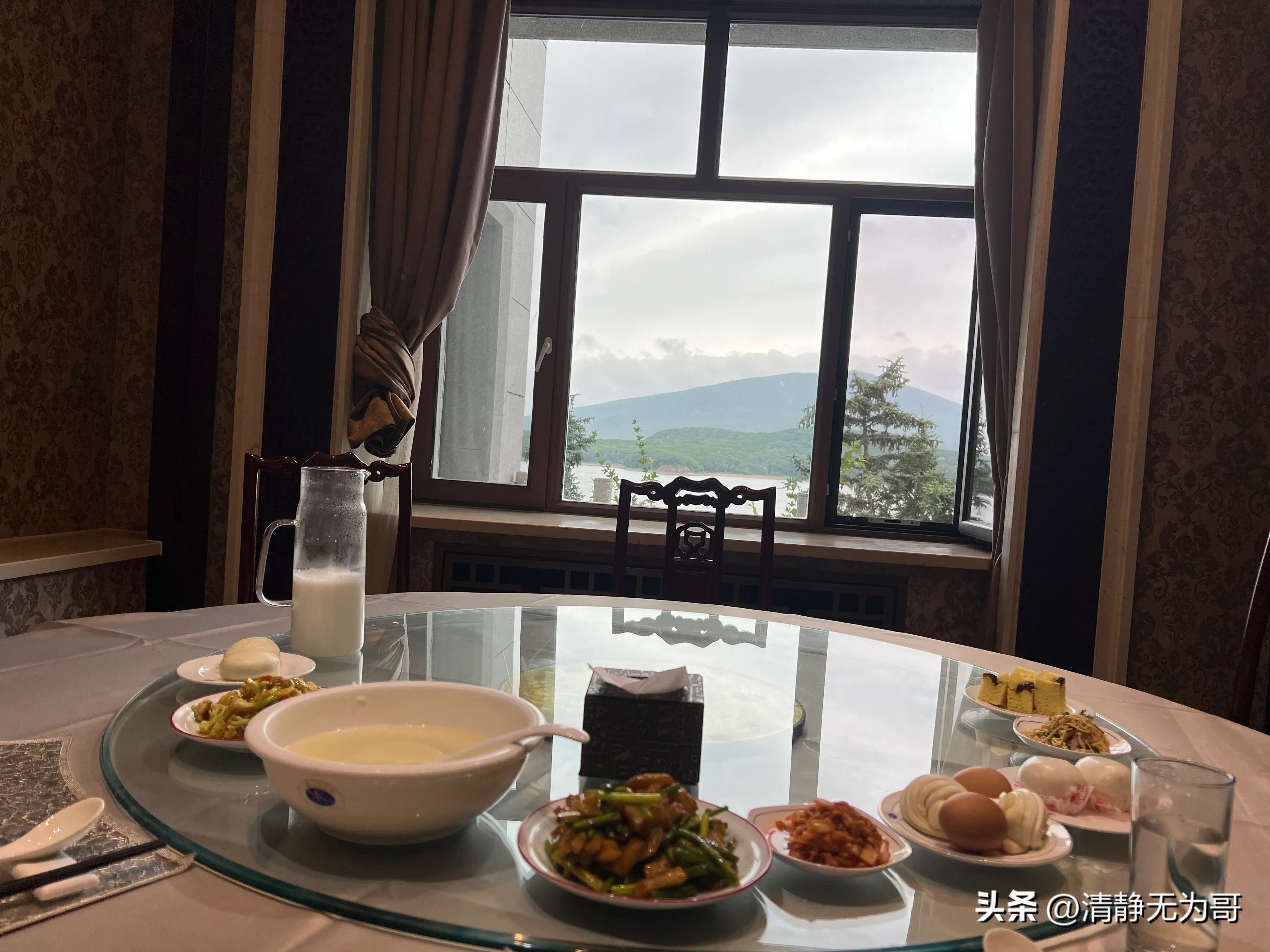 镜泊湖暑期是旺季,全国最大的高山堰塞湖,确实很漂亮,由于到的晚,最后一班船居然就我们两个乘客,载客一百多人的两层大船,三个船员陪着,在烟雨朦胧中畅游!吊水楼瀑布号称最宽的瀑布,可惜这两天水量不够大,中国跳水第一人每天的跳水表演是最激动人心的时刻,三十年天天不间断,这份精神必须是大大服!住在镜泊湖宾馆的元首楼,接待各方政要的国营宾馆,位置没得说,窗户正对毛公山,早餐的仪式和环境吃出大领导的排面,晚上幽静,凉爽,不虚此行!