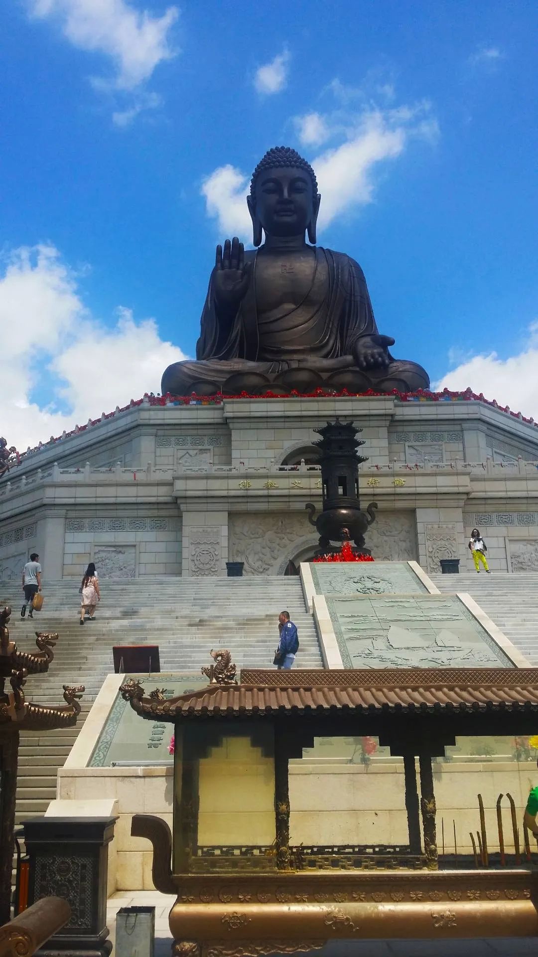 大佛总高48米,由青铜铸造,重达500余吨,端坐在六鼎山莲花峰上,俯瞰群山。佛像面容慈祥,左手托法轮,右手施无畏印,象征智慧与平安。阳光照射下,金光熠熠,远望便觉震撼。