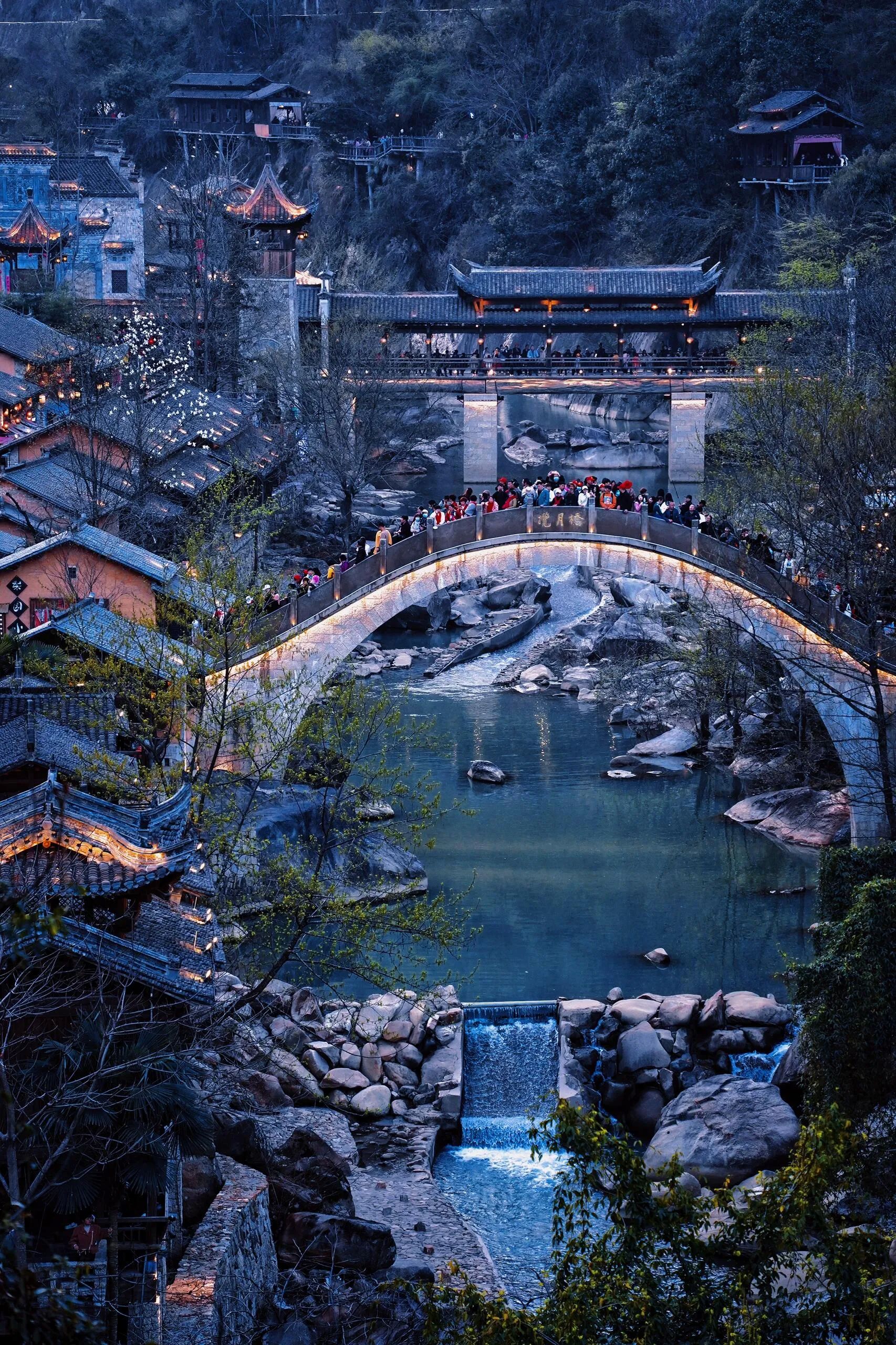 悬崖上的楼阁层层叠叠,脚下是潺潺河道,古街里飘着烟火气。站在远处眺望,仿佛走进了仙侠游戏场景!强烈建议住一晚!黄昏时分,暮色给悬崖建筑镀上金边,配上万家灯火,美到窒息~