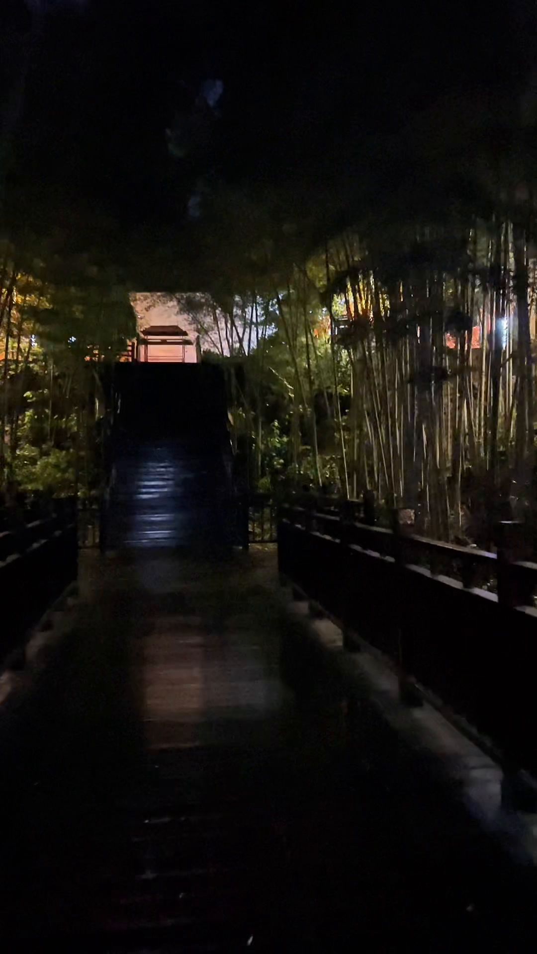 晚上来到寺庙,看着这样的场景还是别有一番风味的。白天来到这里,这片竹林中间的路还是很粗偏的,晚上就显得有一点黑,但是用闪光灯拍照出来也还可以。走上这片竹林,云环寺就到了。往左走个几十米就来到了圆华寺的山顶,塔山整个山顶刚刚装修好,非常的亮堂漂亮。不仅能够看到全城的夜景,还有号称义乌的雷峰塔。