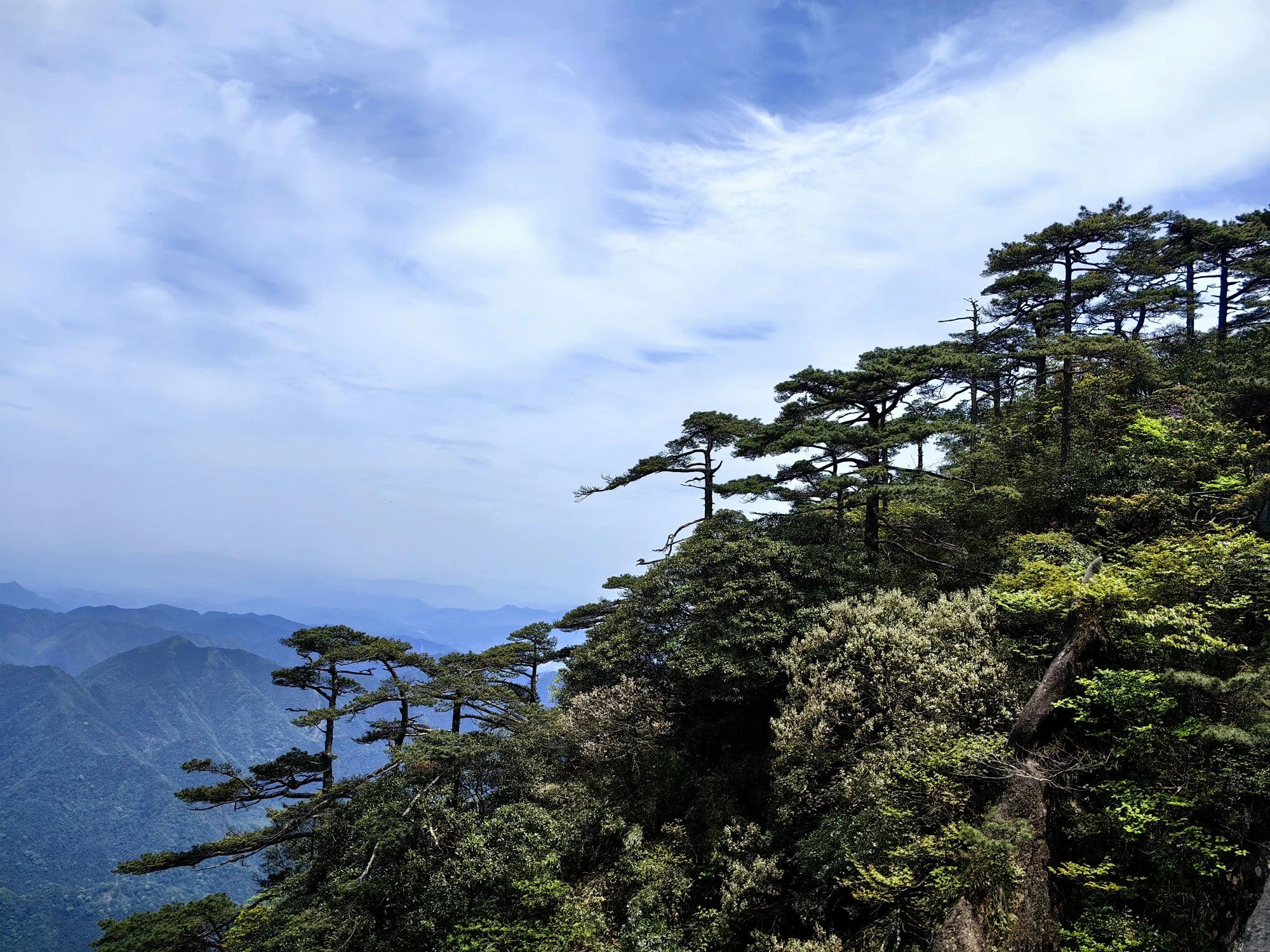 今天是考验体力的一天。早8点半出发登山,我是从三清山南部外双溪索道上山,然后沿着西海岸线(海拔1600米左右)到三清宫,花了2个半小时(9—11.30),一路真是上不完的台级,绕不完的山啊,走走停停,行行摄摄,陶醉在山海之中,微风徐徐,一路听着哗啦啦的泉水声,还看见很可爱的小松鼠和漂亮的鸟飞到你的脚边,你刚刚想拍它跑了,杜鹃花正灿烂无比,兴致勃勃中走到目的地三清宫。