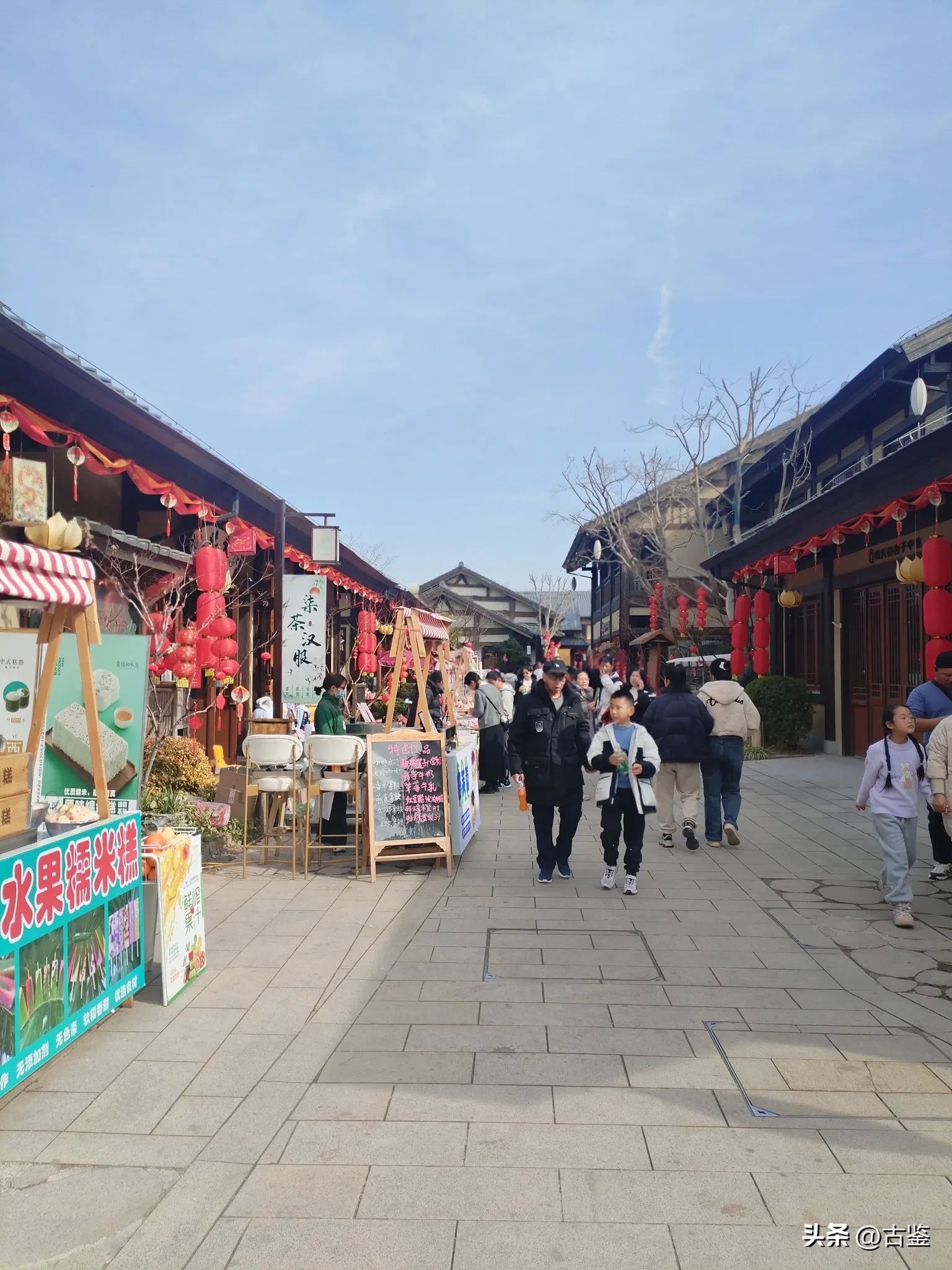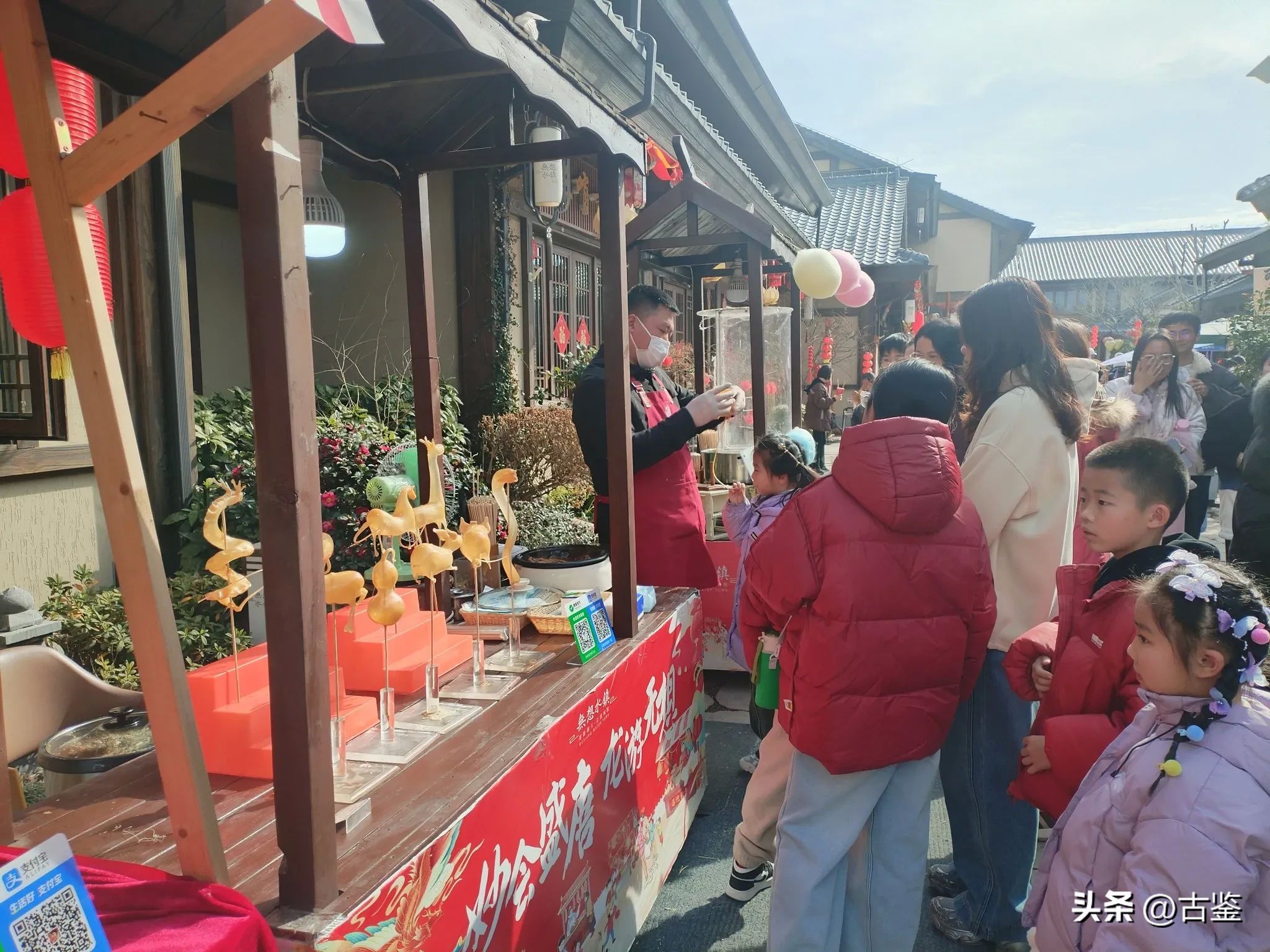 喜鹊登枝报喜来,灵蛇献瑞迎春到。无想水镇内的街巷,已经成为了热热闹闹的集市,巷子两边张灯结彩,一派过年喜庆吉祥的气象;蛇年装饰随处可见,各种摊位依次排开,有卖糖山楂的,卖棉花糖的,卖米酒的,卖捏糖人的,卖非遗工艺品的,卖玩具的,还有套圈的,打汽球的,更有亲子活动的游乐区。水镇上的门店里,也是吃的穿的玩的应有尽有,更有溧水历史文化的展示馆、收藏馆、陈列馆,汉服馆……琳琅满目的物品令人眼花缭乱,喜庆吉祥的氛围令人欢欣鼓舞。