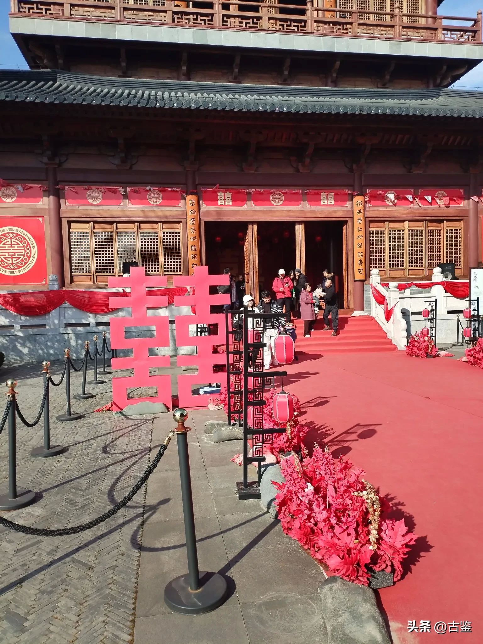 城隍庙的前殿门口,铺设了一条红地毯,地毯两边堆满了鲜花,大门两侧的墙上贴满了喜事,门前也竖着两块贴字大红双喜的牌子,整座殿堂,红红火火,喜庆吉祥……原来这佛殿俨然成了举行婚礼的喜屋!听说,当地新人结婚有选择春节举行婚礼的习俗,如今,到无想水镇城隍庙举行婚礼成为新人们的时尚。