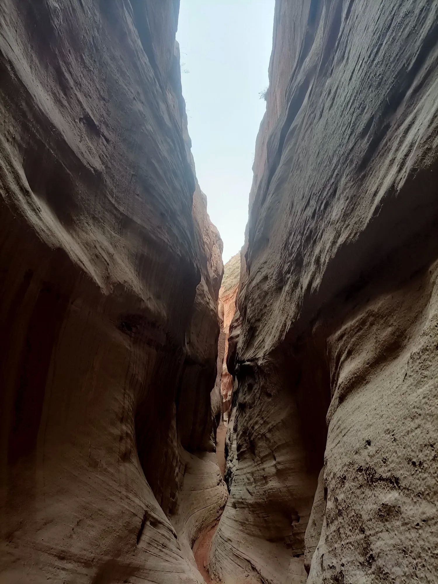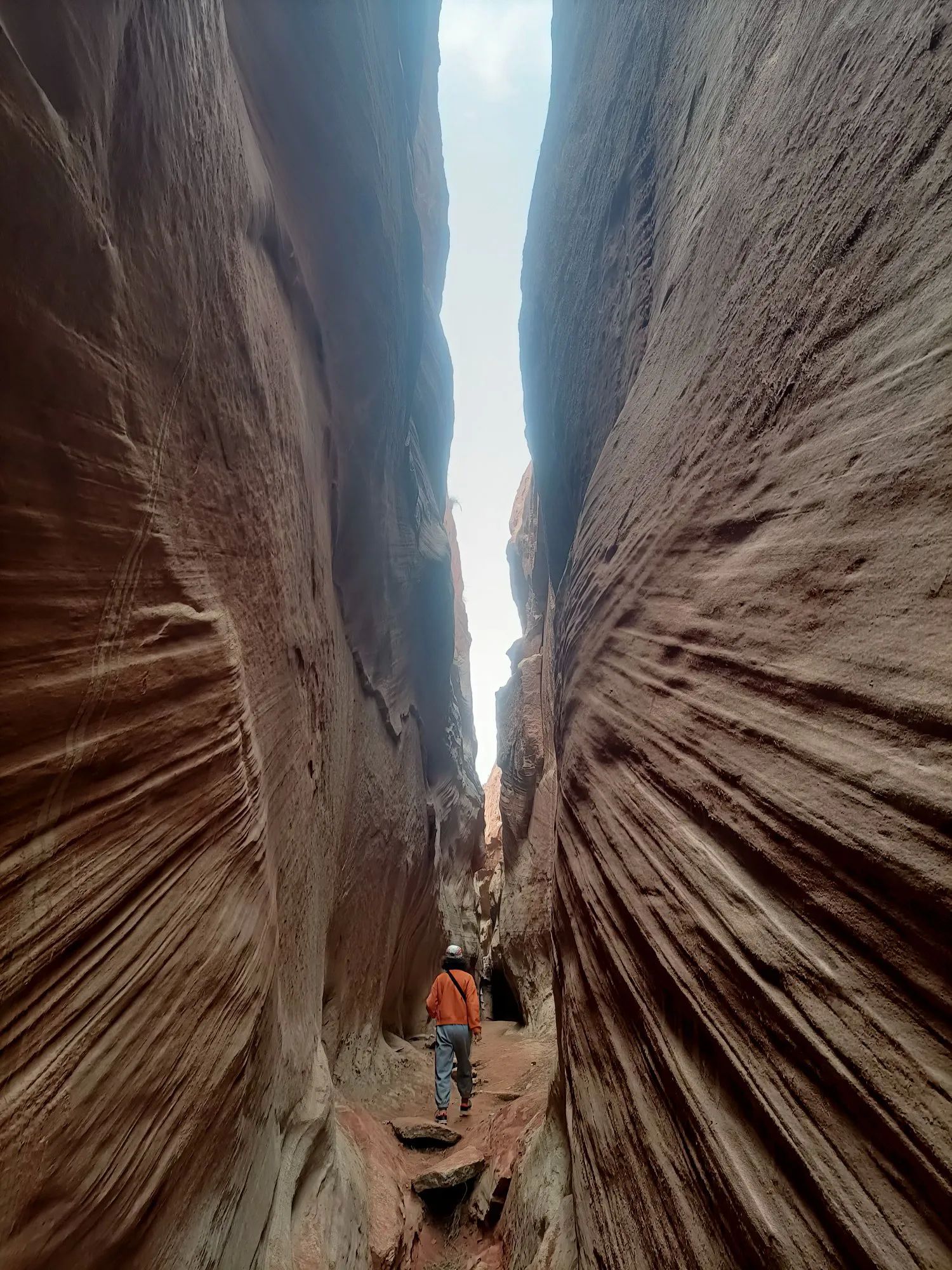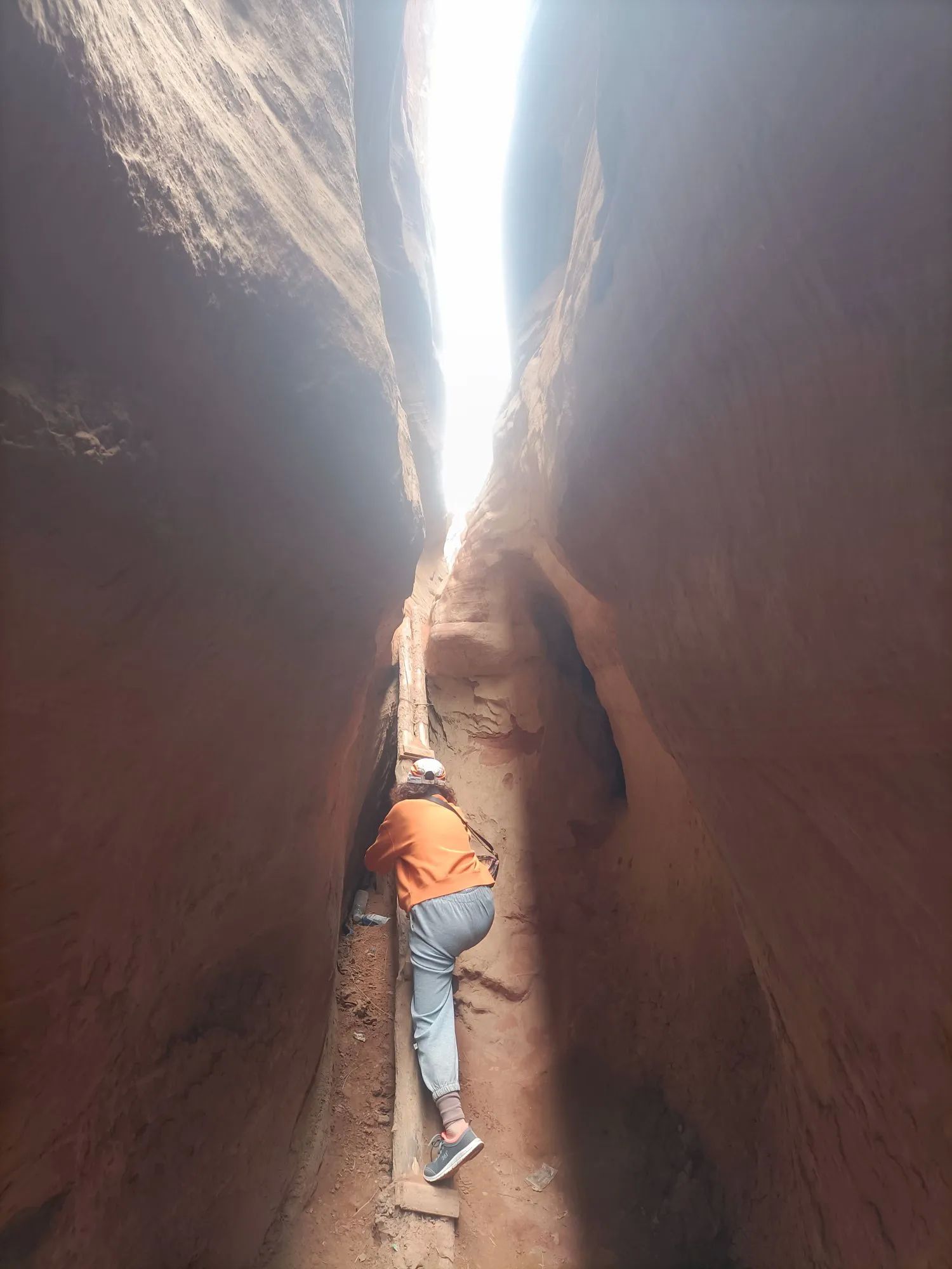 大峡谷一线天,像刀劈的一条缝,抬头看不着天。两边崖壁的一条一条线,是大自然的杰作。我们只能侧着身子单脚通过,稍胖的人想通过这里很困难,前面有个坡,只能借助绳子才能爬上。在这里,好多游客都打退堂鼓了,半途原路而回。