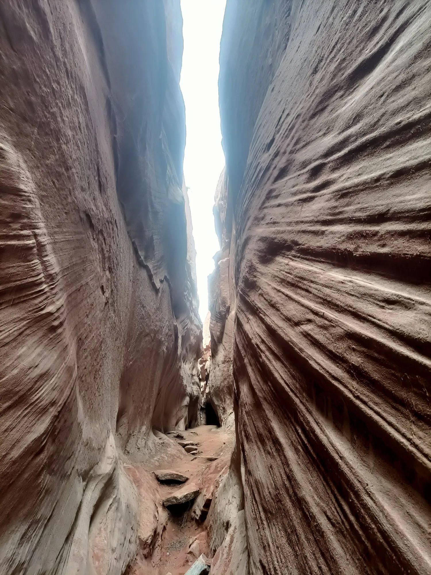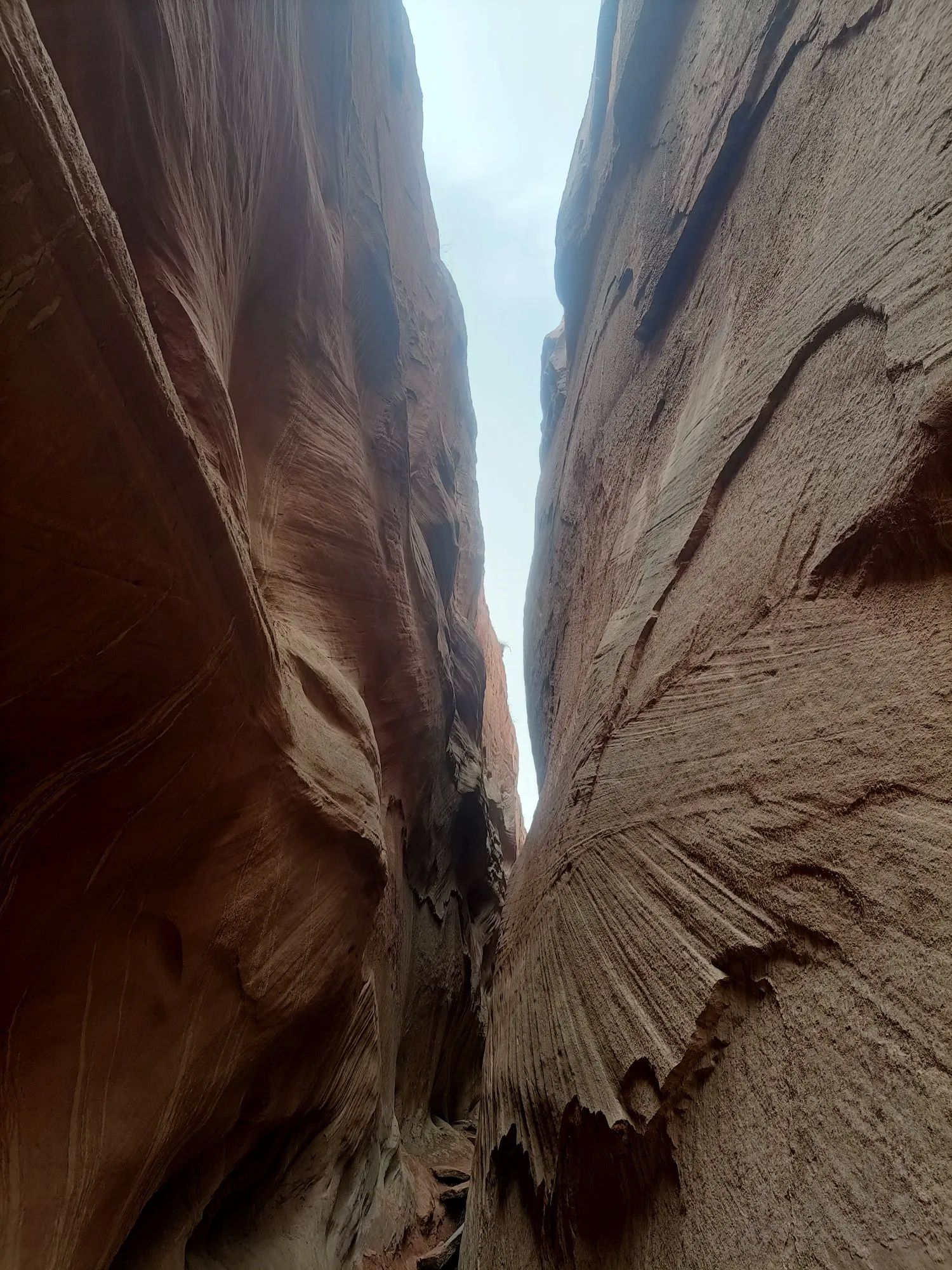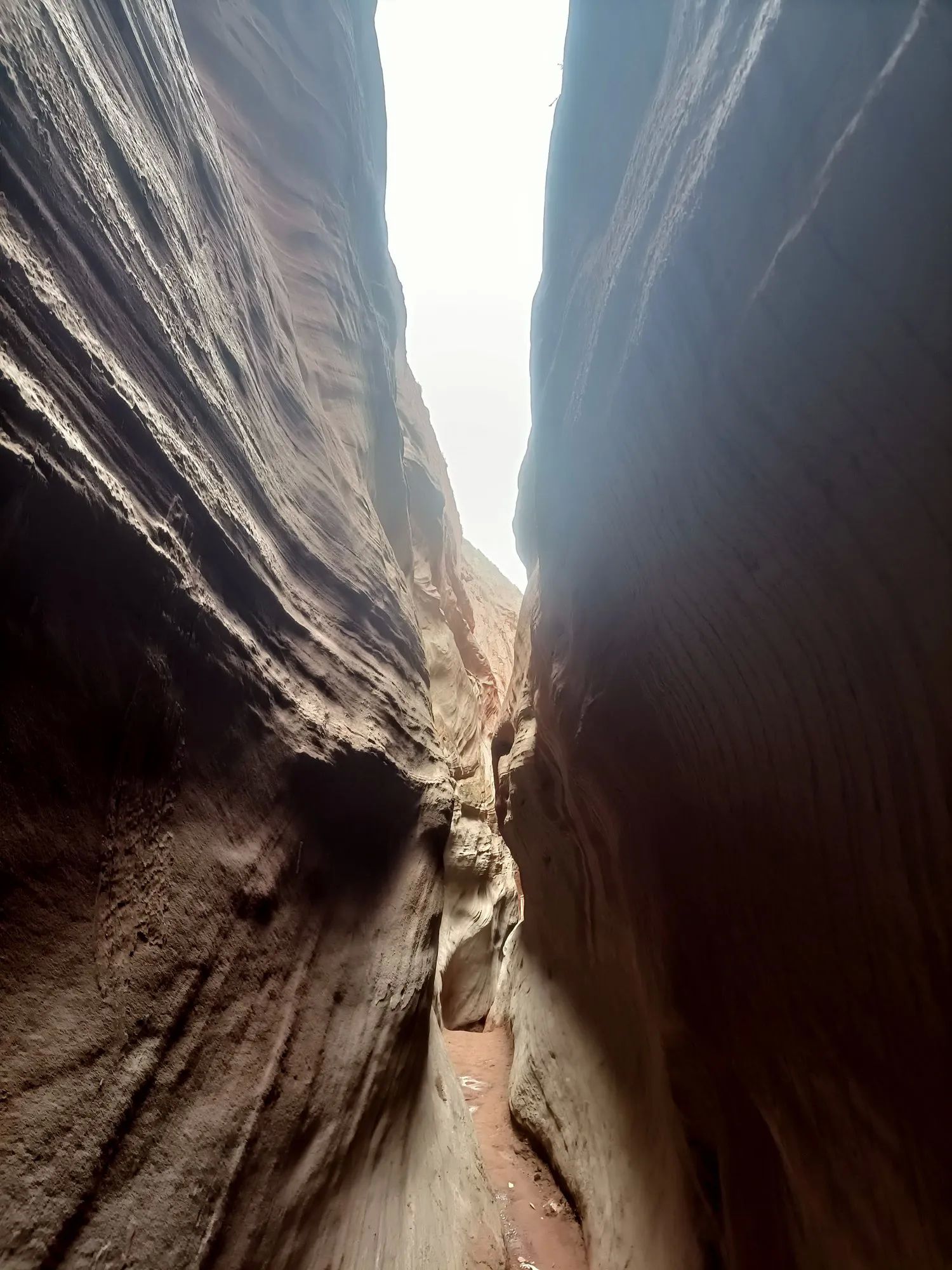 大峡谷一线天,像刀劈的一条缝,抬头看不着天。两边崖壁的一条一条线,是大自然的杰作。我们只能侧着身子单脚通过,稍胖的人想通过这里很困难,前面有个坡,只能借助绳子才能爬上。在这里,好多游客都打退堂鼓了,半途原路而回。