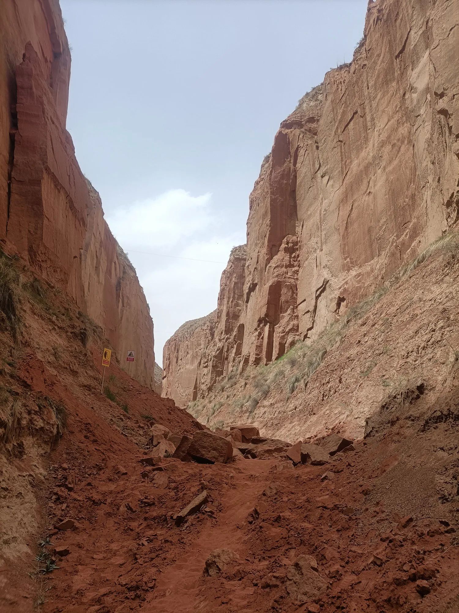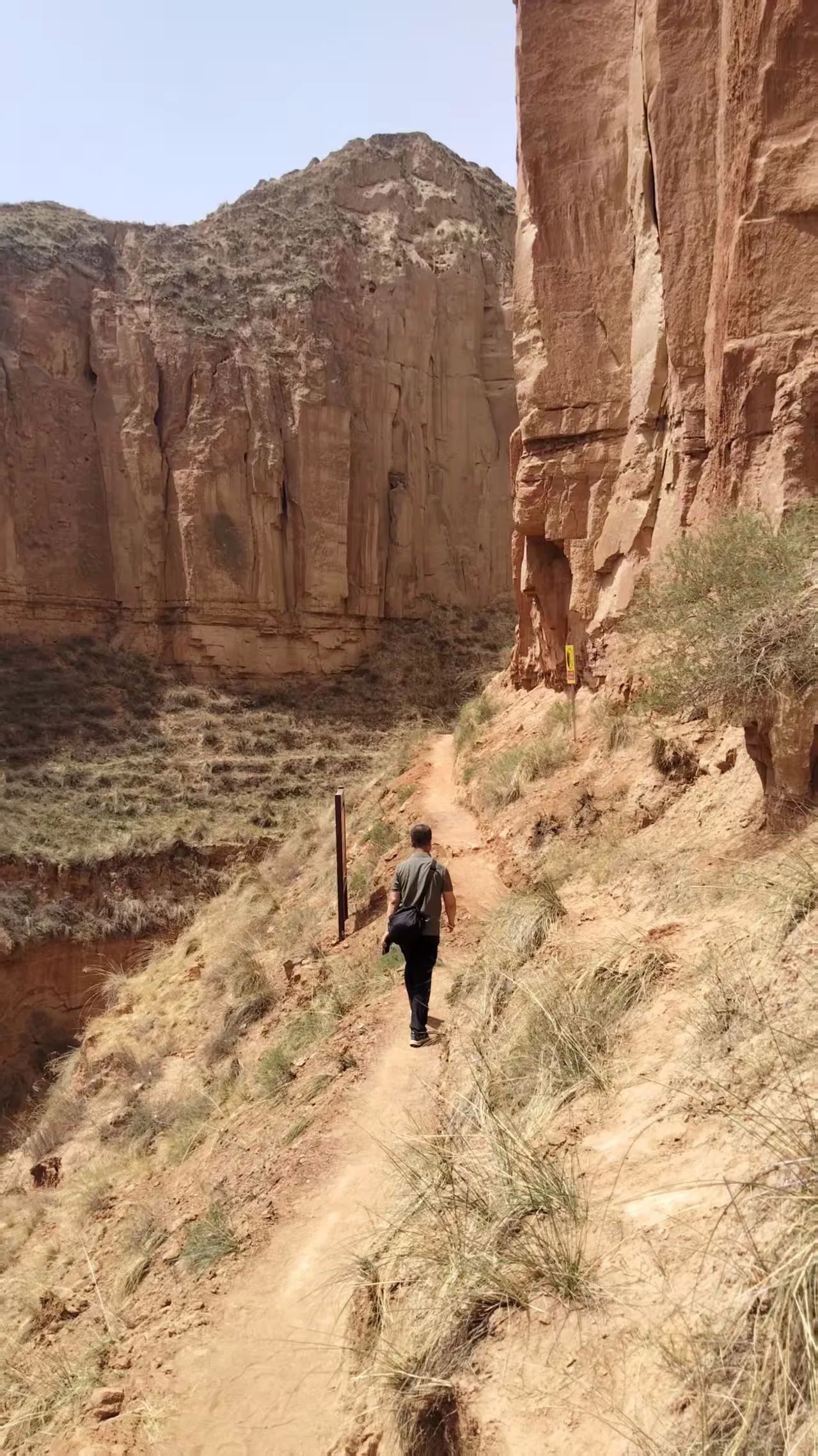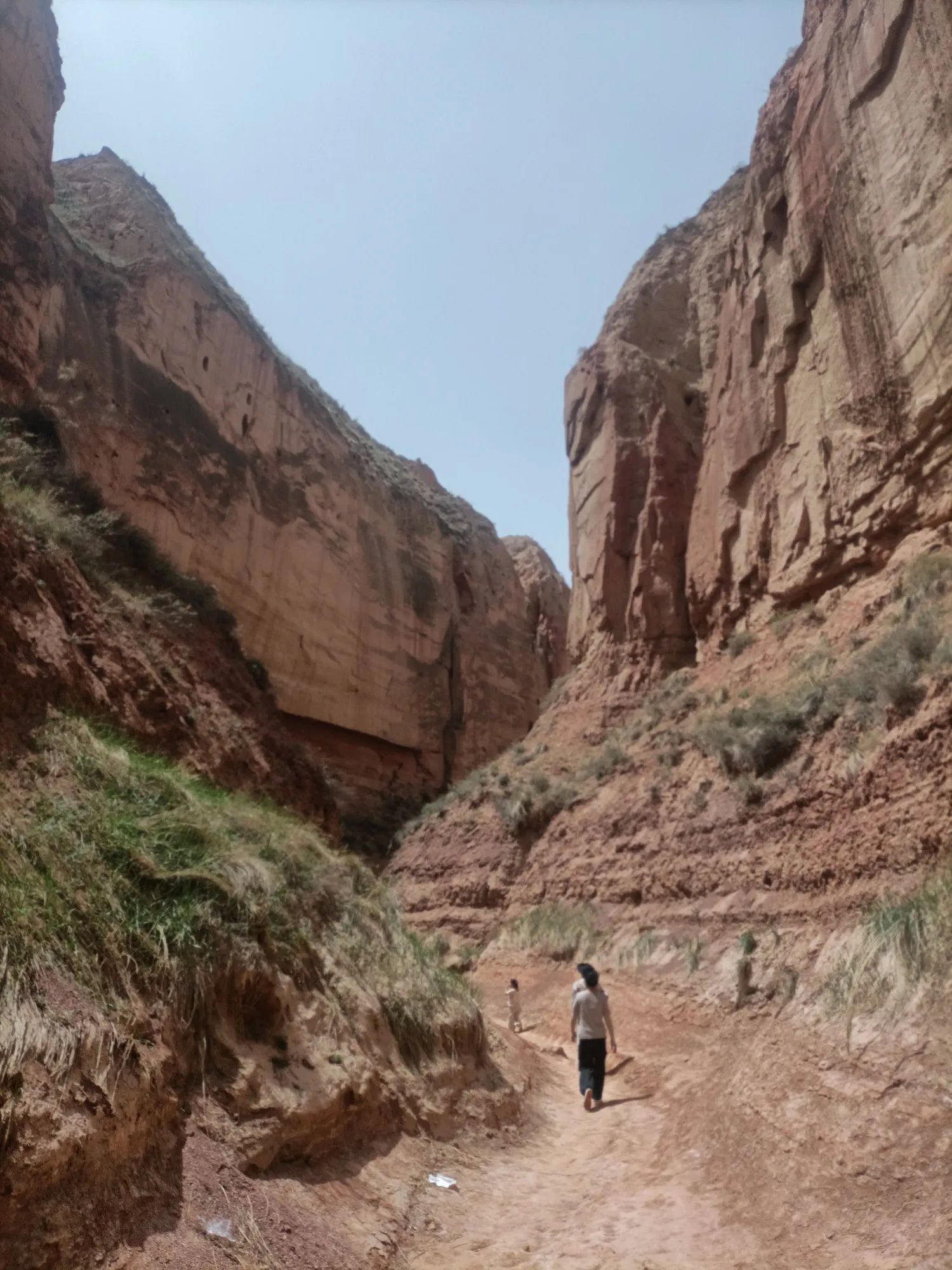 在峡谷沟底,道路平坦,两边峭壁如刀削耸立,黄土特征和丹霞地貌有机结合,原始的生态环境,大自然的鬼斧神工,让你惊叹,感觉人类在这峡谷里很渺小。