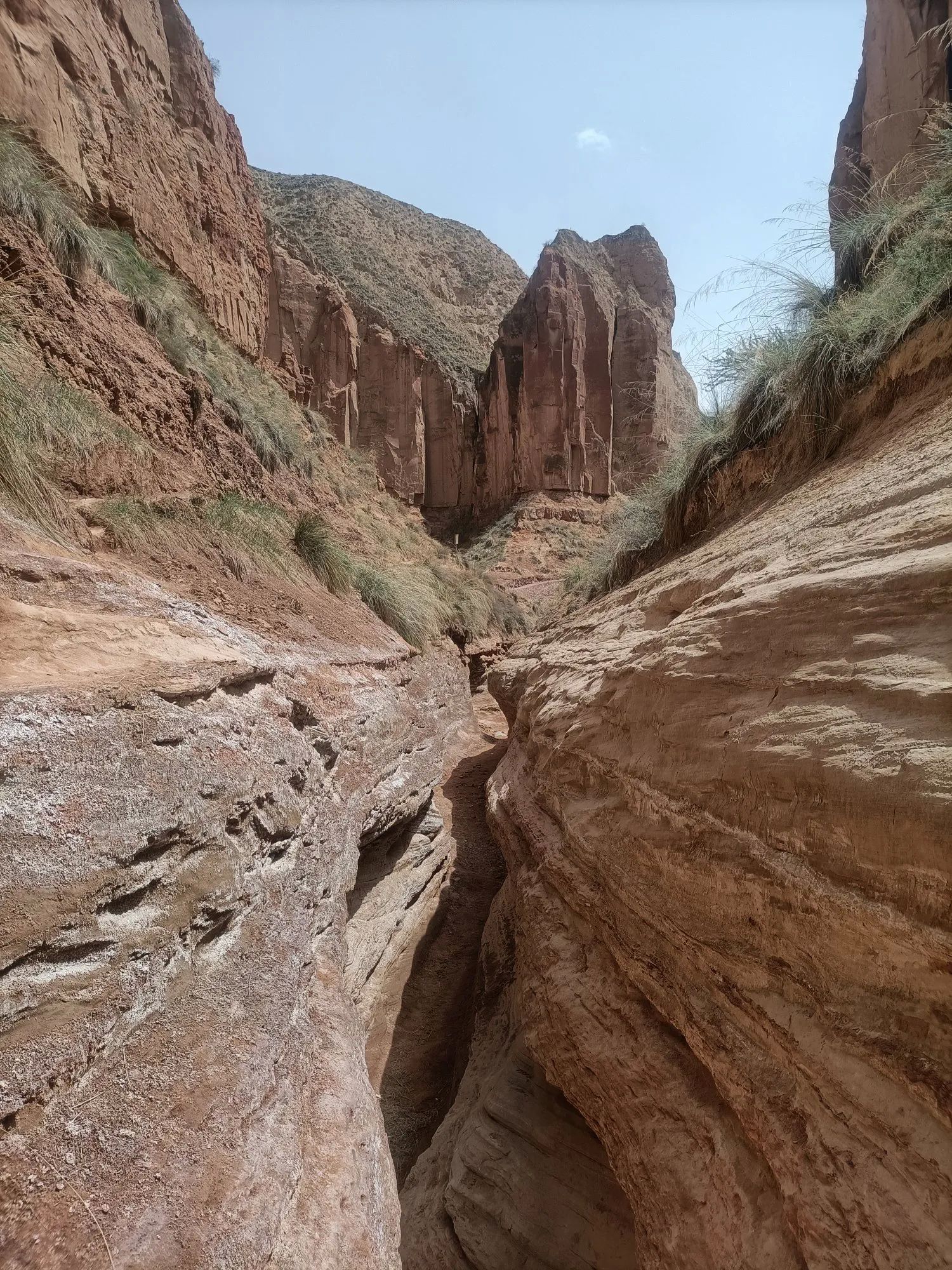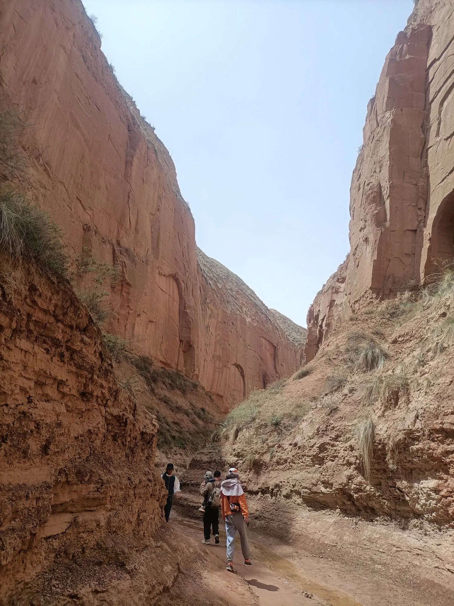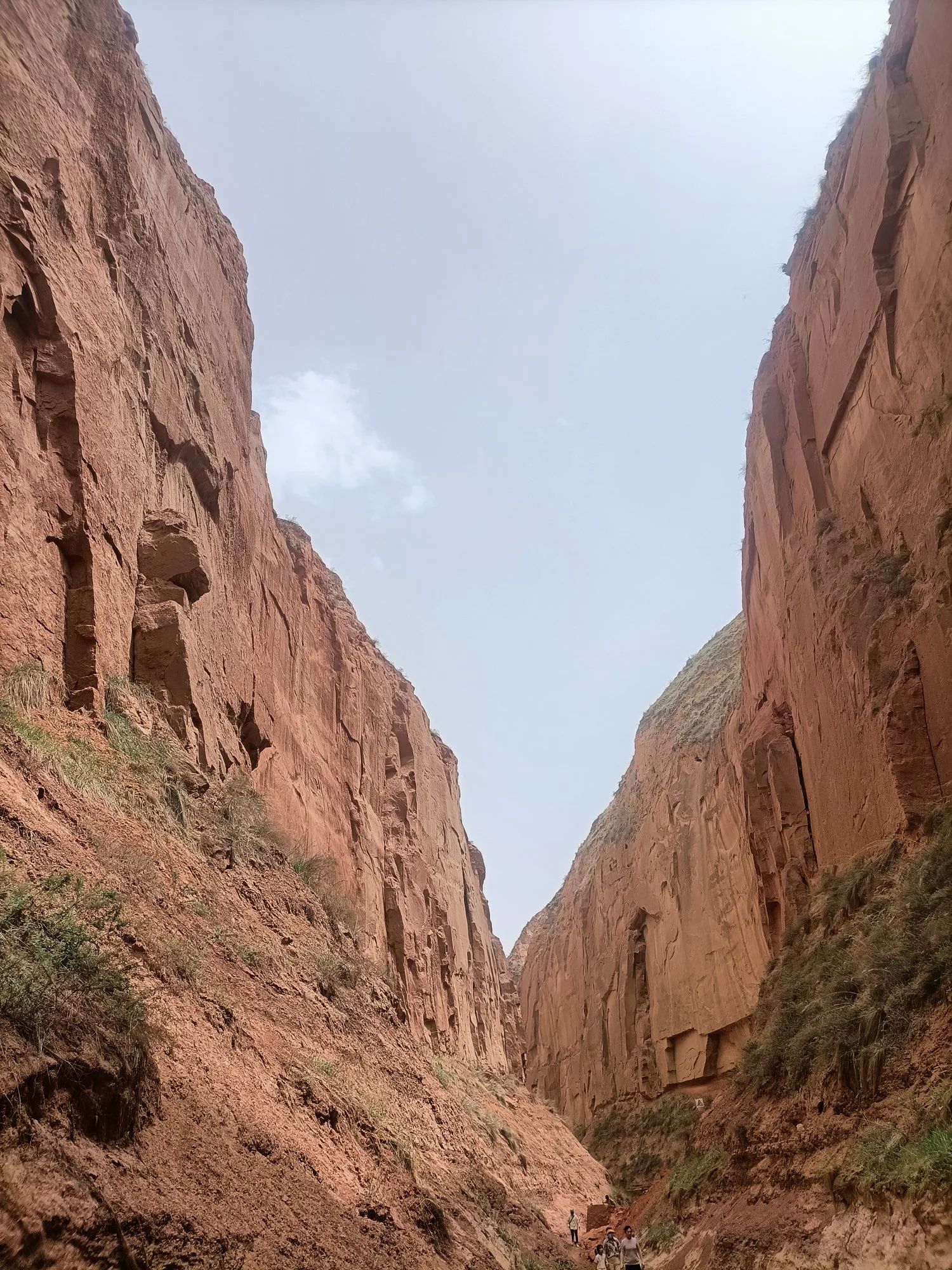 在峡谷沟底,道路平坦,两边峭壁如刀削耸立,黄土特征和丹霞地貌有机结合,原始的生态环境,大自然的鬼斧神工,让你惊叹,感觉人类在这峡谷里很渺小。