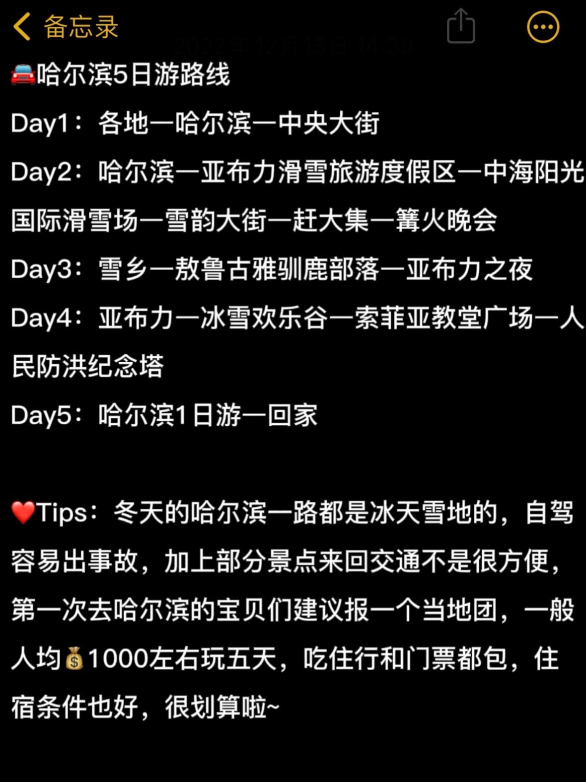 Tips:冬天的哈尔滨一路都是冰天雪地的,自驾容易出事故,加上部分景点来回交通不是很方便,第一次去哈尔滨的宝贝们建议报一个当地团,一般人均1000左右玩五天,吃住行和门票都包,住宿条件也好,很划算啦~