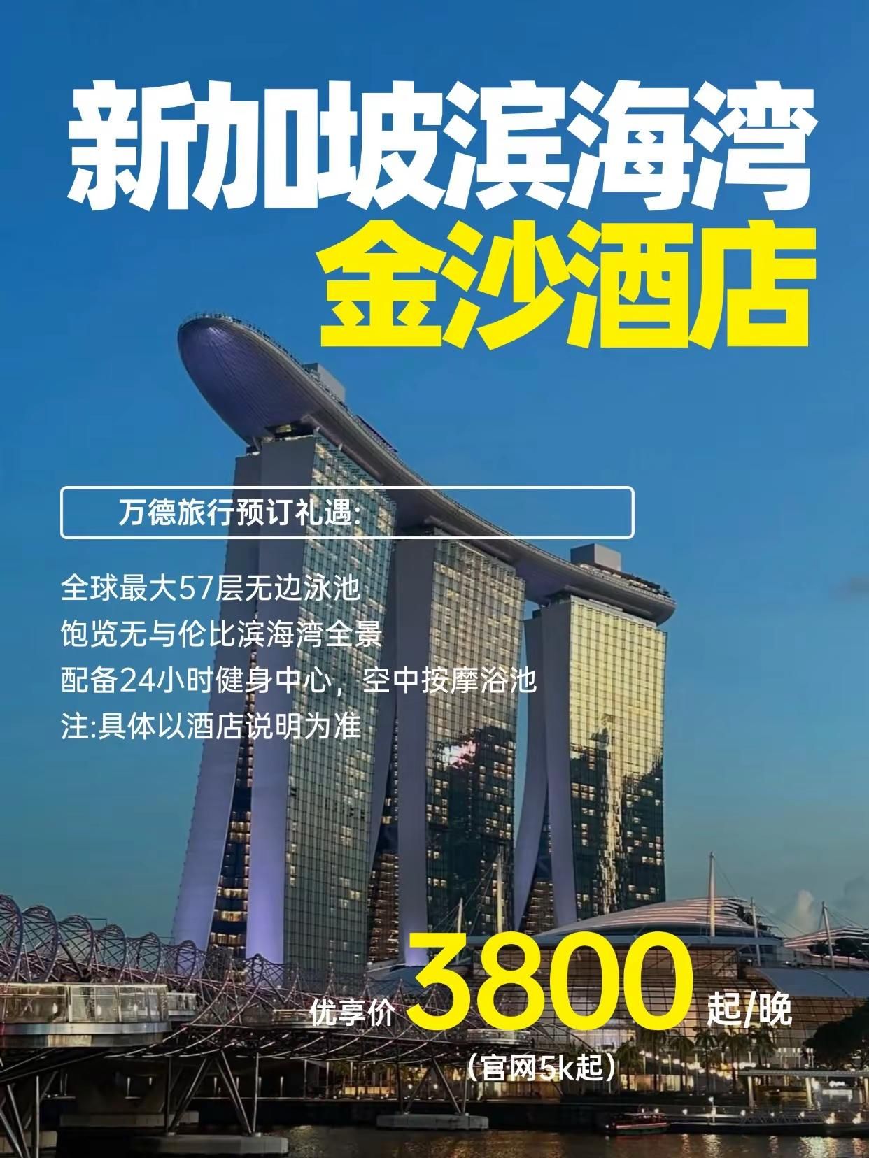 新加坡金沙酒店|一生一定要住的人生酒店 作为全球知名地标,新加坡地标性建筑,连三栋塔楼+巨型空中花园设计,新加坡的这家酒店被列为很多人一生一定要住的人生酒店。酒店就在滨海湾,景点很集中,鱼尾狮公园,摩天轮,滨海湾花园等等都在这里!也是小伙伴们头一回去新加坡的不二之选!2500+间全智能客房赢麻了,基础房45㎡起跳,声控窗帘+全屋触屏控制,躺床一键切“睡眠模式”!N3套房270°环幕看滨海湾游轮,每日补满TWG茶包+胶囊咖啡。酒店拥有一个150米长的超大无边游泳池,酒吧,餐厅,展望台和水疗中心。 种植了250种树木和650种植物。单是在观景台可以同时容纳900人,而整个建筑能容纳3900多人。空中花园:位于三座塔楼顶部的空中花园(Sands SkyPark)是酒店的点睛之笔,面积达1.2公顷(12000平方米),足以容纳4架A380大型客机。空中花园内设有餐厅、酒吧、咖啡馆、250棵绿植,以及总长150米的无边泳池和360度全视角观景台。连接三栋建筑的通道为购物区,品牌驻店齐全,包括新加坡本地精品如Charles & Keith、Pedro和TWG tea等。#新加坡酒店 #新加坡金沙酒店 #新加坡无边泳池 #新加坡旅游 #万德旅行