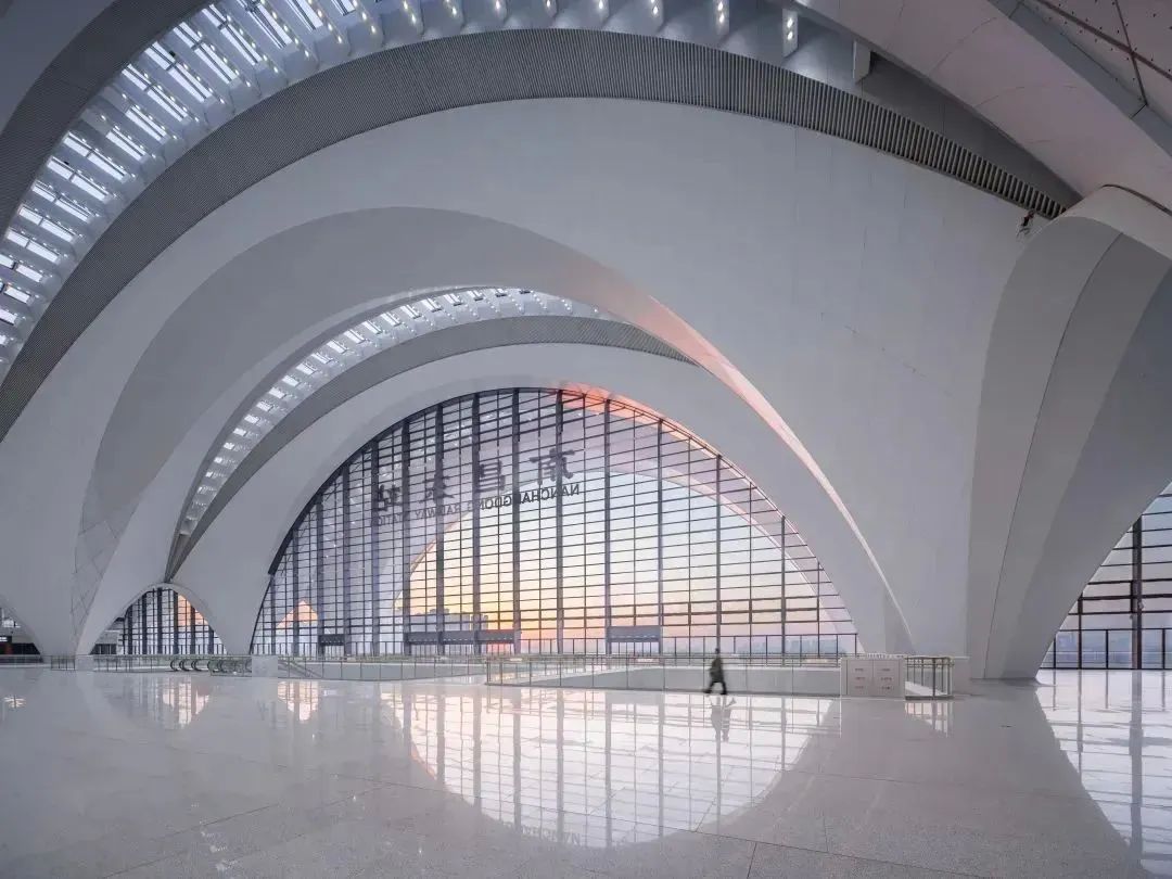 南昌东站站房造型由一系列动感十足的连续拱形有机组合而成,以“霞鹜齐飞,瑞祥绽放”为设计理念。结构主体以花瓣为造型,比拟盛放的南昌市市花金边瑞香,水平舒展的屋面波澜起伏、层层叠叠,描绘出起伏的浪花飞跨赣江的桥梁画面。既有淡雅脱俗的气韵,又有优美绰约的风姿,与南昌“襟三江而带五湖”的城市风貌相得益彰。