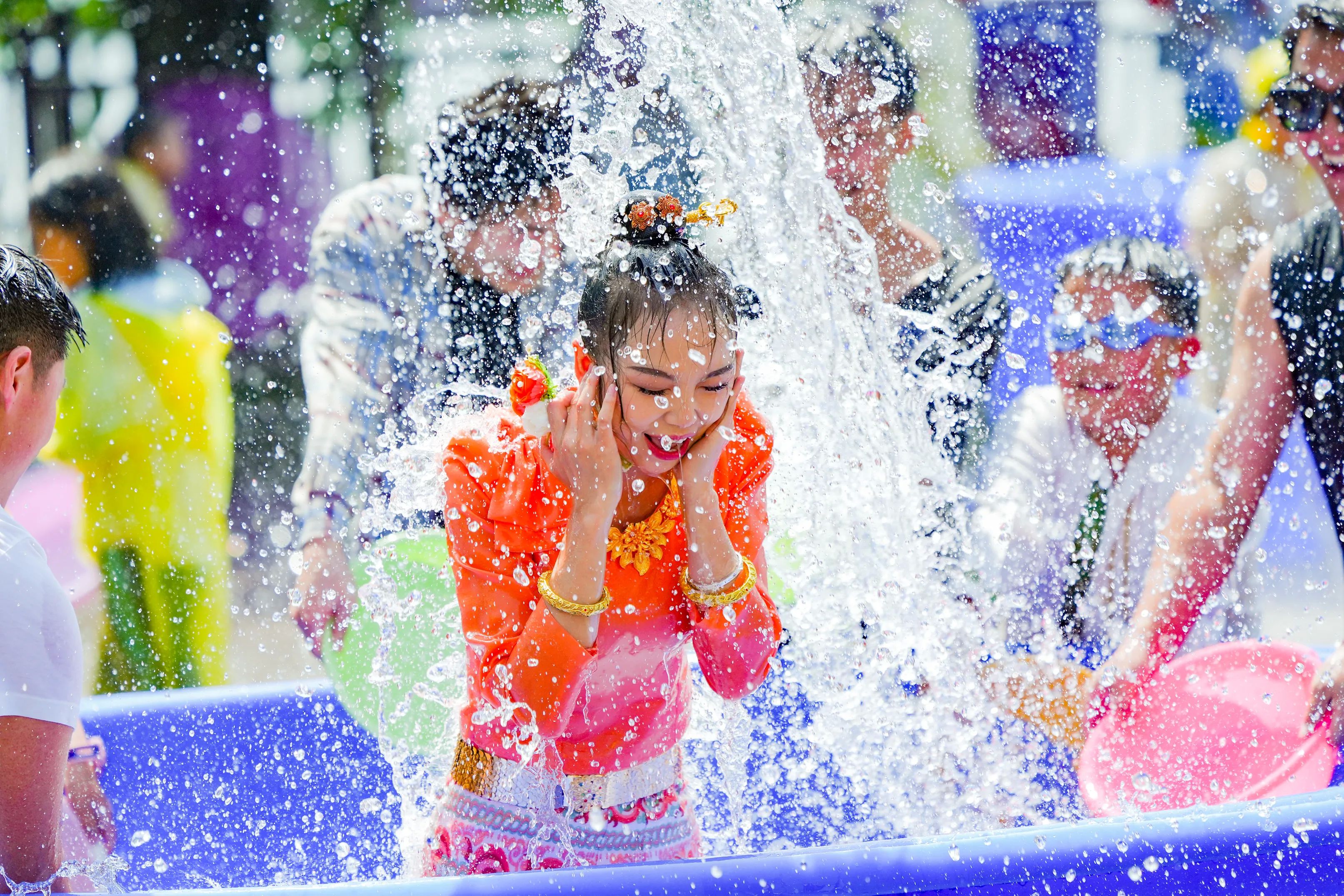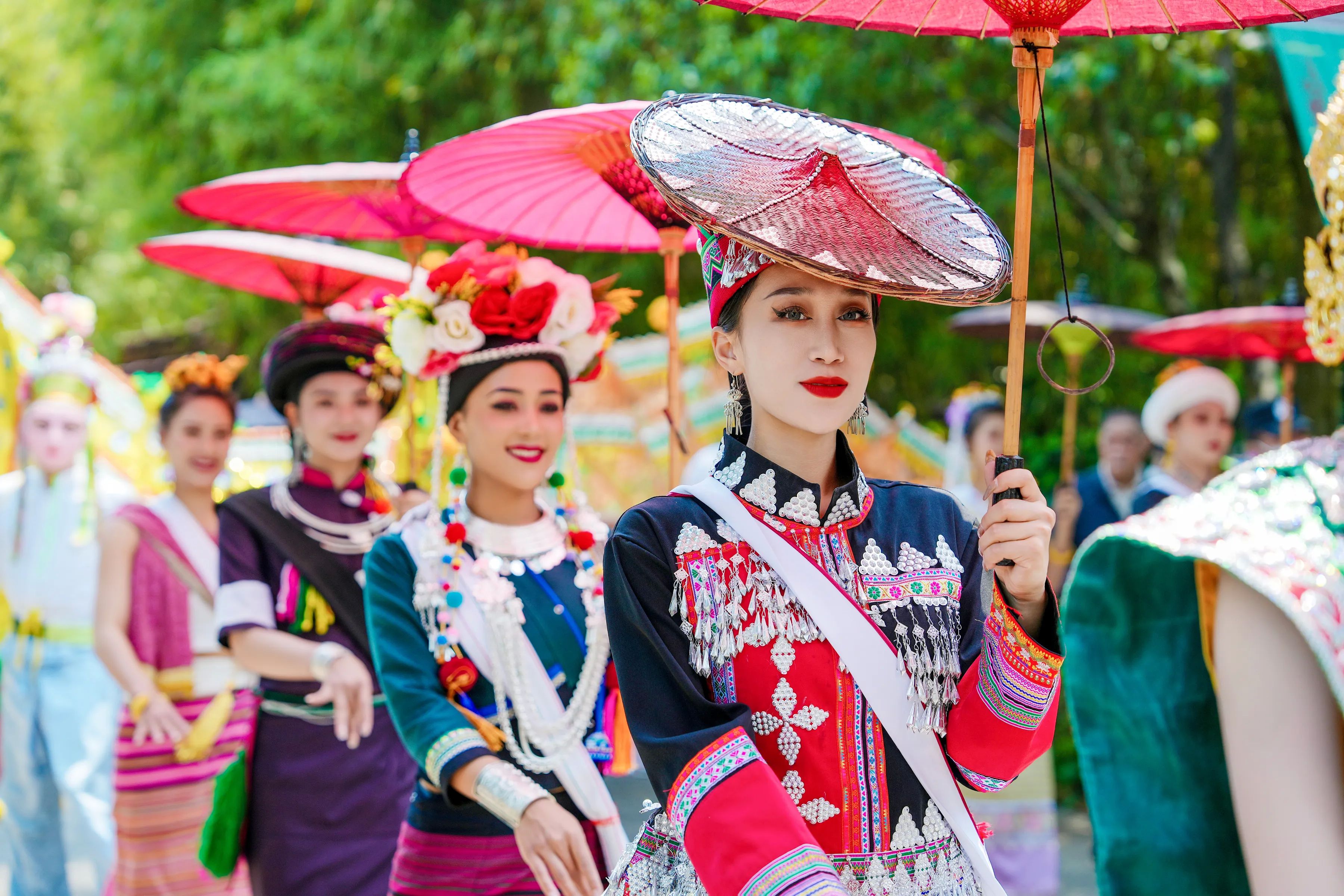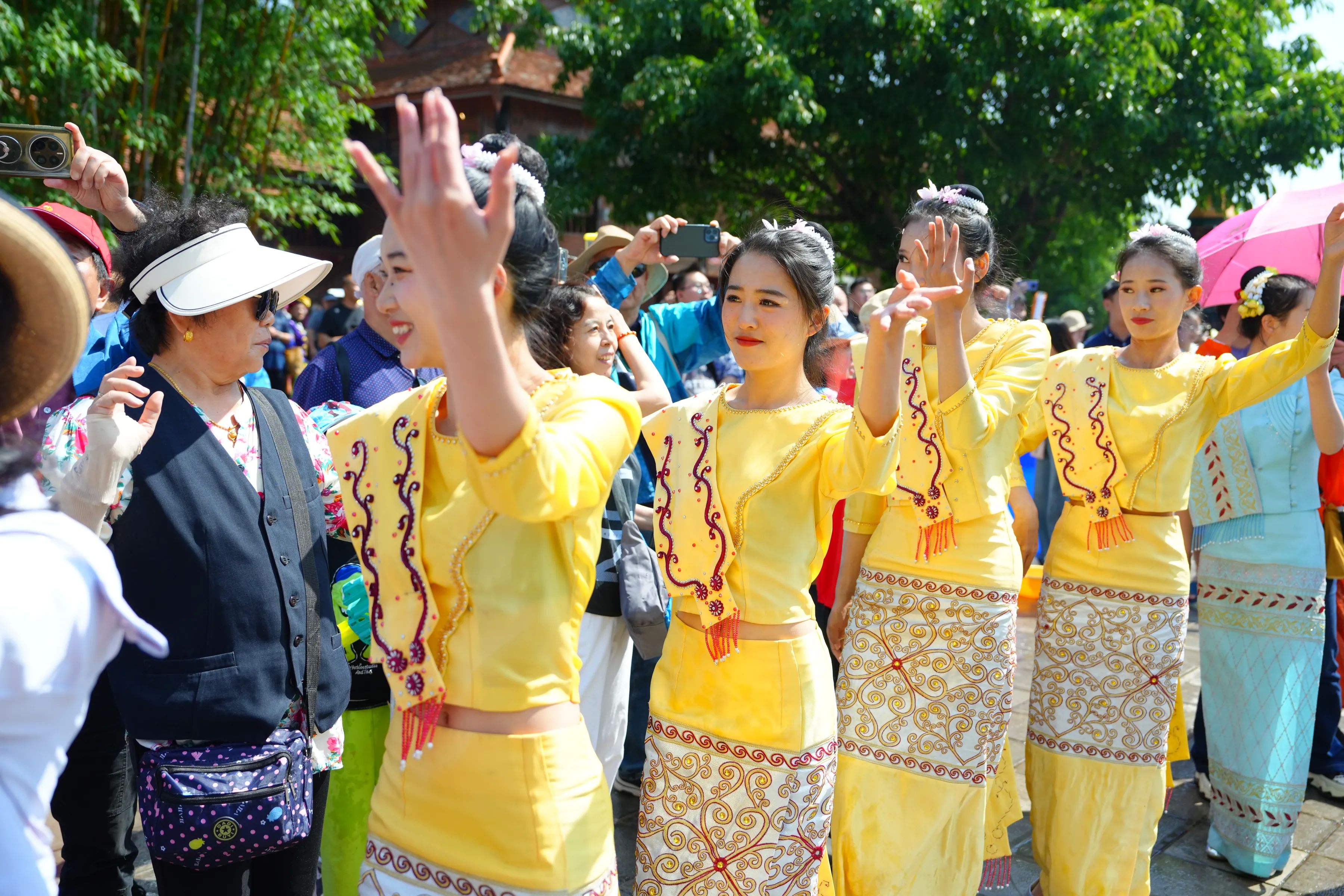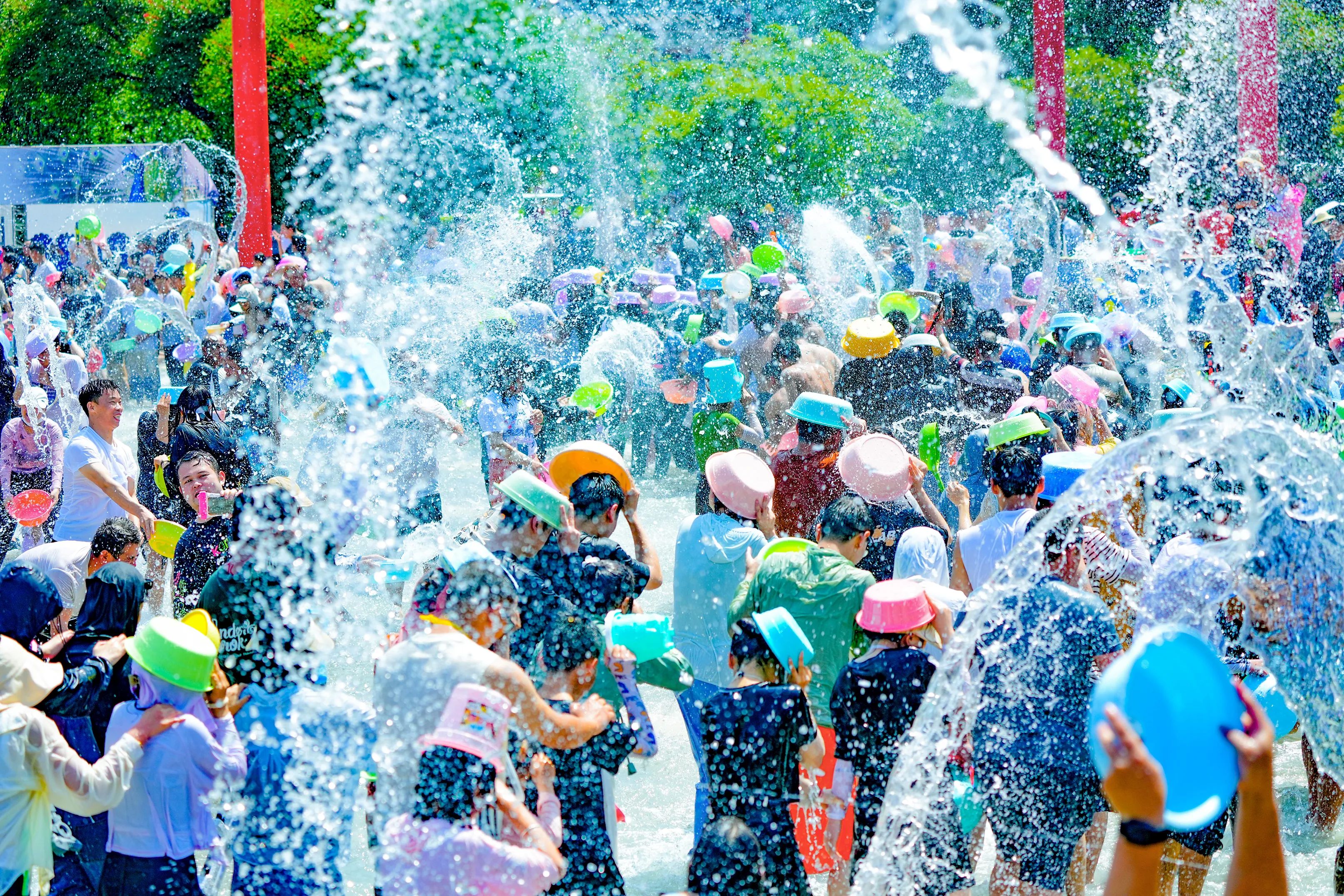 泼水节期间,云南民族村将以“猫哆哩”(傣语“小伙”)、“哨哆哩”(傣语“姑娘”)的迎宾洒水礼拉开狂欢序幕。游客可参与水枪、水桶、水盆齐上阵的泼水大战,感受“湿身”祝福。此外,景区还将推出傣族特色美食市集,泡鲁达、竹筒饭、香茅烤鱼、烤五花等地道风味为游客补充“战斗力”。