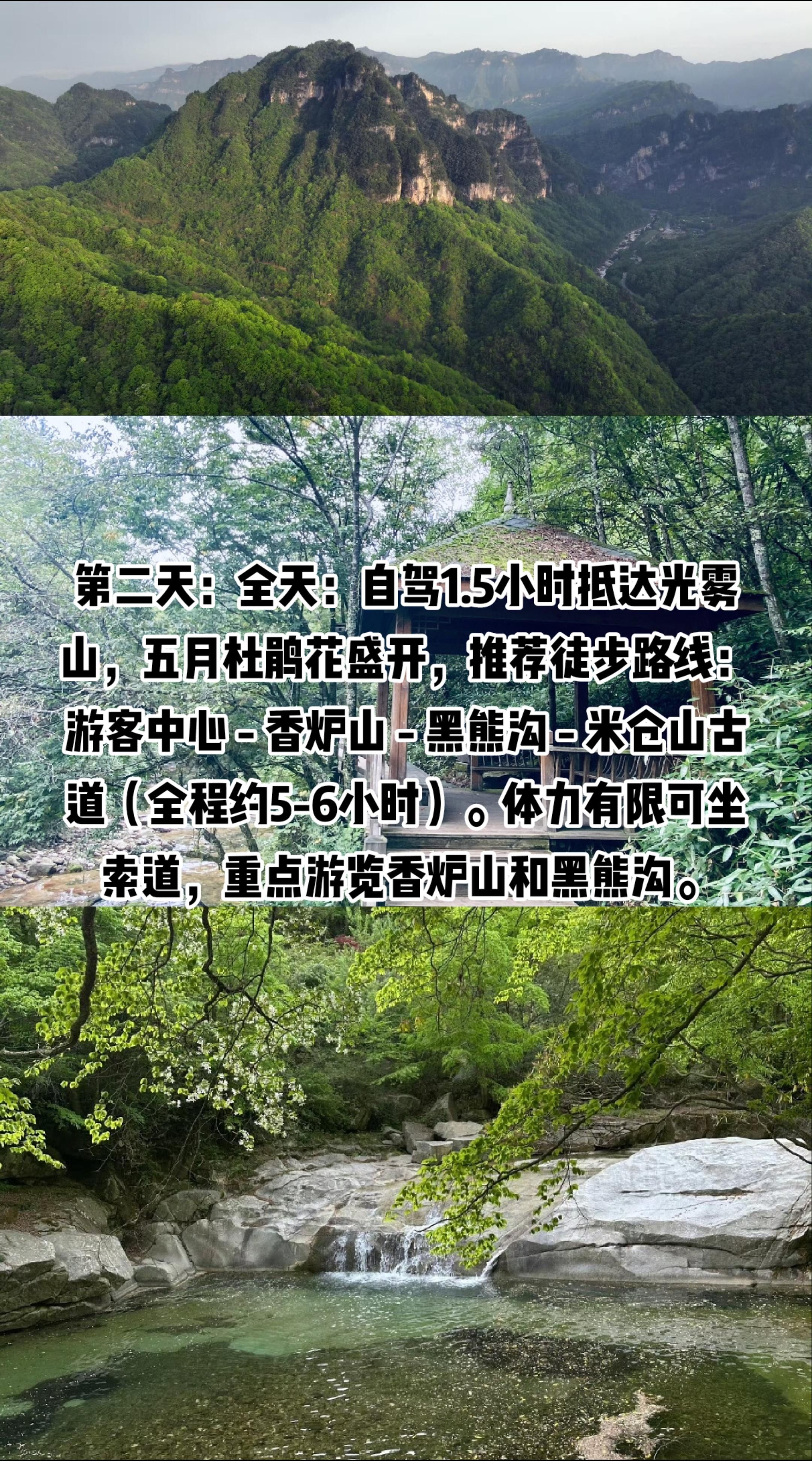 • 全天:自驾前往光雾山(1.5小时车程),这里有奇峰怪石、云海日出,五月杜鹃花盛开。推荐路线:游客中心-香炉山-黑熊沟-米仓山古道,全程徒步5-6小时,记得带干粮和水。体力有限可坐索道,重点看香炉山和黑熊沟,风景绝美!