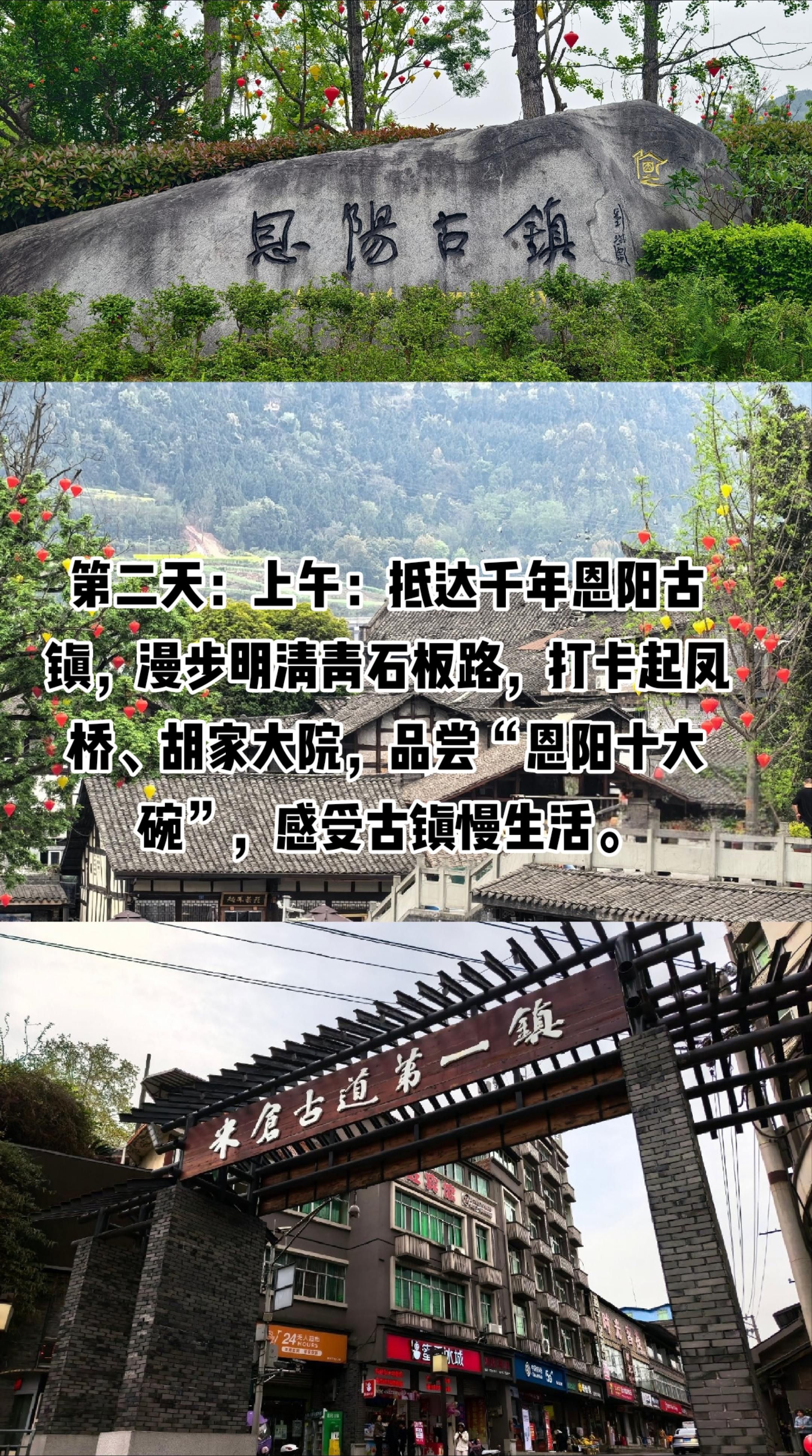 • 上午:自驾到恩阳古镇,30分钟车程就能抵达这座千年古镇。漫步明清青石板街道,打卡起凤桥、胡家大院,还有河畔吊脚楼群。别忘了尝尝“恩阳十大碗”,古镇入口的“老街十大碗”超正!