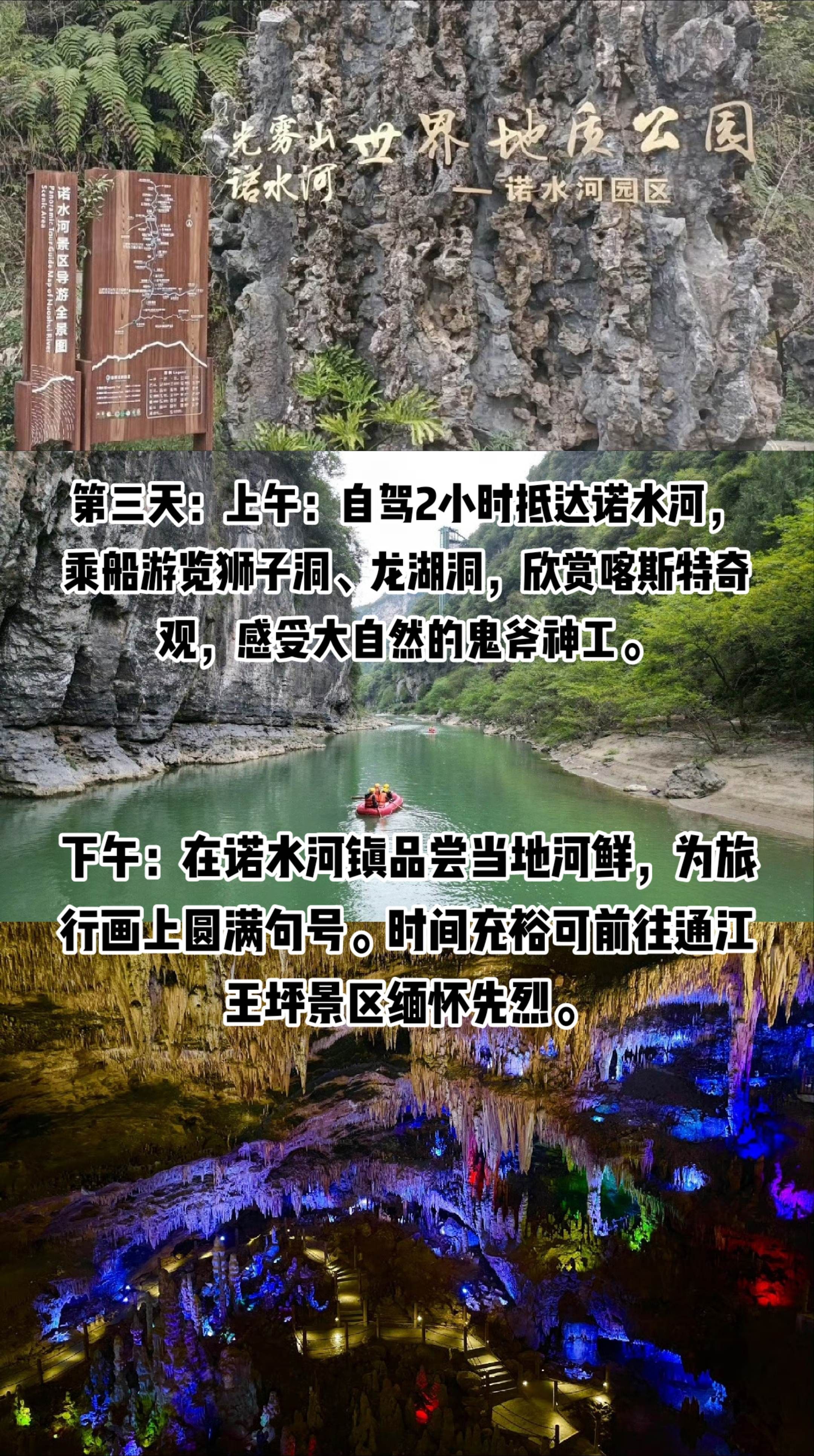 • 上午:自驾到诺水河景区(2小时车程),乘船游览狮子洞、龙湖洞等溶洞,看钟乳石、石瀑、地下河,喀斯特景观超震撼!
