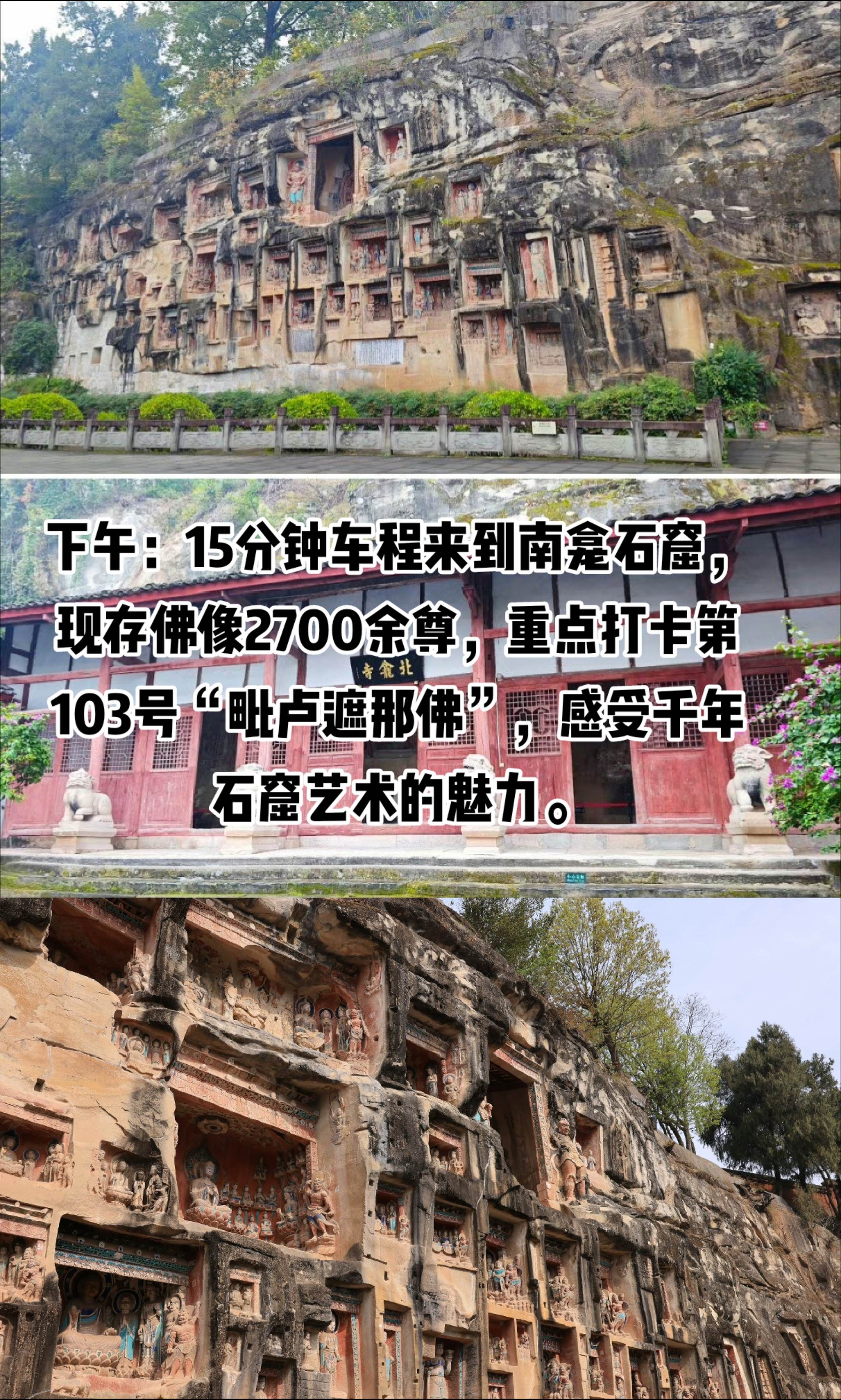 • 下午:返回巴中市区,参观南龛石窟,15分钟车程就能看到隋代始凿的石窟群,176龛、2700余尊佛像雕刻精美。重点看第103号龛“毗卢遮那佛”和第116号龛“释迦说法图”,每一尊佛像都仿佛在诉说着千年的故事。