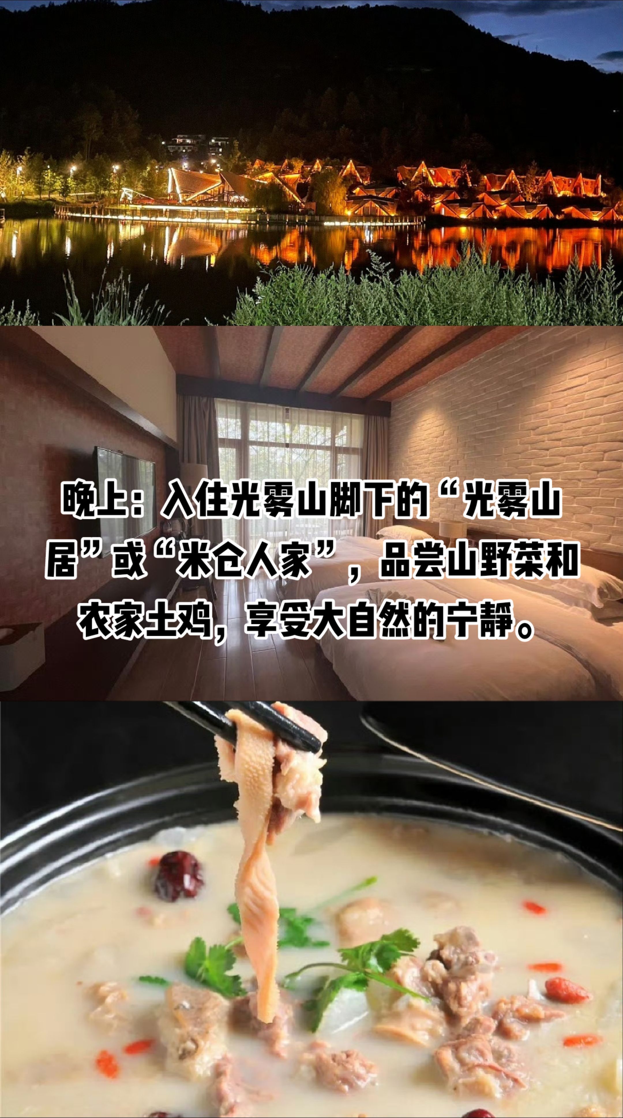 • 晚上:住在光雾山脚下的“光雾山居”或“米仓人家”民宿,品尝山野菜和农家土鸡,享受大自然的宁静。